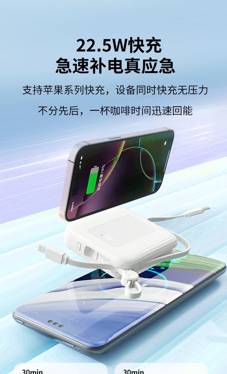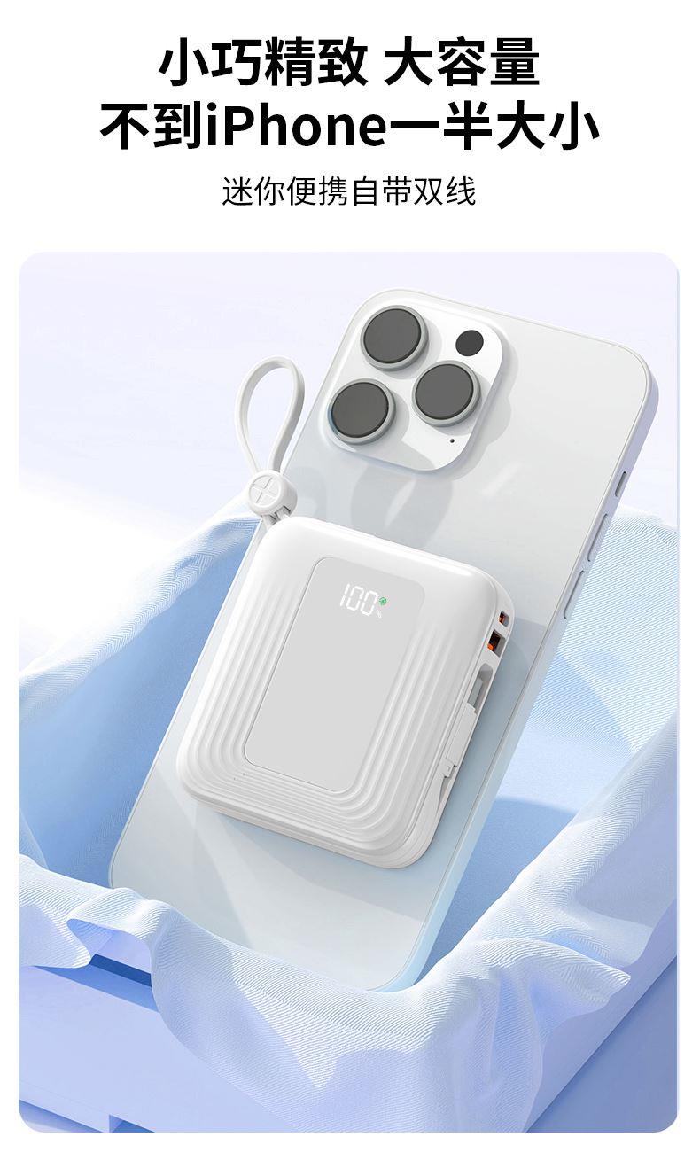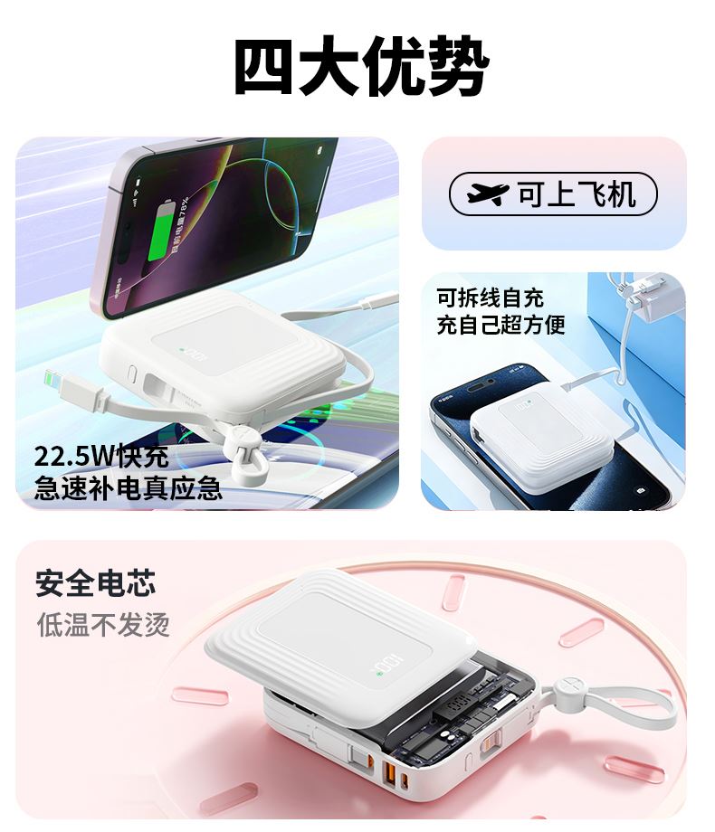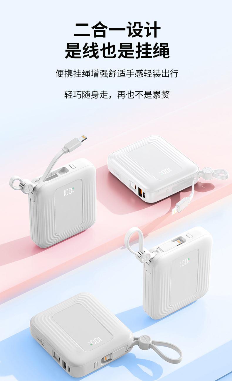 3C认证,质量保证。22.5W加PD20W超级快充.剩余电量显示,心里有底。高光喷漆工艺,手感圆润握感舒服,迷你小巧,只有手帕纸大小随身便携无负担。10000mAh大容量,PD超级快充。 自带挂绳线,无需带线一插即充,减少累赘,苹果/Type-C等两种接口选10000mAh大容量,PD超级快充。 多种颜色选择兼容多型号手机充电。