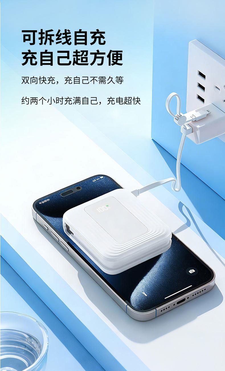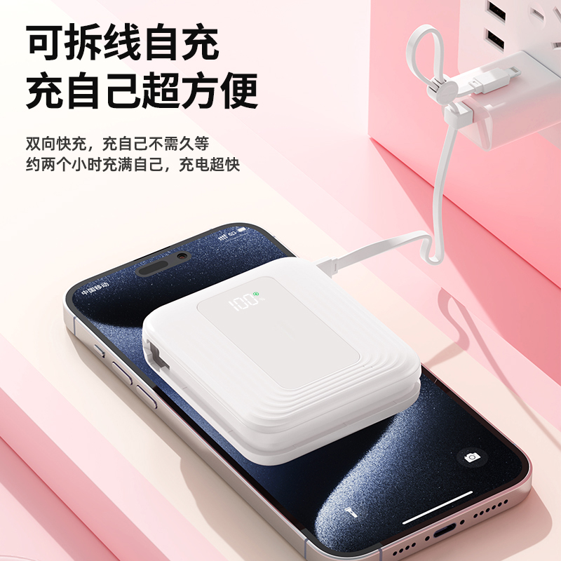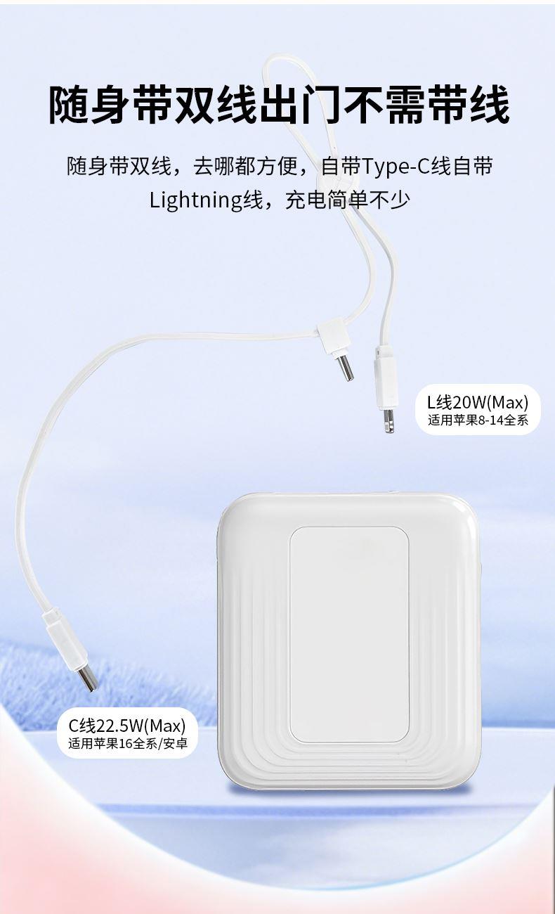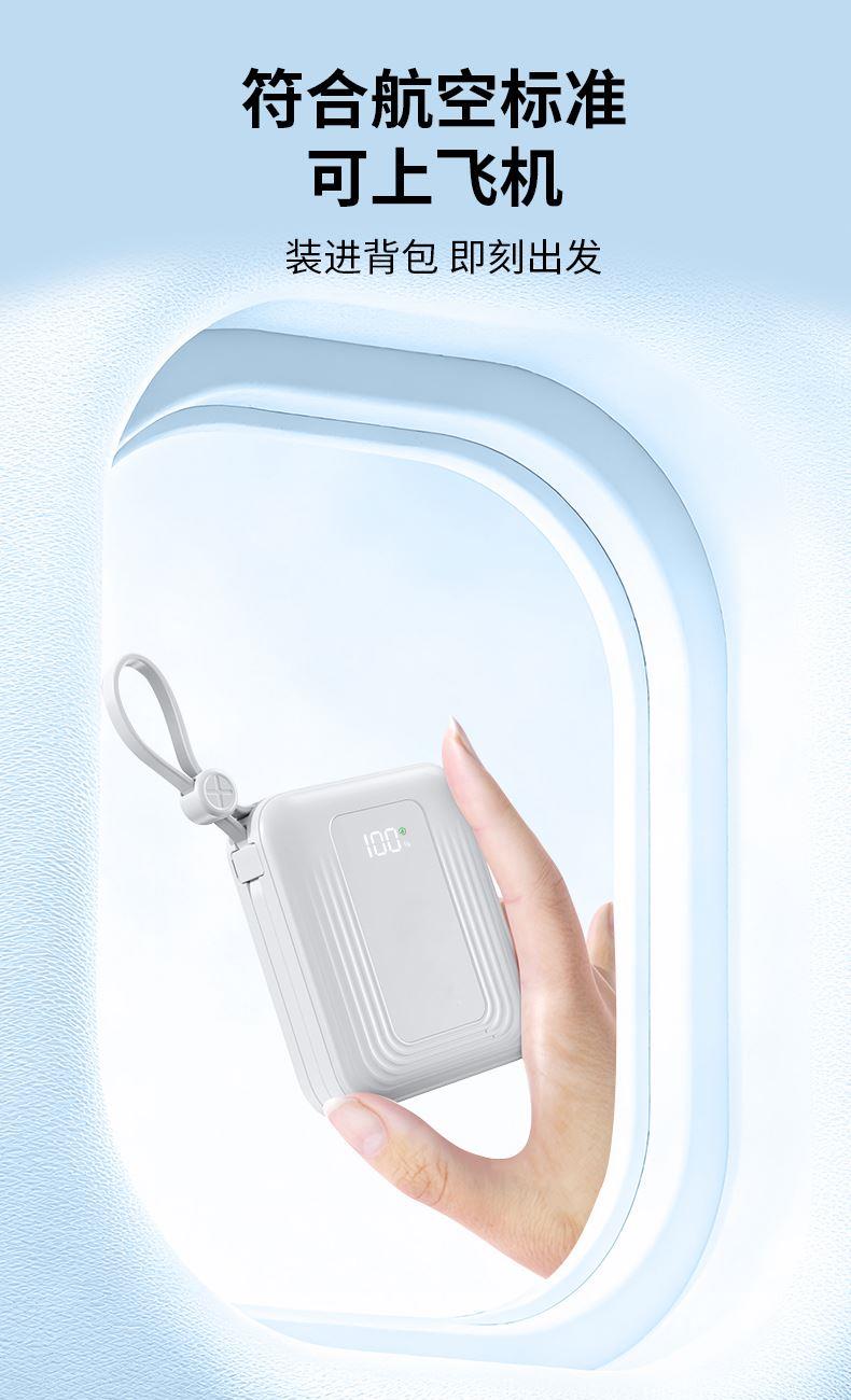 3C认证,质量保证。22.5W加PD20W超级快充.剩余电量显示,心里有底。高光喷漆工艺,手感圆润握感舒服,迷你小巧,只有手帕纸大小随身便携无负担。10000mAh大容量,PD超级快充。 自带挂绳线,无需带线一插即充,减少累赘,苹果/Type-C等两种接口选10000mAh大容量,PD超级快充。 多种颜色选择兼容多型号手机充电。