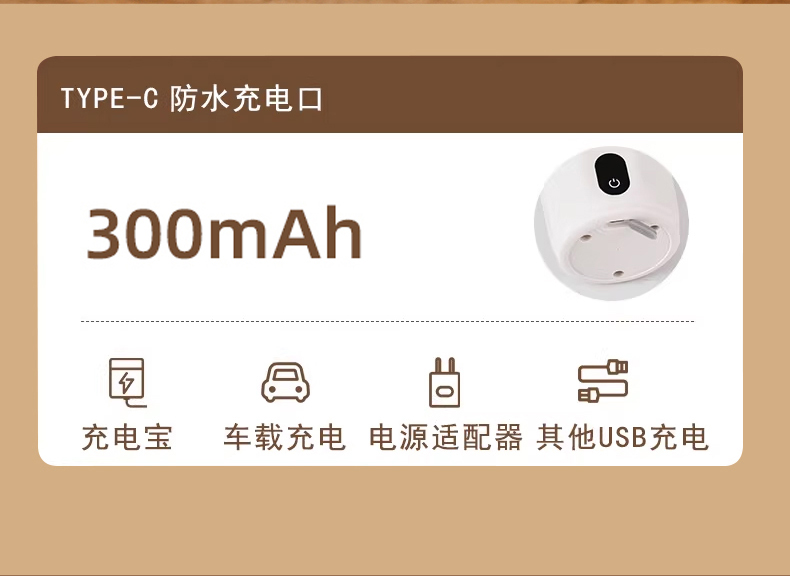 功率:0.15W 电压:5V/1A 容量:400mL 毛重:0.3Kg 材质:PP+316不锈钢+AS 彩盒包装尺寸:100*100*152mm 外箱包装尺寸:520*430*333mm 推荐理由: 1、AS安全材质,内胆316安全材质 2、Type-C充电接口,充电方便 3、高速磁力搅拌刀头,快速均匀搅拌 4、温度显示,不烫口