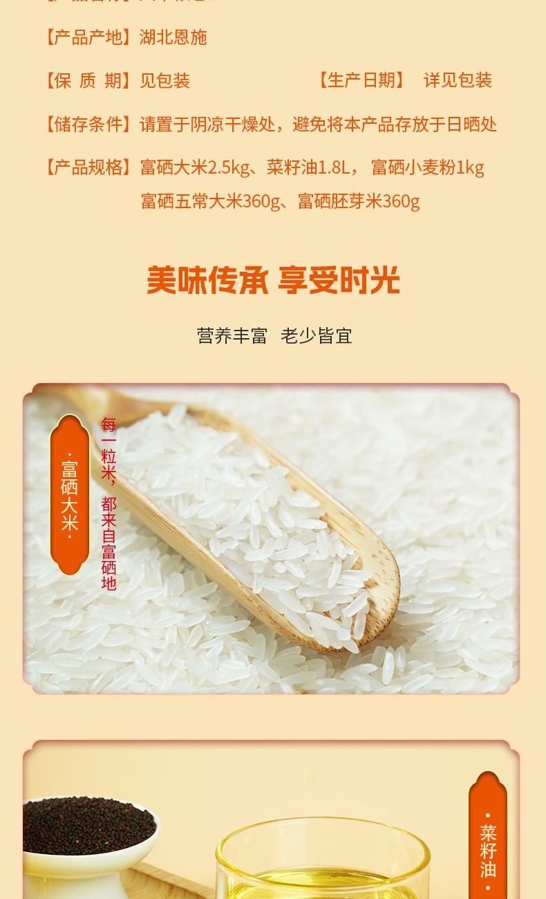 产品信息 品 名:天下粮仓D 规 格:富硒大米2.5kg、菜籽油1.8L, 富硒小麦粉1kg 富硒五常大米360g、富硒胚芽米360g 包 装:长38cm宽17.5cm高30cm 产品特色 1、富有机硒认证,每100g平均硒含量≥20ug。更易被人体利用吸收 2、菜籽油油品透亮、香味浓郁,含有丰富的维生素E以及油酸、亚油酸、亚麻酸等; 3、正宗五常大米,稻花香二号 3、精美礼盒,送礼佳品。