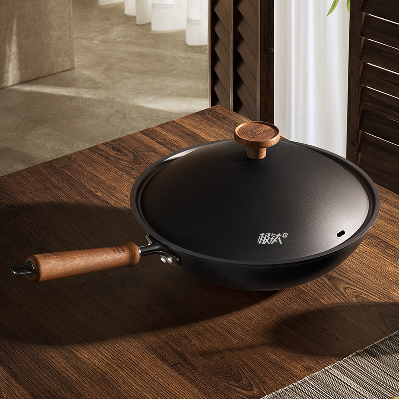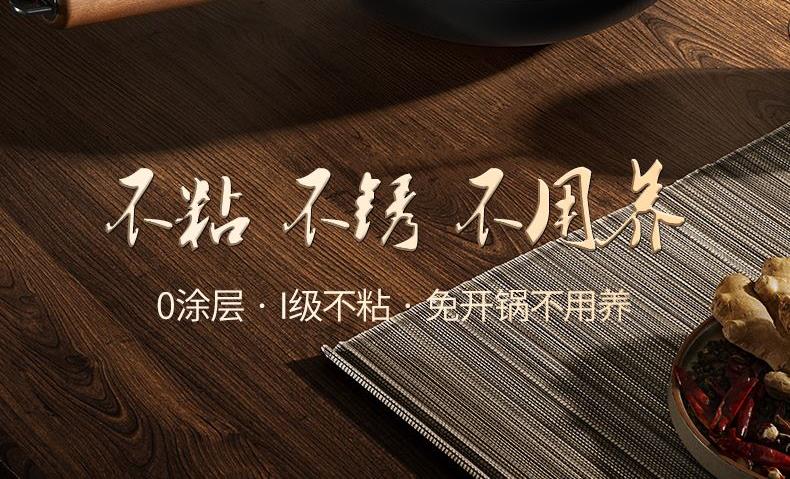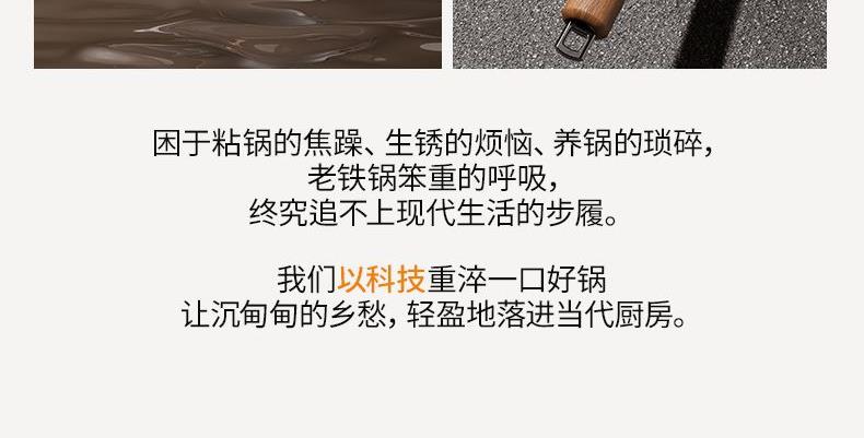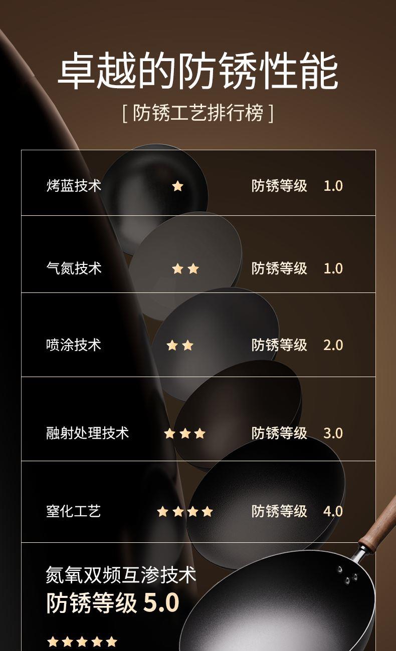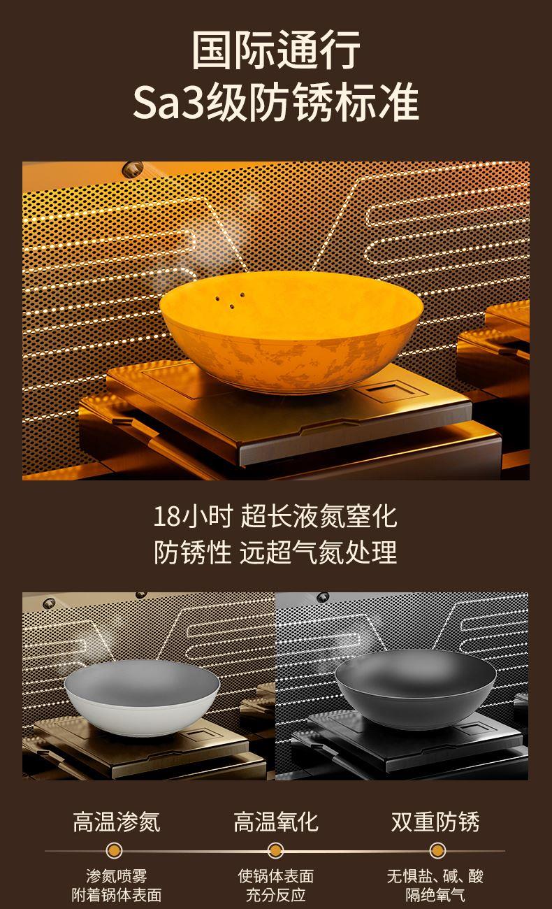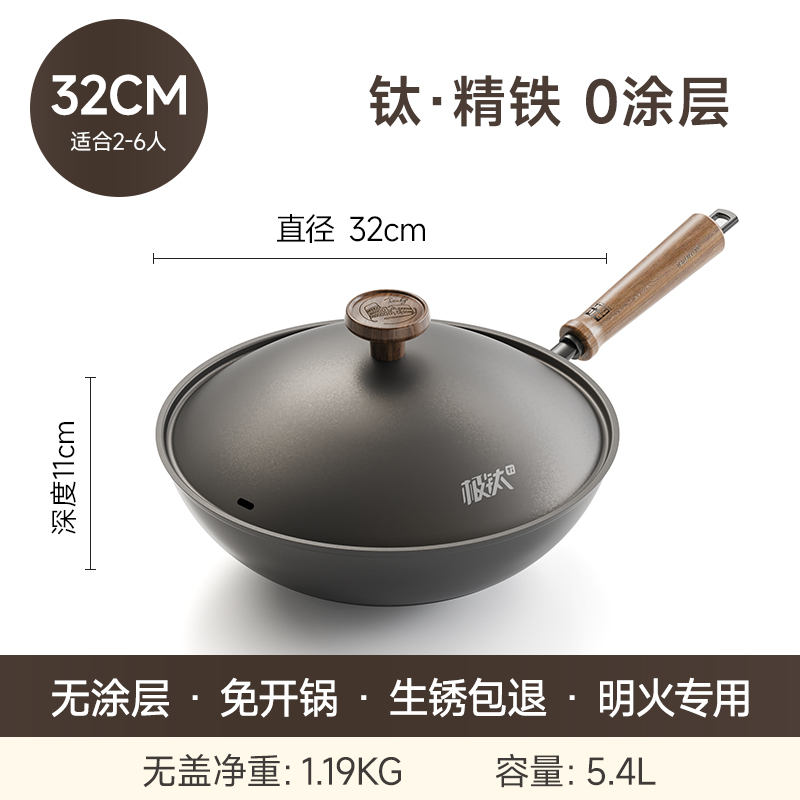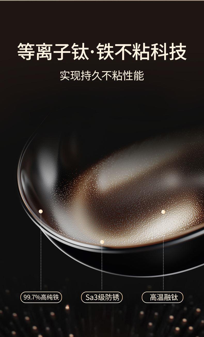 产品规格:32cm 产品货号:2301080432 彩盒尺寸:400*375*142mm 1、等离子钛熔覆,”0”涂层,国标1级不粘 2、精选优质钢材,含铁量达到99.6%,高纯铁更健康 3、高温窒化氮化工艺,不生锈 4、专属晶螺纹锅底,防滑耐磨 5、高拱铁盖设计,蒸汽回流,保温锁鲜 6、人体力学手柄,握感舒适,隔热防烫 7、明火灶具使用