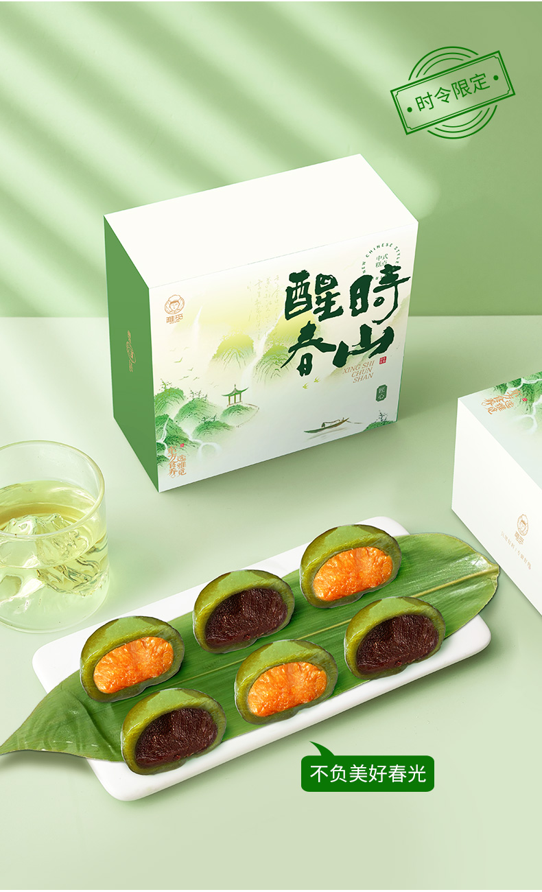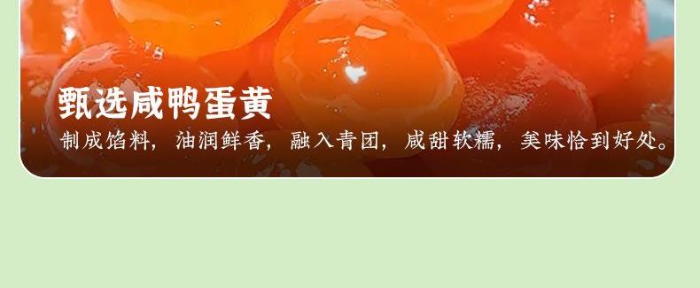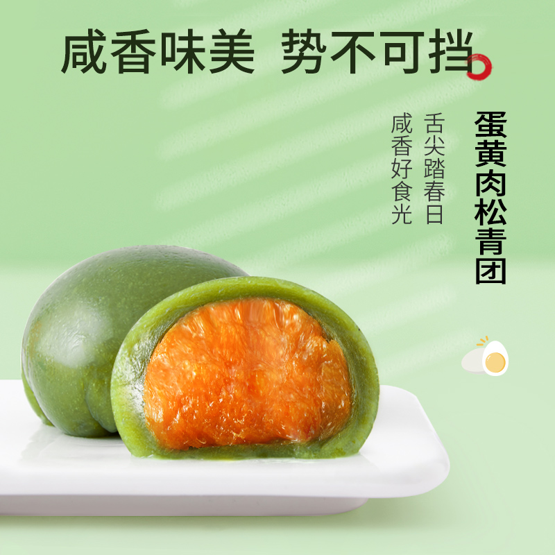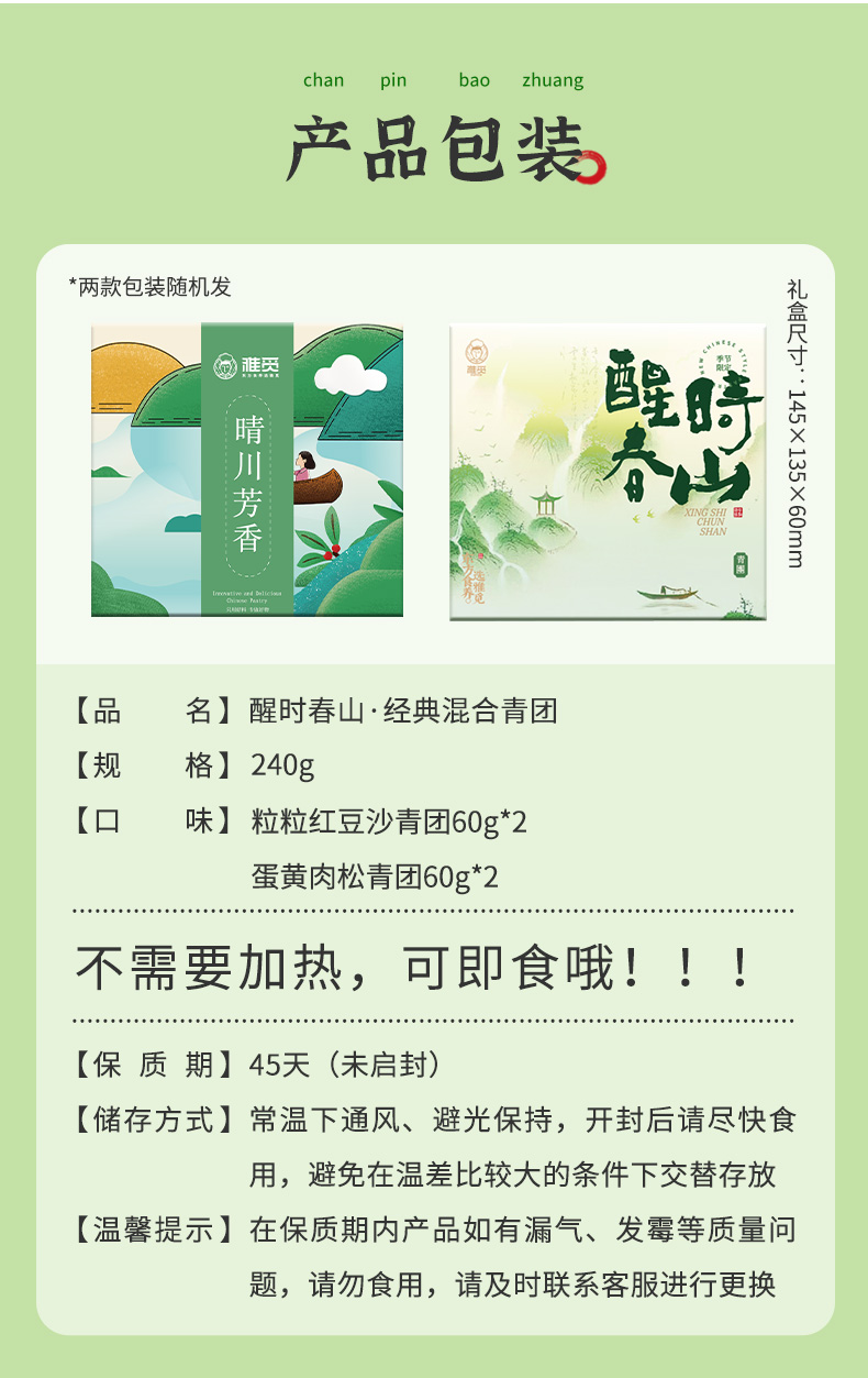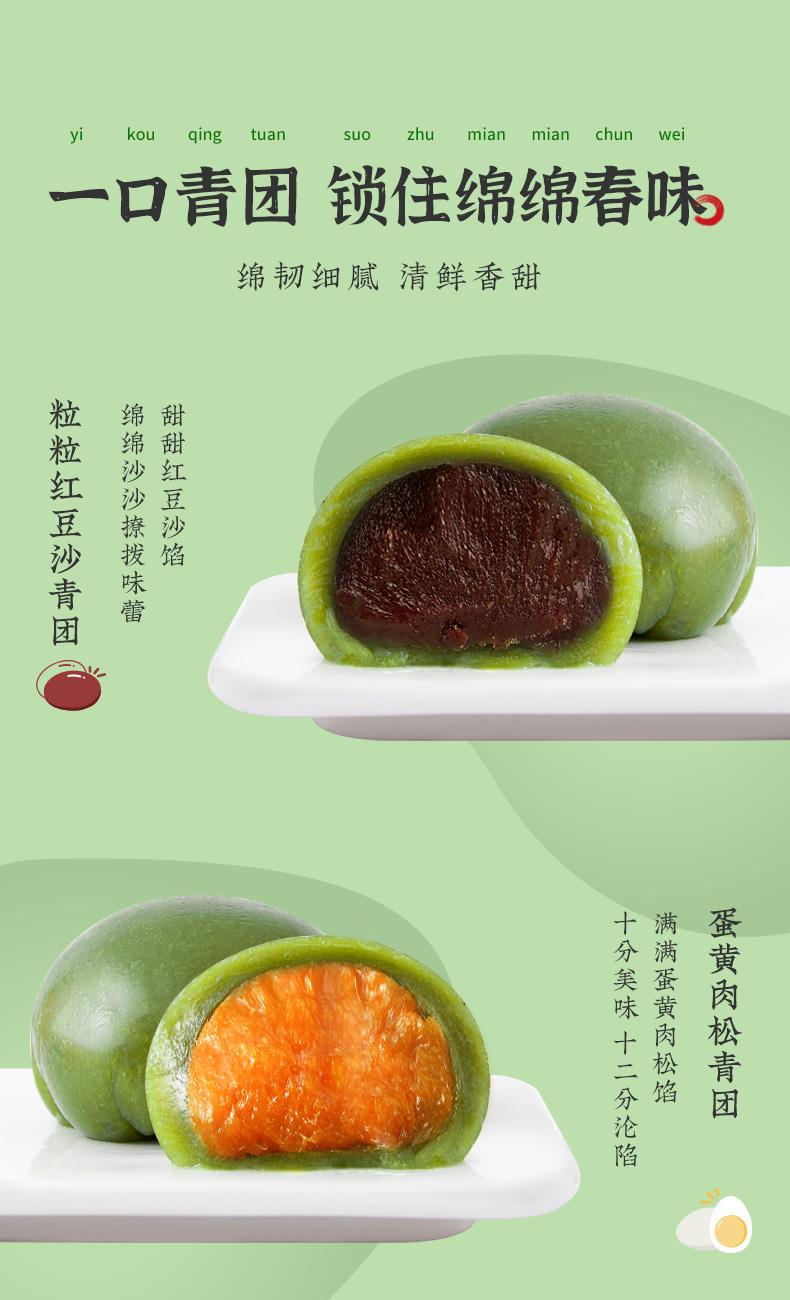 保质期:45天 产品明细: 蛋黄肉松青团60g*2 粒粒红豆沙青团60g*2 产品介绍: 经典江南味,四时风物,应季而食 1.优选糯米,捶打后口感Q弹软糯,品之细腻,自然回甘,将艾草的清香与谷物香甜融合在一起,原滋原味 2.双拼口味甜咸具备,甄选海门大红袍赤豆,制为冰淇淋口感,入口绵密细滑,甜度适中的豆沙;如丝絮的肉松融入糕点之中,不油不腻,浓郁鲜美,咸甜适中,增添味蕾惊喜。 3.手工制作,不添加防腐剂,新鲜短保,食用更放心