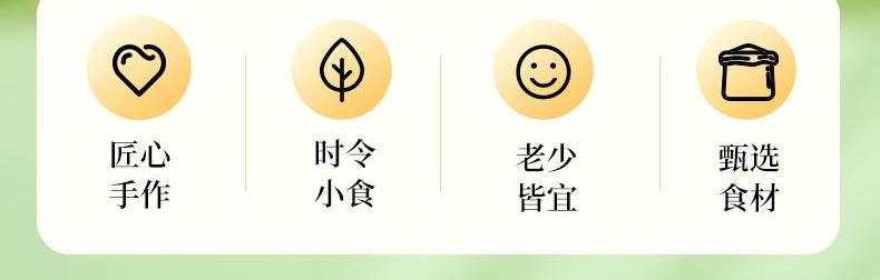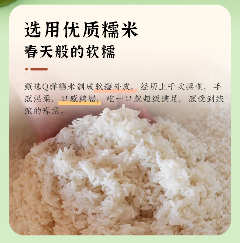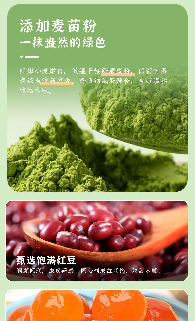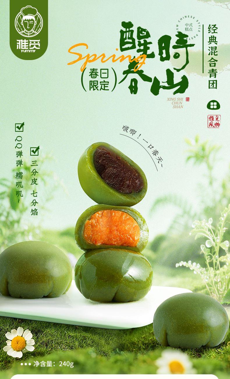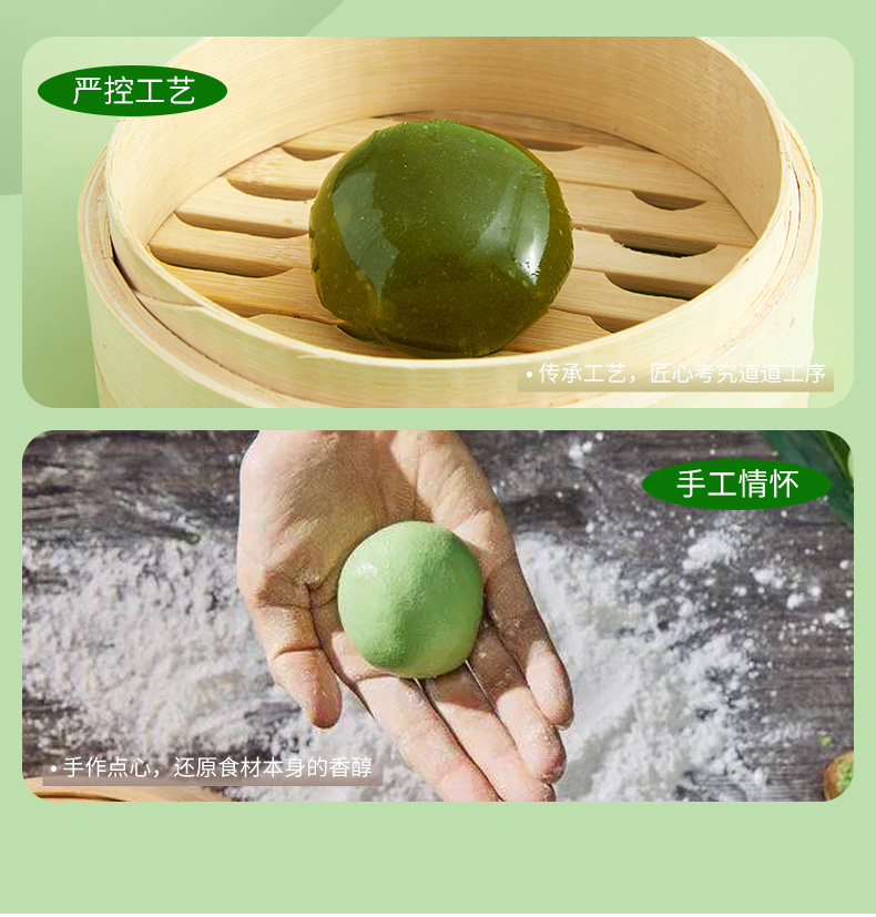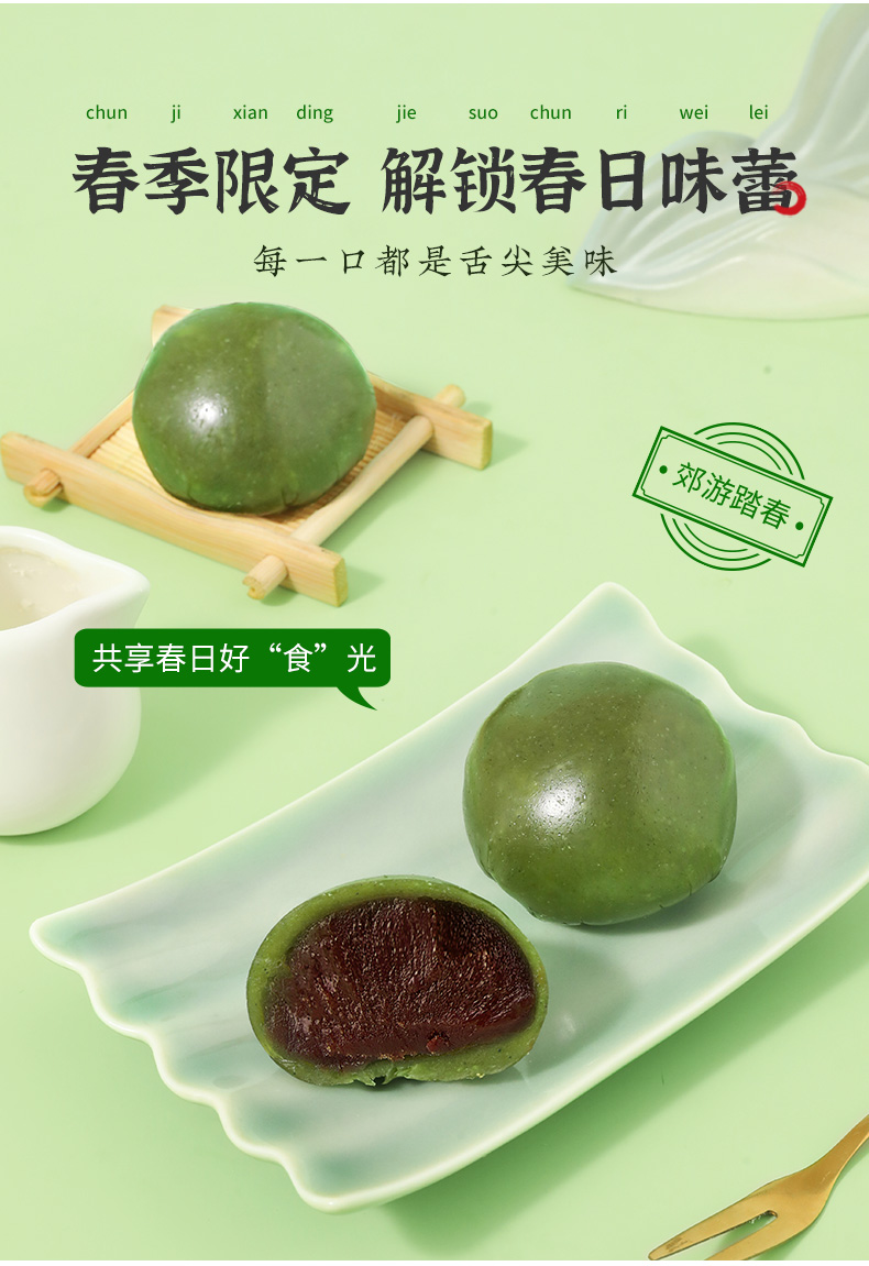 保质期:45天 产品明细: 蛋黄肉松青团60g*2 粒粒红豆沙青团60g*2 产品介绍: 经典江南味,四时风物,应季而食 1.优选糯米,捶打后口感Q弹软糯,品之细腻,自然回甘,将艾草的清香与谷物香甜融合在一起,原滋原味 2.双拼口味甜咸具备,甄选海门大红袍赤豆,制为冰淇淋口感,入口绵密细滑,甜度适中的豆沙;如丝絮的肉松融入糕点之中,不油不腻,浓郁鲜美,咸甜适中,增添味蕾惊喜。 3.手工制作,不添加防腐剂,新鲜短保,食用更放心