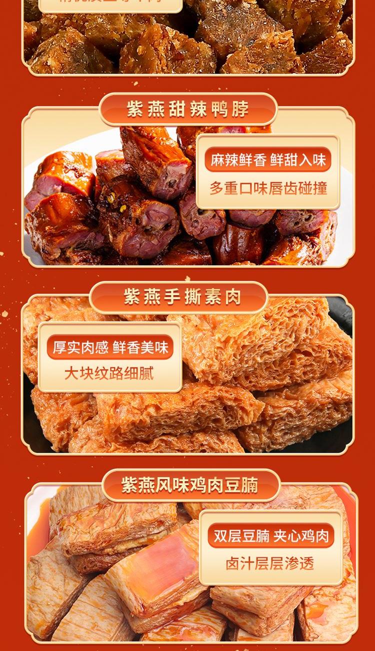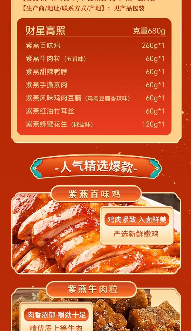 内容物配置: 紫燕百味鸡260g*1 紫燕牛肉粒(五香味)60g*1 紫燕甜辣鸭脖60g*1 紫燕手撕素肉60g*1 紫燕风味鸡肉豆腩(鸡肉豆腩香辣味)60g*1 紫燕红油竹耳丝60g*1 紫燕蜂蜜花生(椒盐味)120g*1 财星高照礼盒+组装+外盒