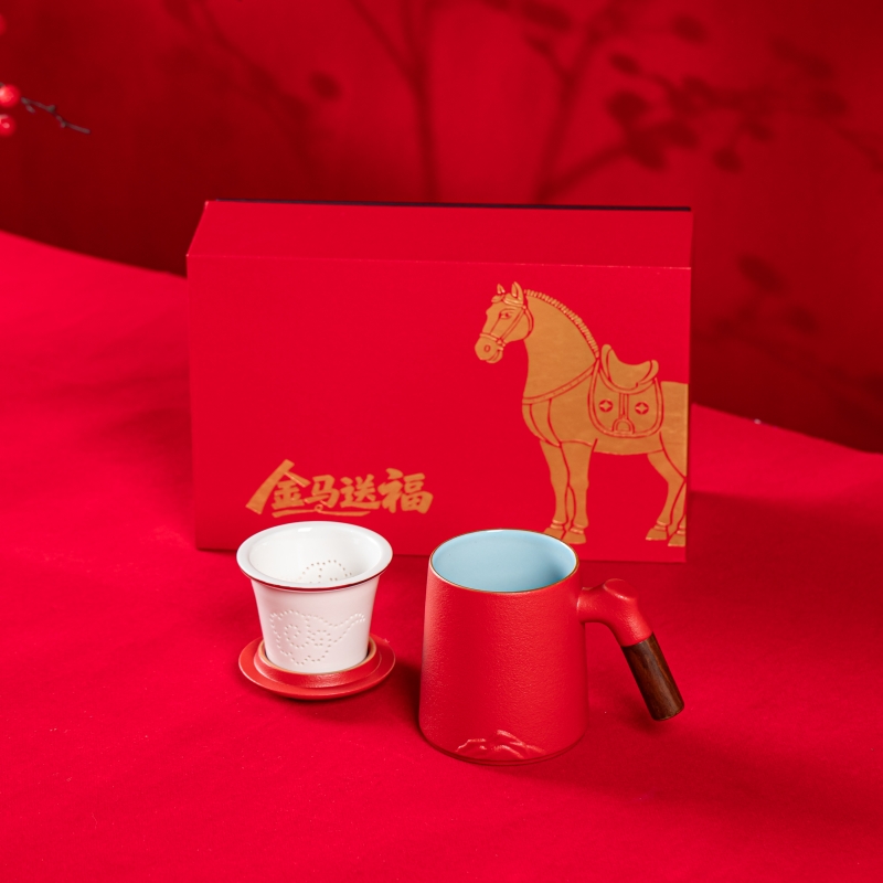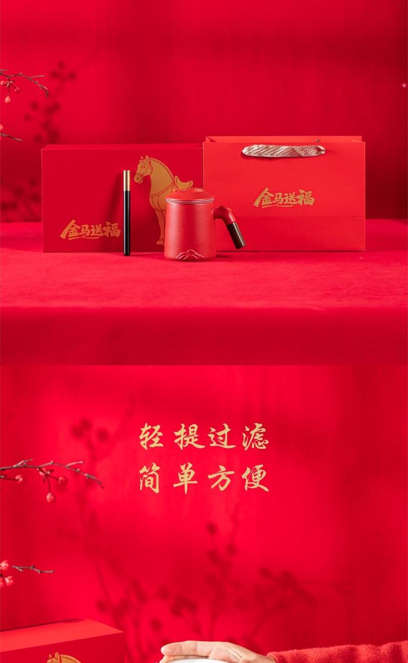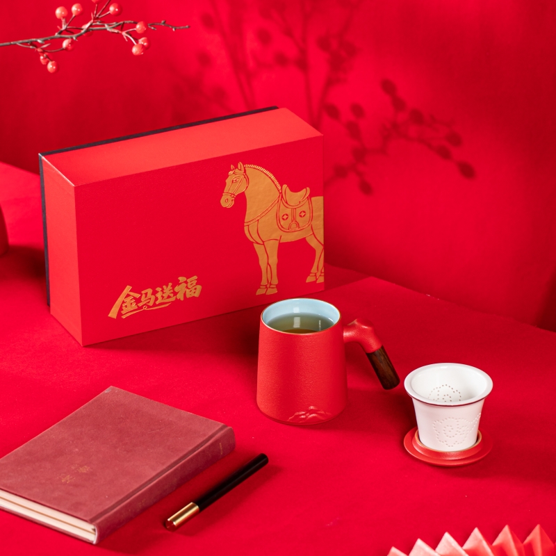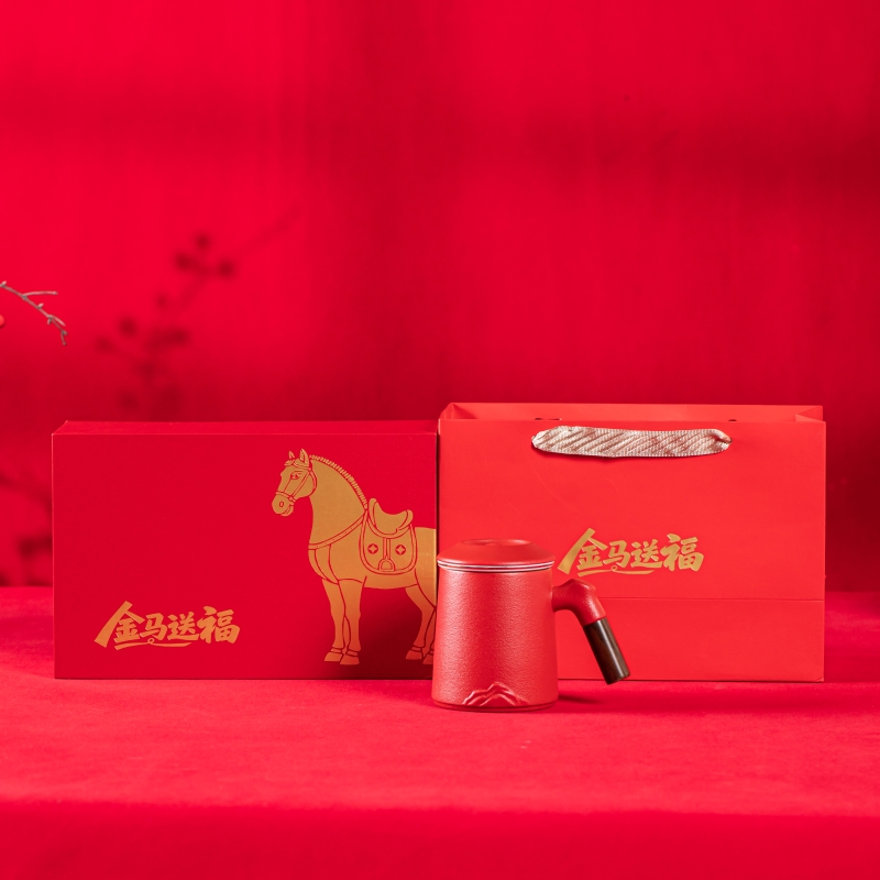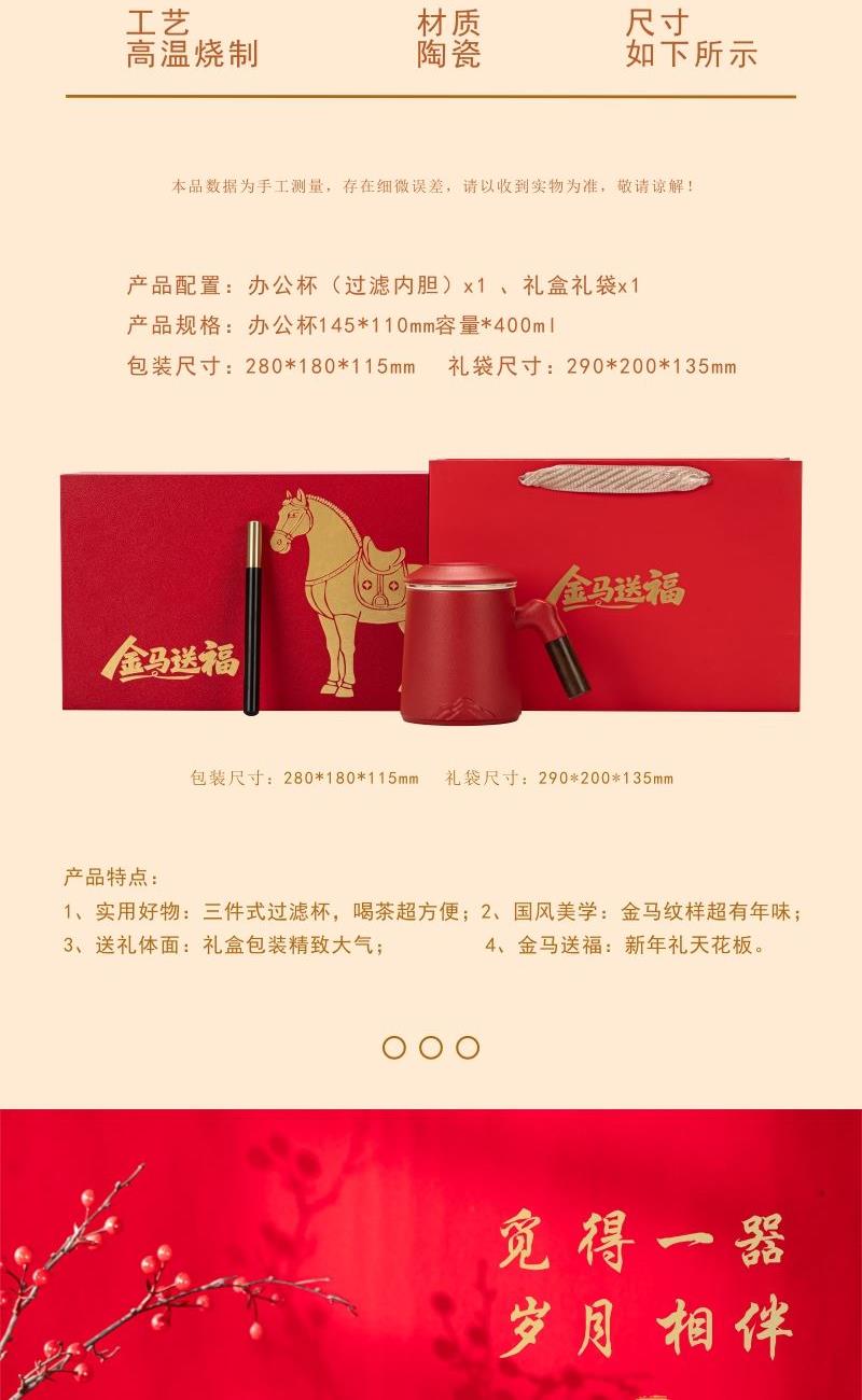产品配置:办公杯(过滤内胆)x1 、礼盒礼袋x1 产品规格:办公杯145*110mm容量*400ml 产品特点: 1、实用好物:三件式过滤杯,喝茶超方便; 2、国风美学:金马纹样超有年味; 3、送礼体面:礼盒包装精致大气; 4、金马送福:新年礼天花板。
