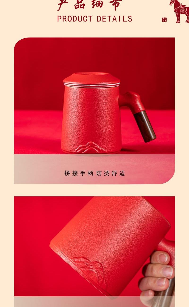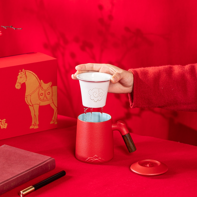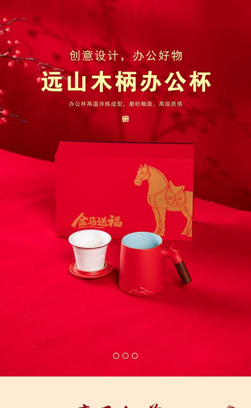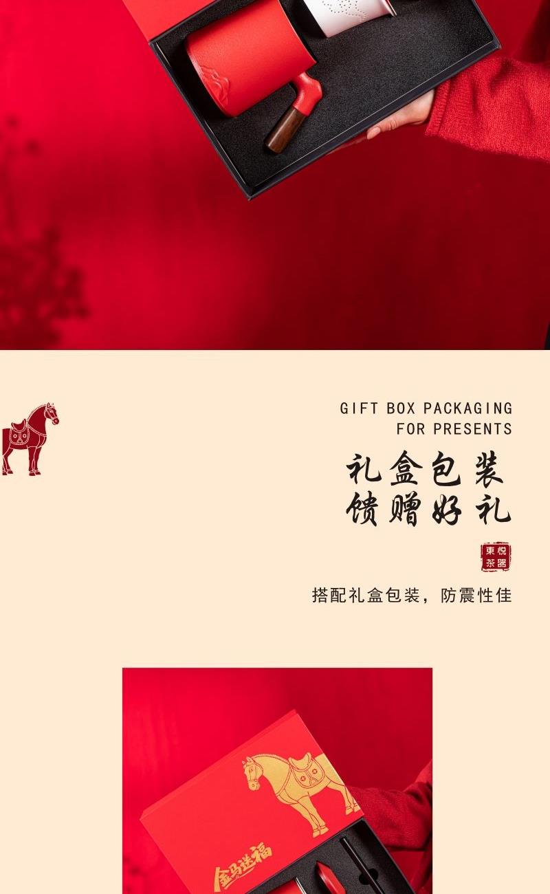 产品配置:办公杯(过滤内胆)x1 、礼盒礼袋x1 产品规格:办公杯145*110mm容量*400ml 产品特点: 1、实用好物:三件式过滤杯,喝茶超方便; 2、国风美学:金马纹样超有年味; 3、送礼体面:礼盒包装精致大气; 4、金马送福:新年礼天花板。