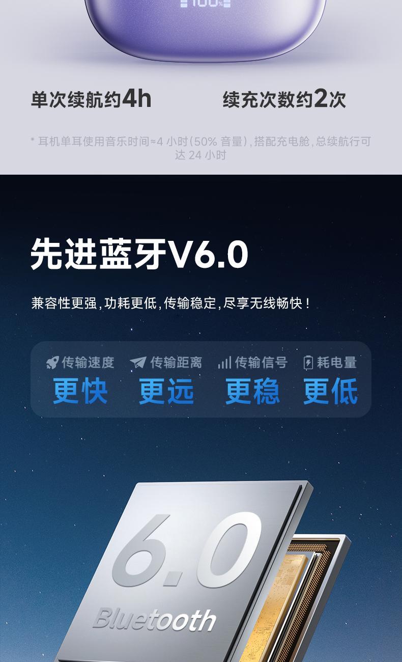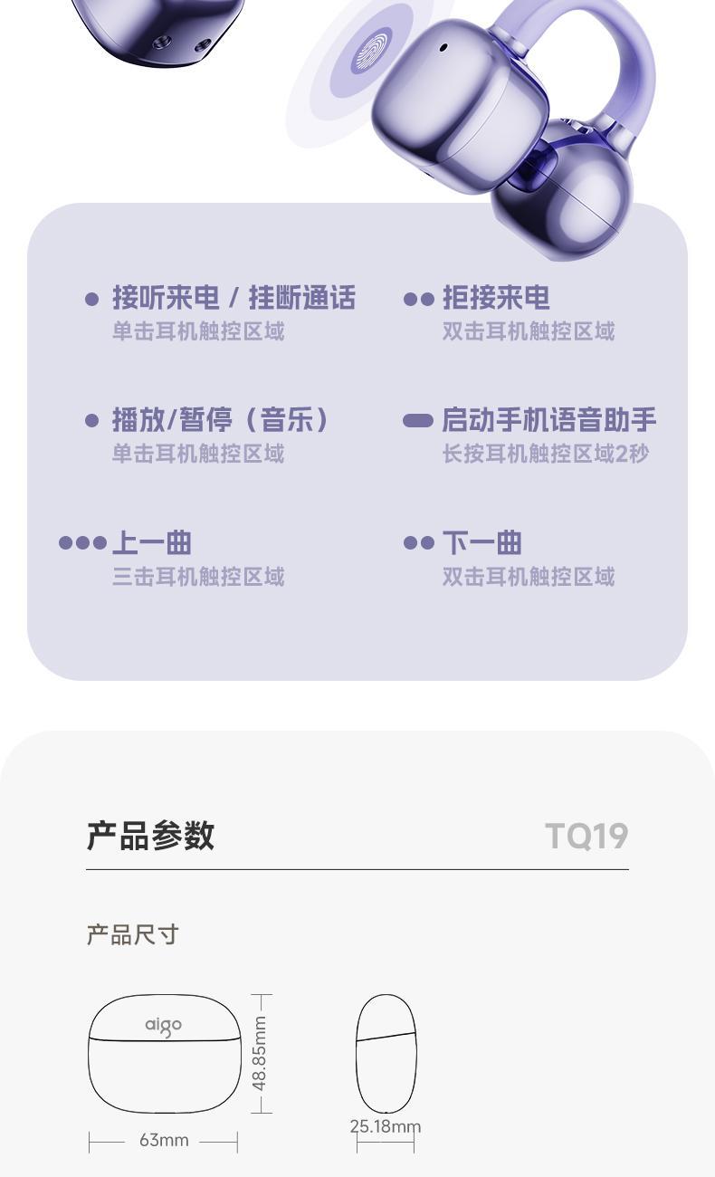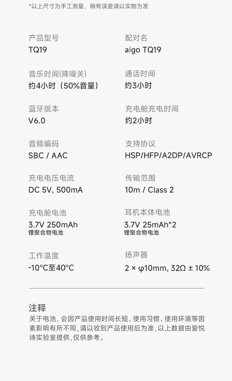 音乐时间(降噪关):约4小时(50%音量) 蓝牙版本:V6.0 音频编码:SBC/AAC 配对名:aigo TQ19 通话时间:约3小时 充电舱充电时间:约2小时 充电电压电流:DC 5V, 500mA 充电舱电池:3.7V 250mAh锂聚合物电池 工作温度:-10°C至40°C 传输范围:10m / Class 2 耳机本体电池:3.7V 25mAh*2锂聚合物电池