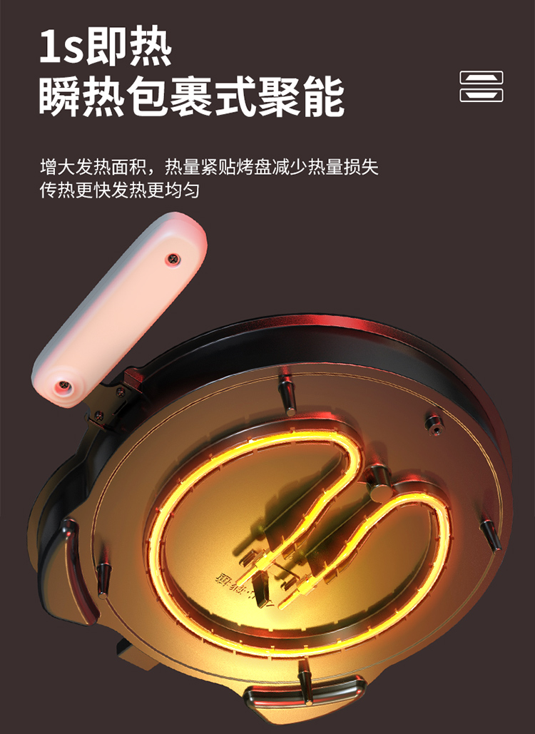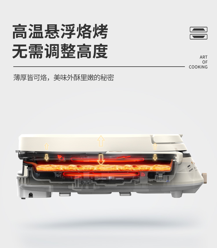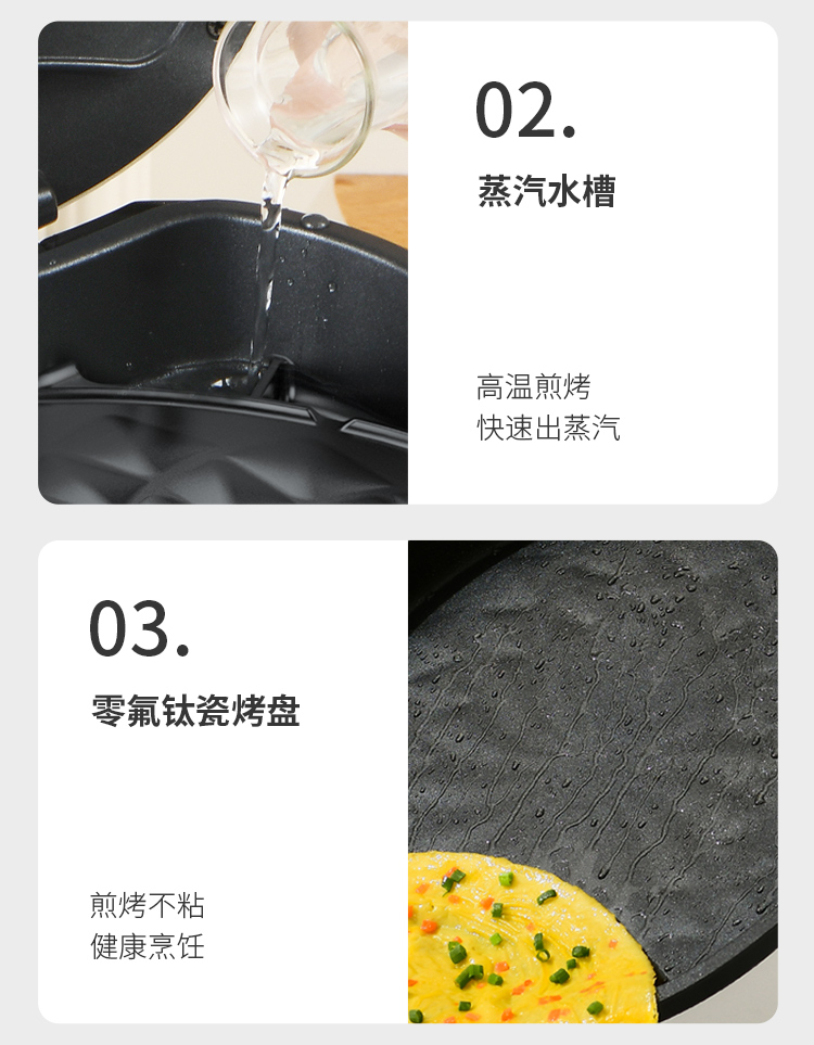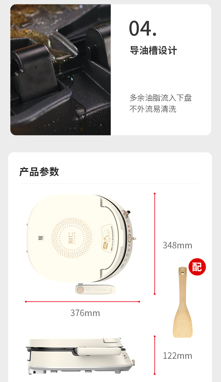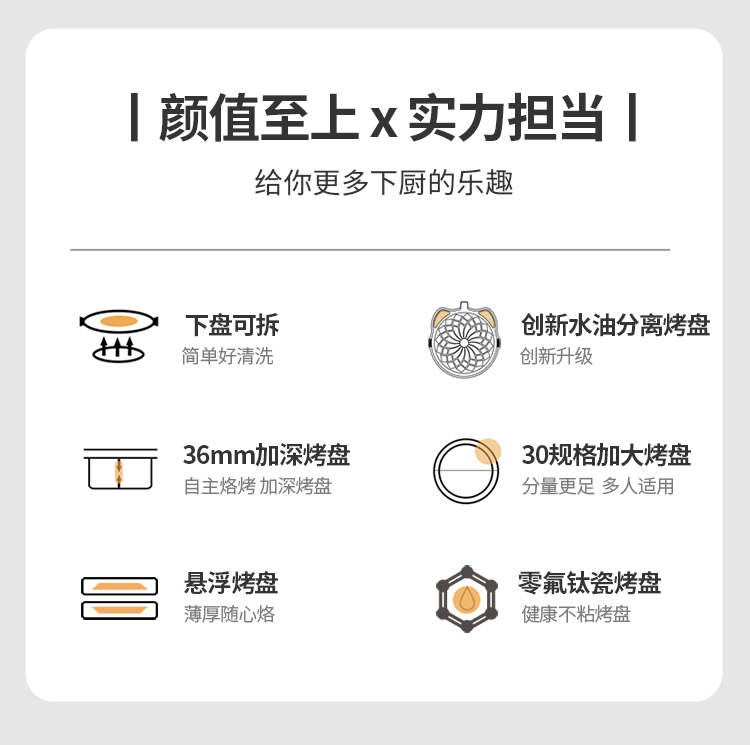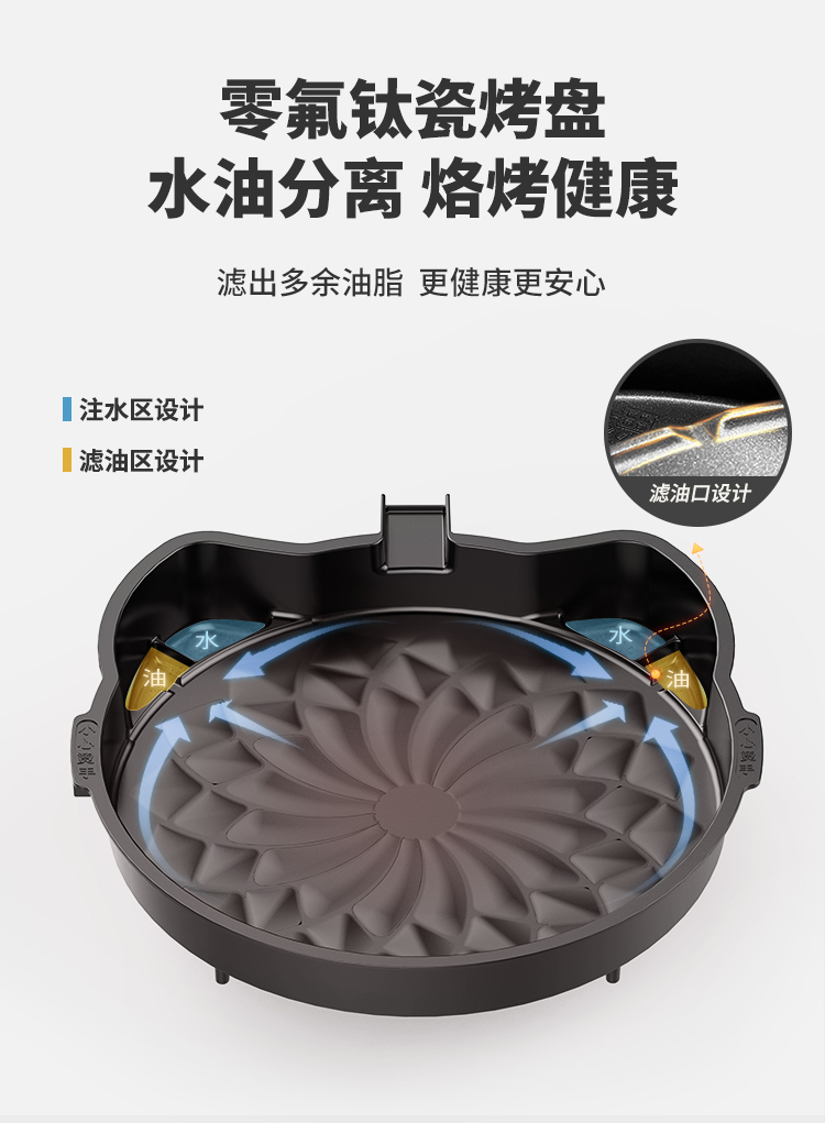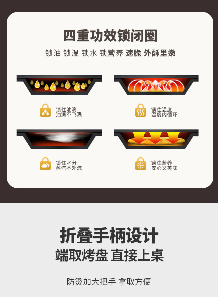 下盘可拆,简单好清洗 36mm加深烤盘,高温悬浮烙烤无需调整高度 30规格加大烤盘,分量更足 多人适用 零氟钛瓷烤盘,水油分离,烙烤健康 四重功效锁闭圈,锁油,锁温,锁水,锁营养 折叠手柄设计,精巧舒服,防滑防烫