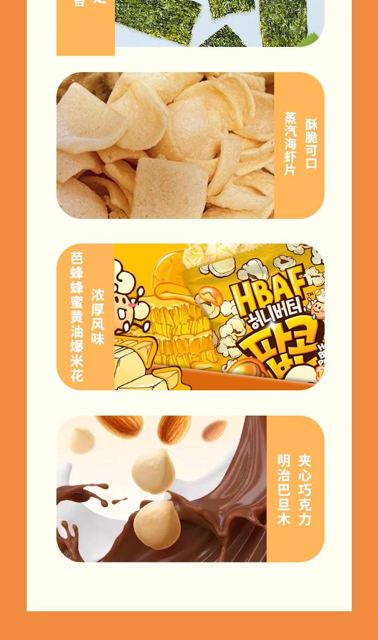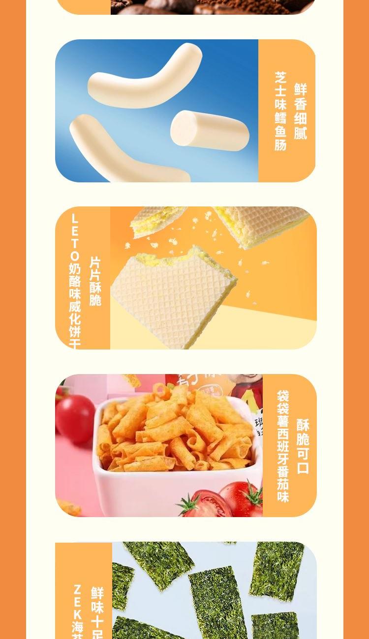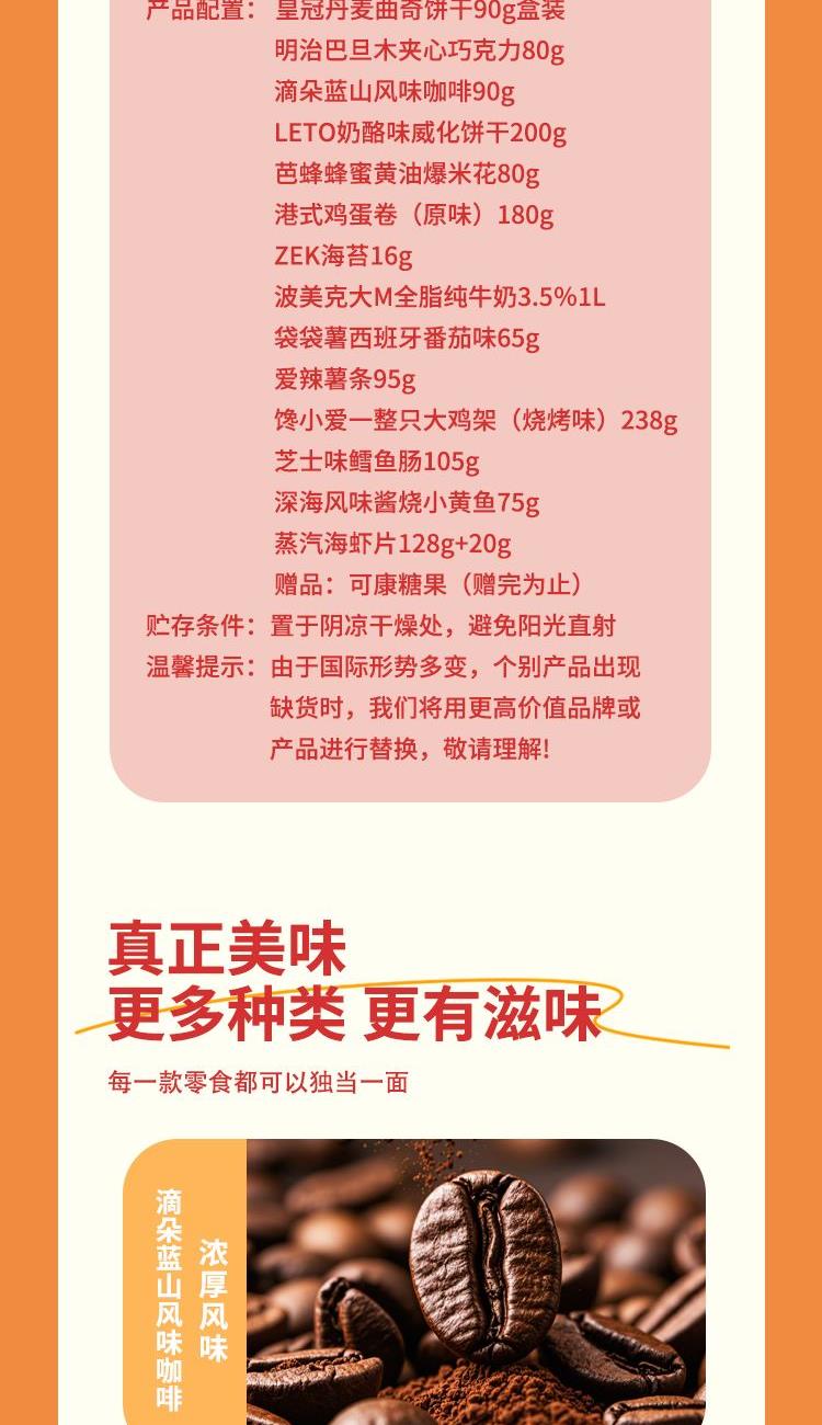 配置: 皇冠丹麦曲奇饼干90g盒装 明治巴旦木夹心巧克力80g 滴朵蓝山风味咖啡90g LETO奶酪味威化饼干200g 芭蜂蜂蜜黄油爆米花80g 港式鸡蛋卷(原味)180g ZEK海苔16g 波美克大M全脂纯牛奶3.5%1L 袋袋薯西班牙番茄味65g 爱辣薯条95g 馋小爱一整只大鸡架(烧烤味)238g 芝士味鳕鱼肠105g 深海风味酱烧小黄鱼75g 蒸汽海虾片128g+20g 赠品:可康糖果