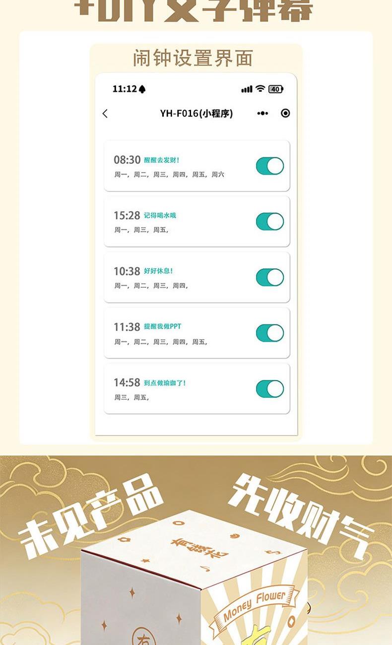 手机播放音乐屏幕同步歌词 微信扫一扫上传开机照片(也可自己手机相册) 开机祝福文字也可小程序自定义 闹钟响起来屏幕文字可以自定义 拍一拍爆金币,支付宝到账一亿元音效,功德+1,财富+1等敲木鱼音效