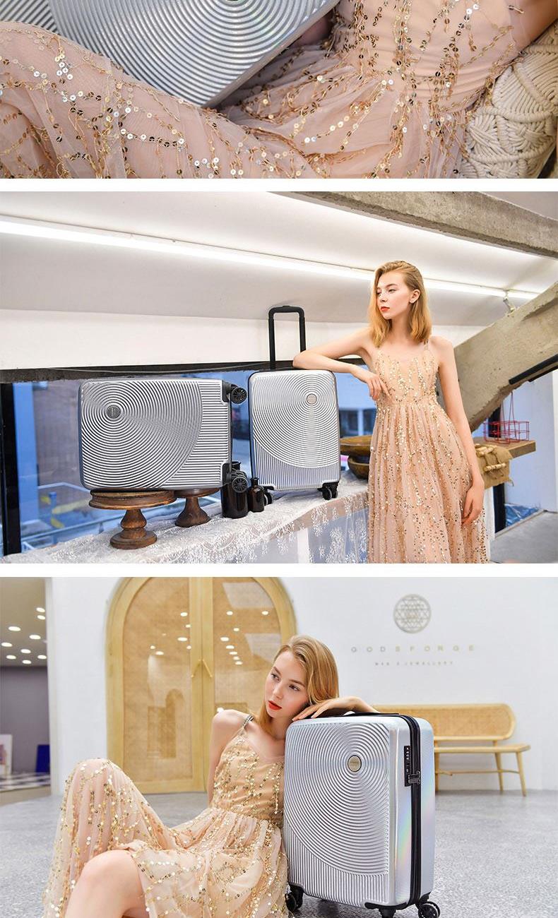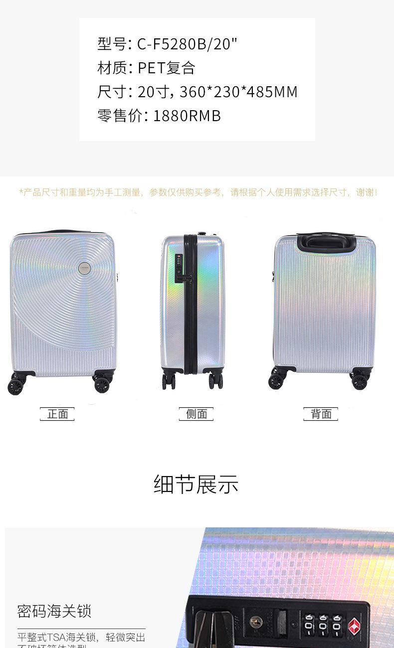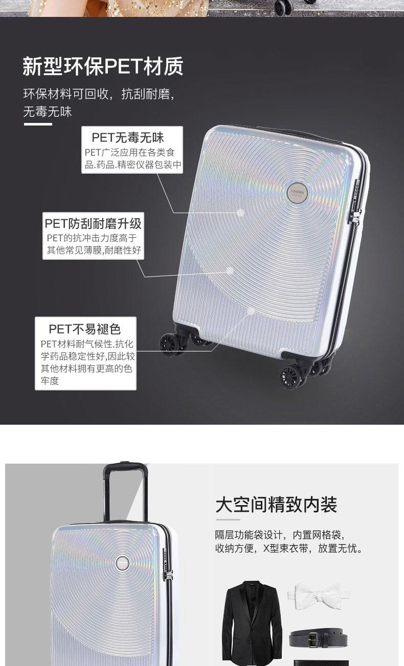 产品颜色:彩虹银 材质:里料:织物面料:PET 箱子尺寸:20寸,360*230*485MM 食品级环保材质,突破传统塑料箱体特性,韧性极高,抗冲击性两倍于传统材料,无惧暴力运输。表面精致处理,更耐刮耐用;材质零下30度严寒环境下,物理性不受任何影响,更耐寒;生产和材质本身无任何污染以及异味,安全更环保。重量轻盈,提拉省力。光晕灵感设计,设计感彰显独特个性。万向飞机轮,抓地更稳,推拉更灵活。内饰空间设计合理,出差旅游收纳无忧。