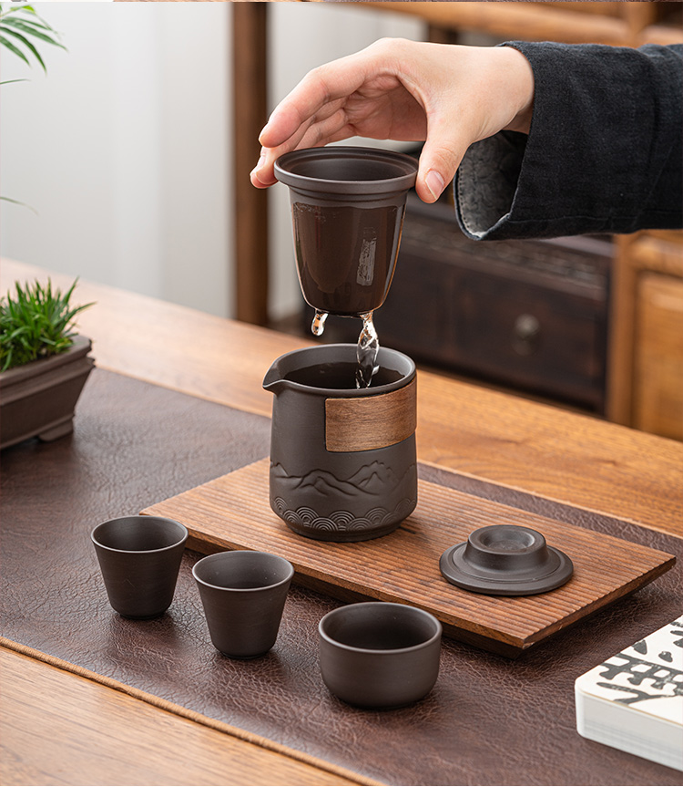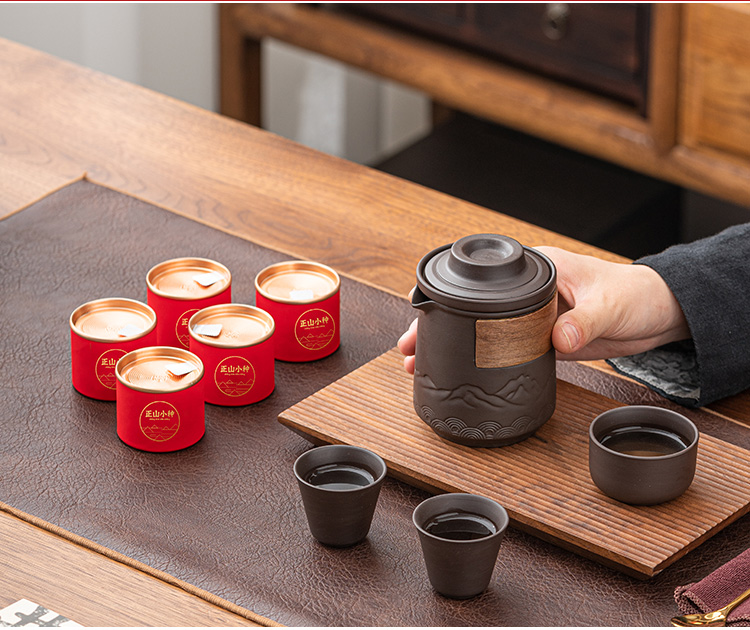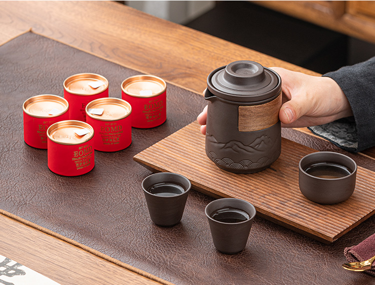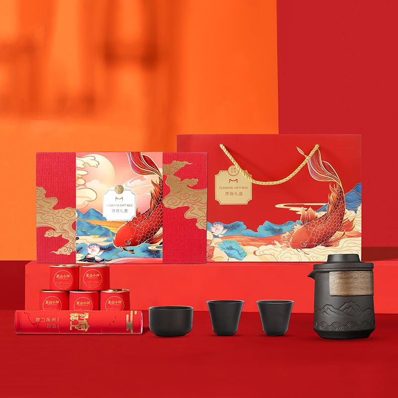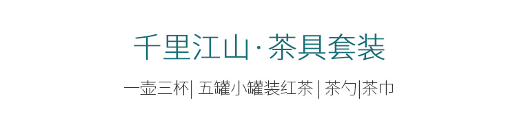 产品配置:一壶三杯、小罐装茶*5罐、 对联*1、礼盒、手提袋 材质:紫砂泥 礼盒尺寸:310×120×235mm 产品卖点: 茶具灵感取自故宫博物院珍藏文物《千里江山图》,十八岁少年王希孟豪情落笔,描绘自然山水之秀丽壮美,“咫尺有千里趣”,令人心驰神往。以器呈画,再现千年名画丰韵。千里江山茶具以写意形式表现,让咫尺千里山河美景融入到茶具里,赏千里江山,品茶中百味。