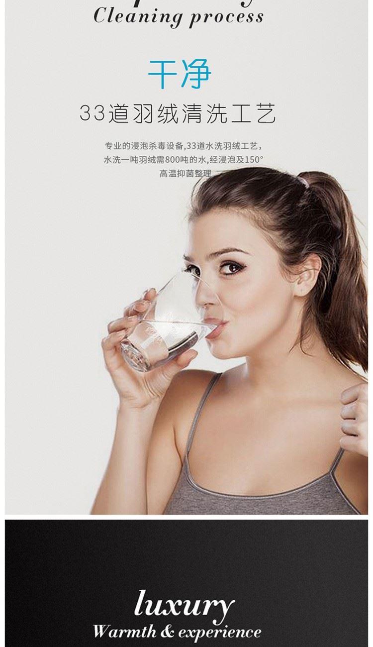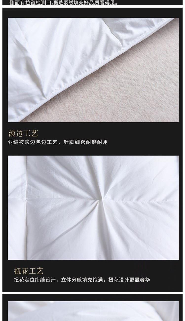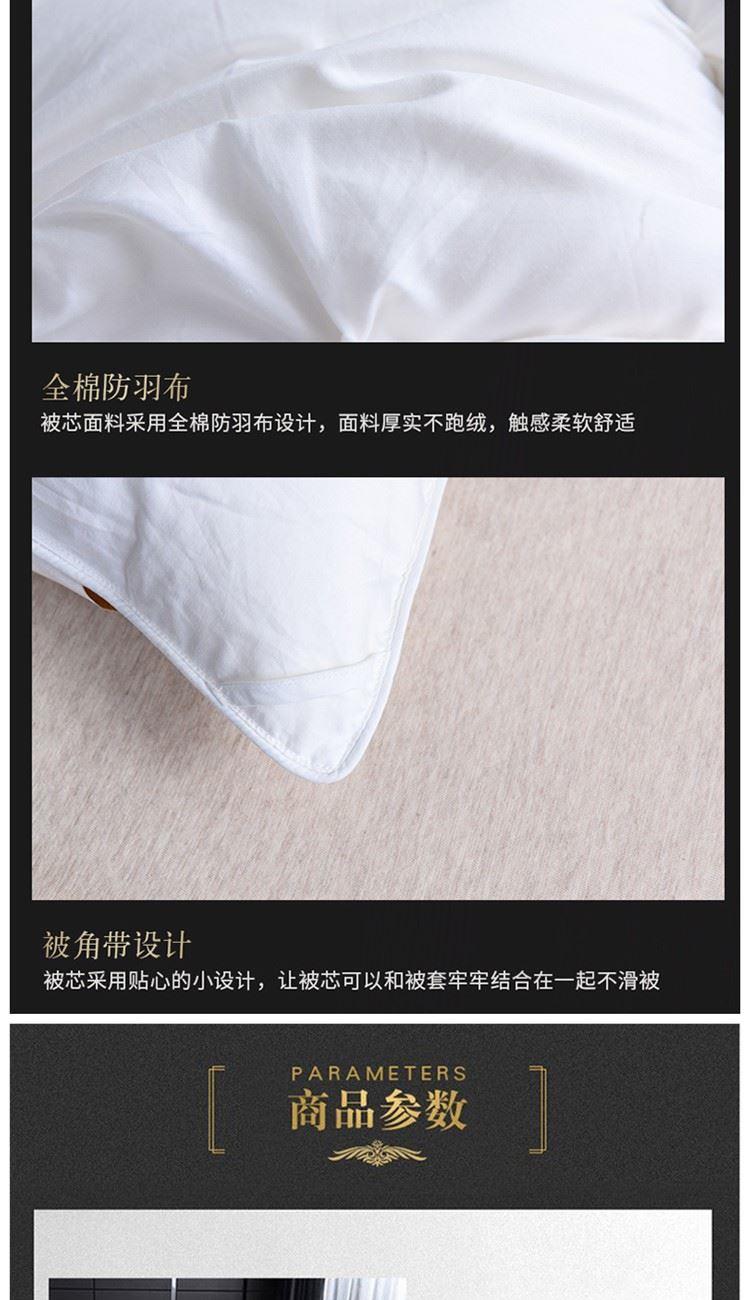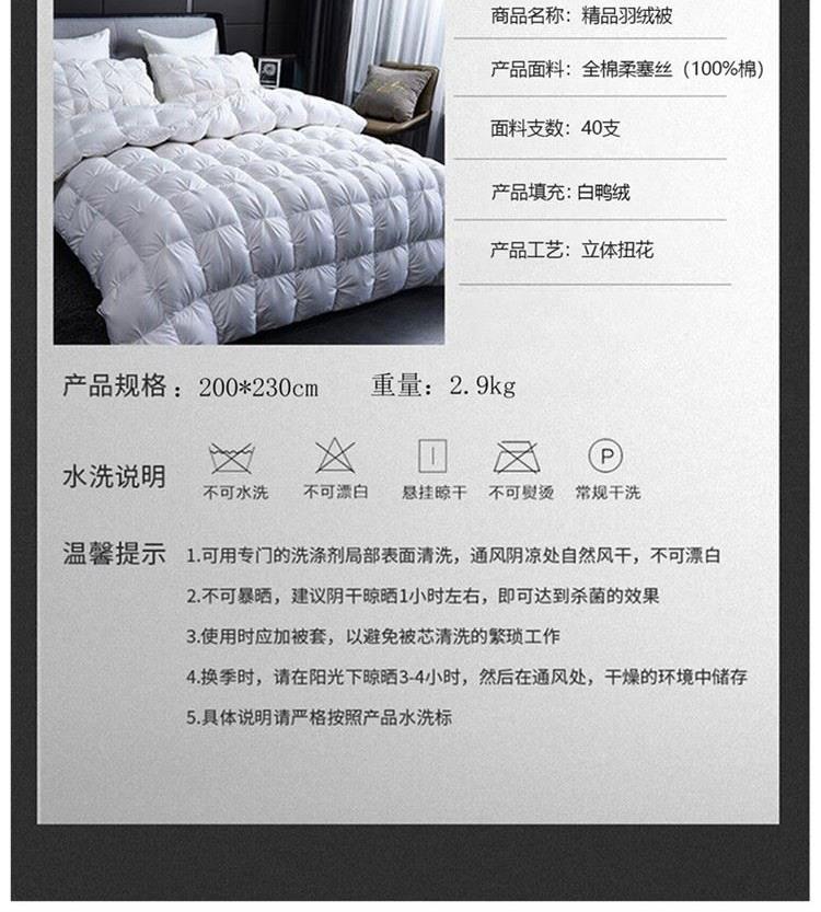 规格:200*230cm 填充:90鹅绒 面料:全棉柔塞丝(99%棉) 重量:2.9kg 1、全棉柔塞丝仿羽面料,细密编制工艺面料更厚,经久耐用。 2、90鹅绒毛填充制作,33道水洗工艺处理,健康无异味 3、扭花的被壳工艺,手感舒适面料细腻,无节点手感柔软