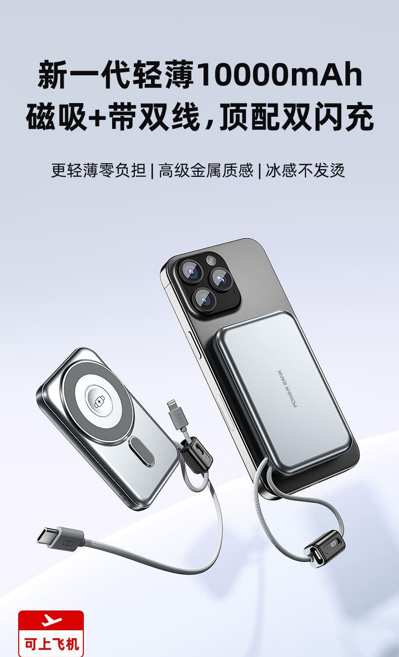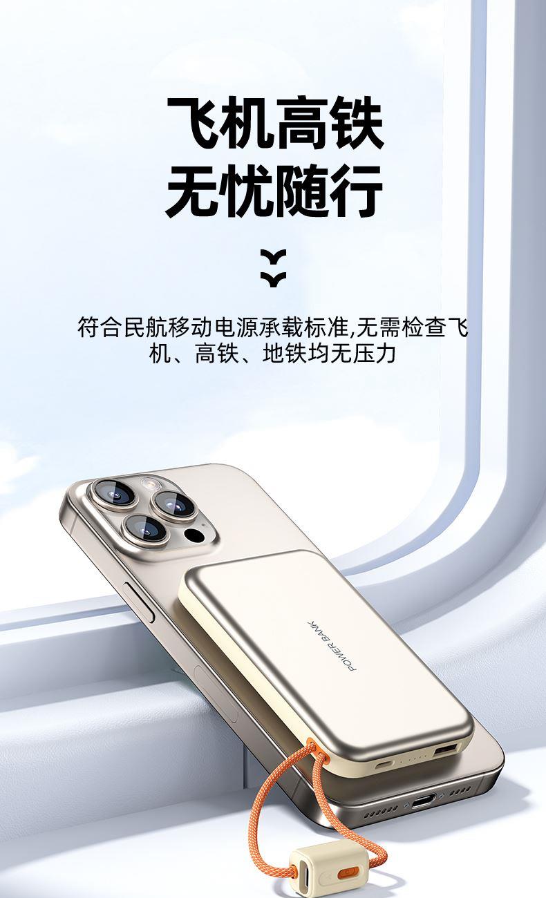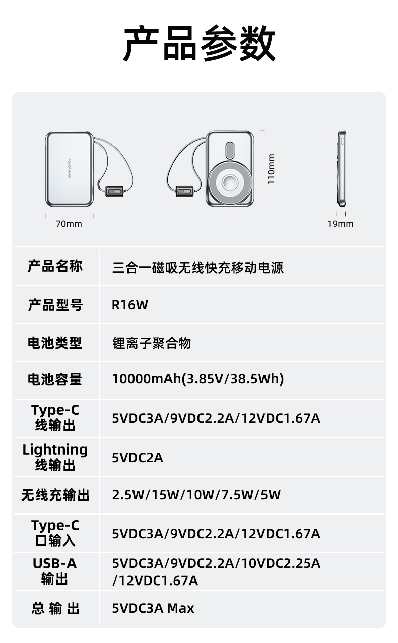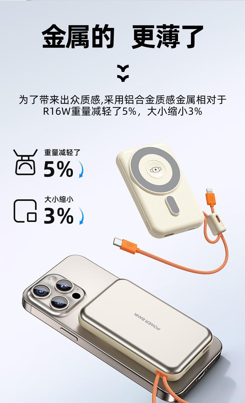 型 号: R16W 颜色 :米色 /灰色 电池 :聚合物*1pcs 电池类型 :聚合物动力电芯 容量:10000mAh 材质 :ABS+PC 尺寸 :68*108*16mm 功能特点 超薄铝合金简约设计,时尚大气; 22.5W超级快充,迅速充电; 10000mAh锂电池,澎湃动力; 自带苹果和Type-C充电线; 一输入三输出,支持苹果15手机 可充手机,手表,蓝牙耳机一件搞定