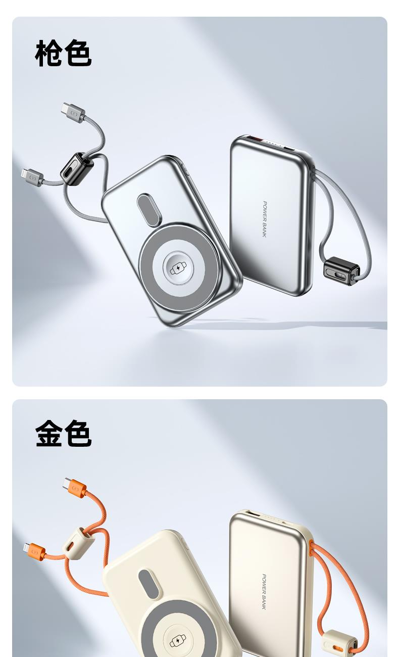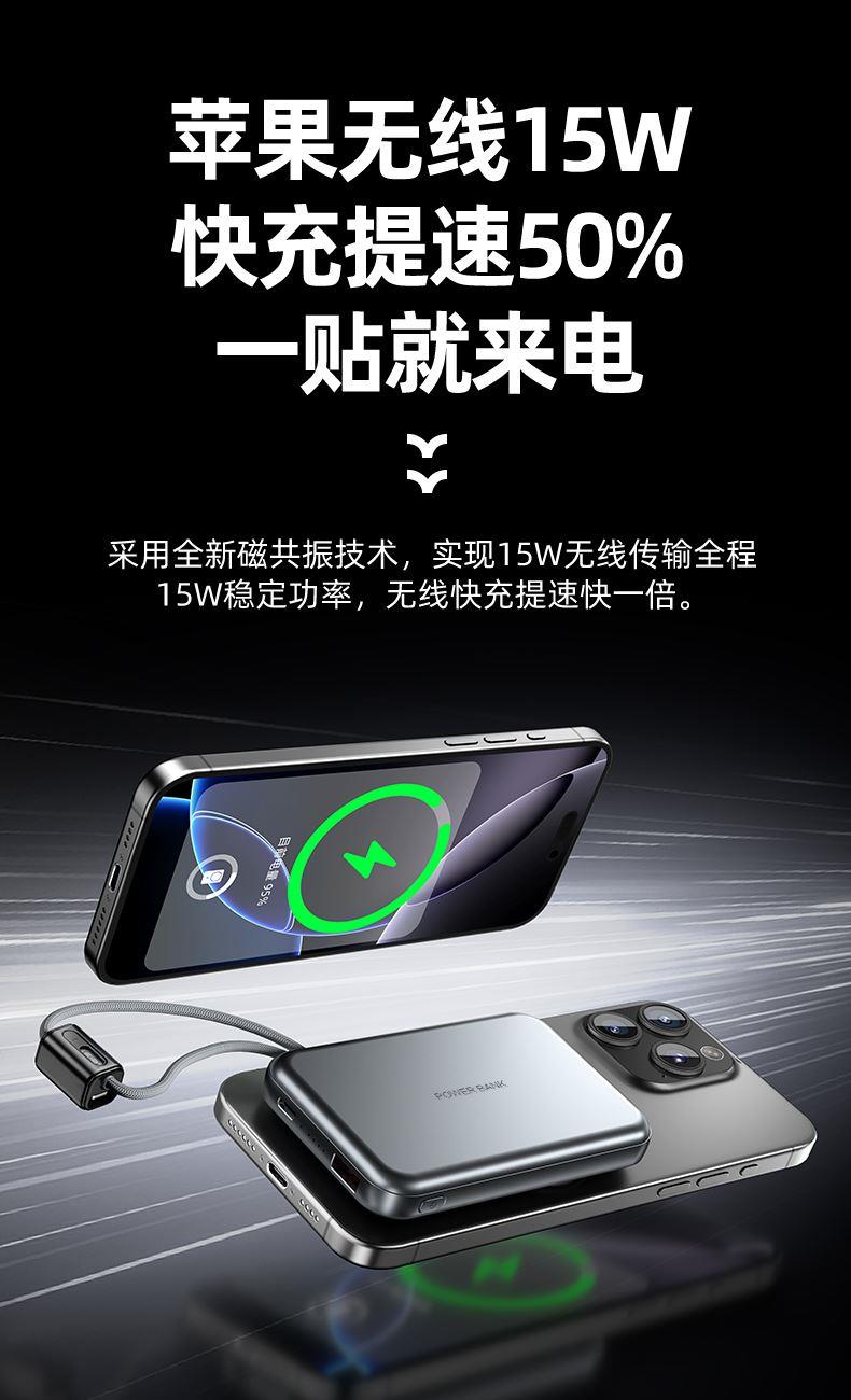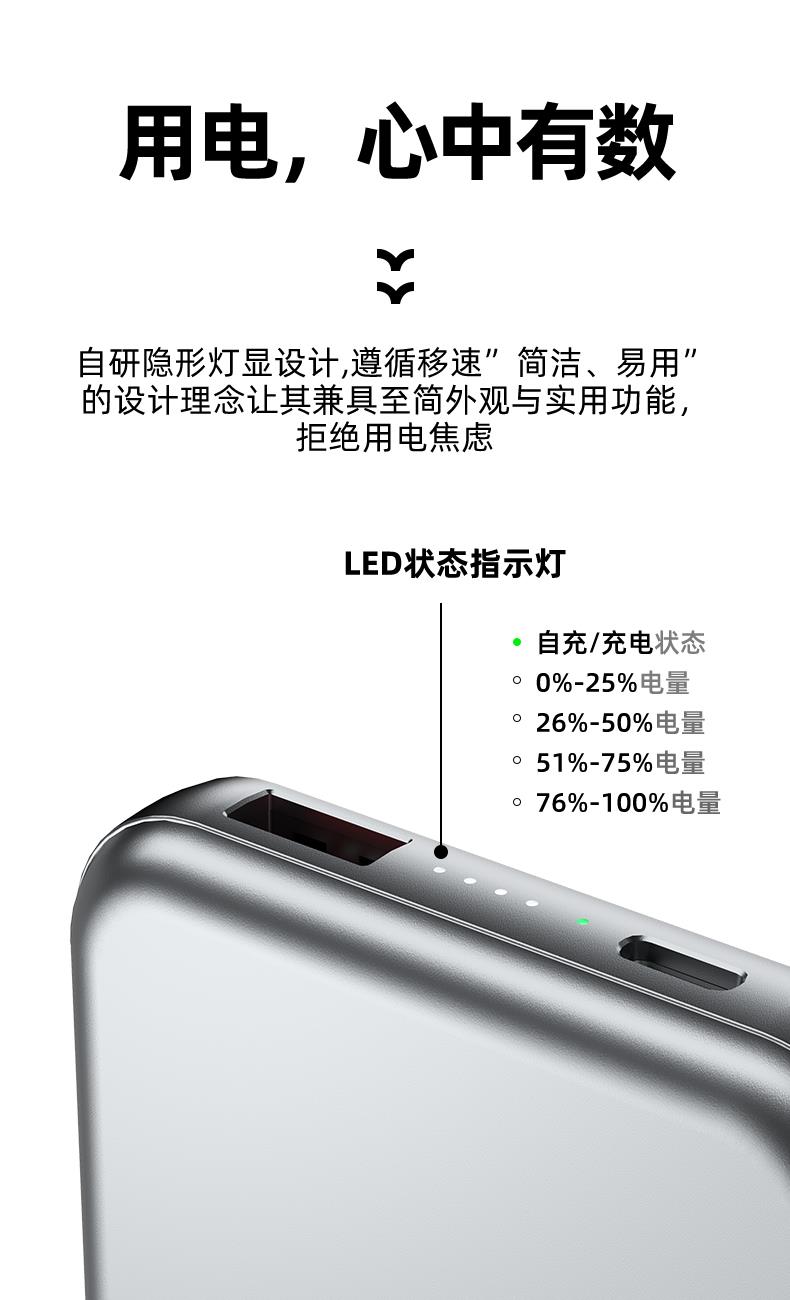 型 号: R16W 颜色 :米色 /灰色 电池 :聚合物*1pcs 电池类型 :聚合物动力电芯 容量:10000mAh 材质 :ABS+PC 尺寸 :68*108*16mm 功能特点 超薄铝合金简约设计,时尚大气; 22.5W超级快充,迅速充电; 10000mAh锂电池,澎湃动力; 自带苹果和Type-C充电线; 一输入三输出,支持苹果15手机 可充手机,手表,蓝牙耳机一件搞定