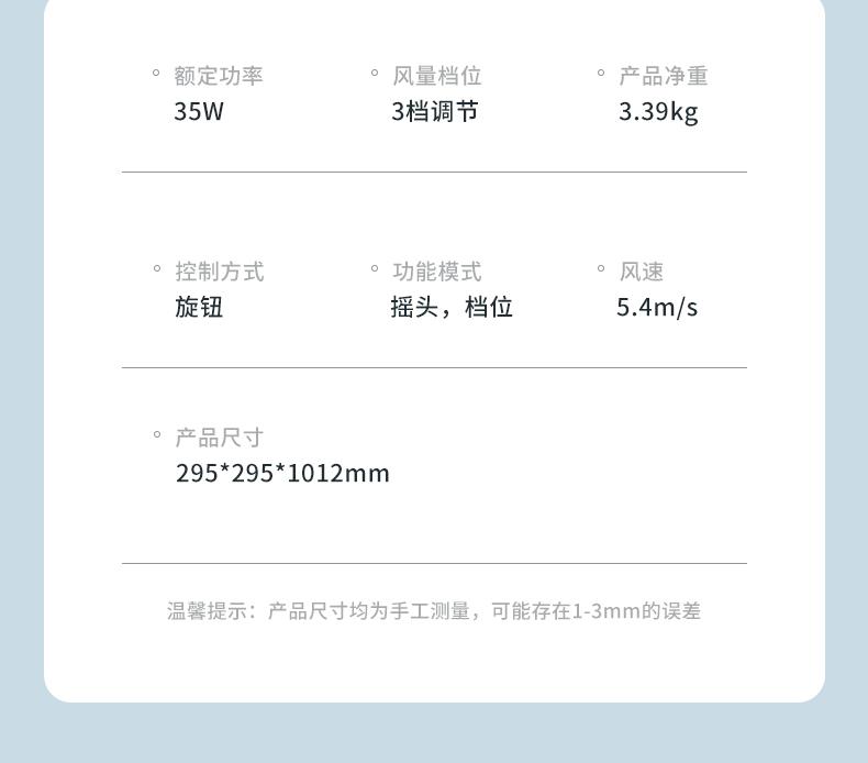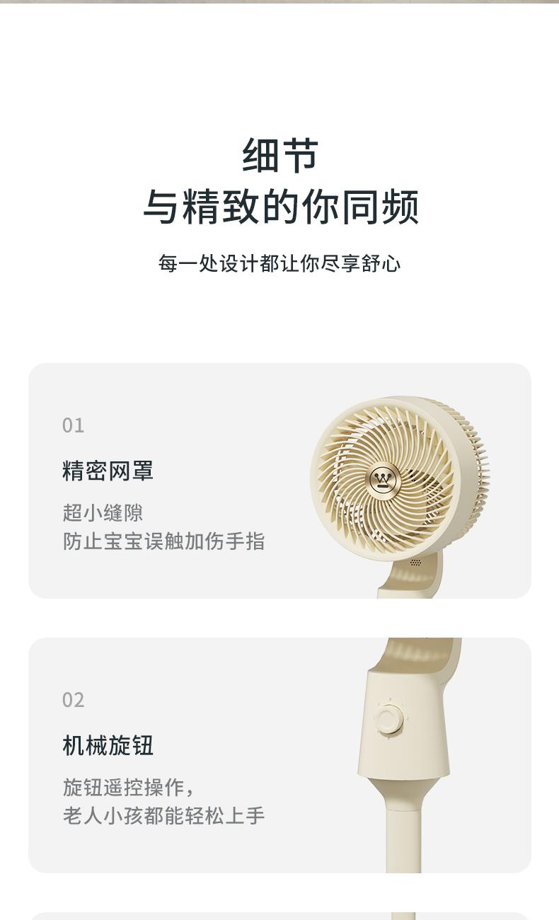 功率:35W 毛重:4.4kg 国际编码:'6974807361678 控制方式:机械旋钮式 风速档位:3档 产品尺寸:295*295*1012mm 西屋超高性价比循环扇 3档风速调节,满足不同环境需求 左右50°摇头,上下90°可调节旋转 旋钮式操控,简单易懂 台立两用,高度可调节 交流罩级电机,强劲持久动力 低噪音设计,轻柔不扰眠
