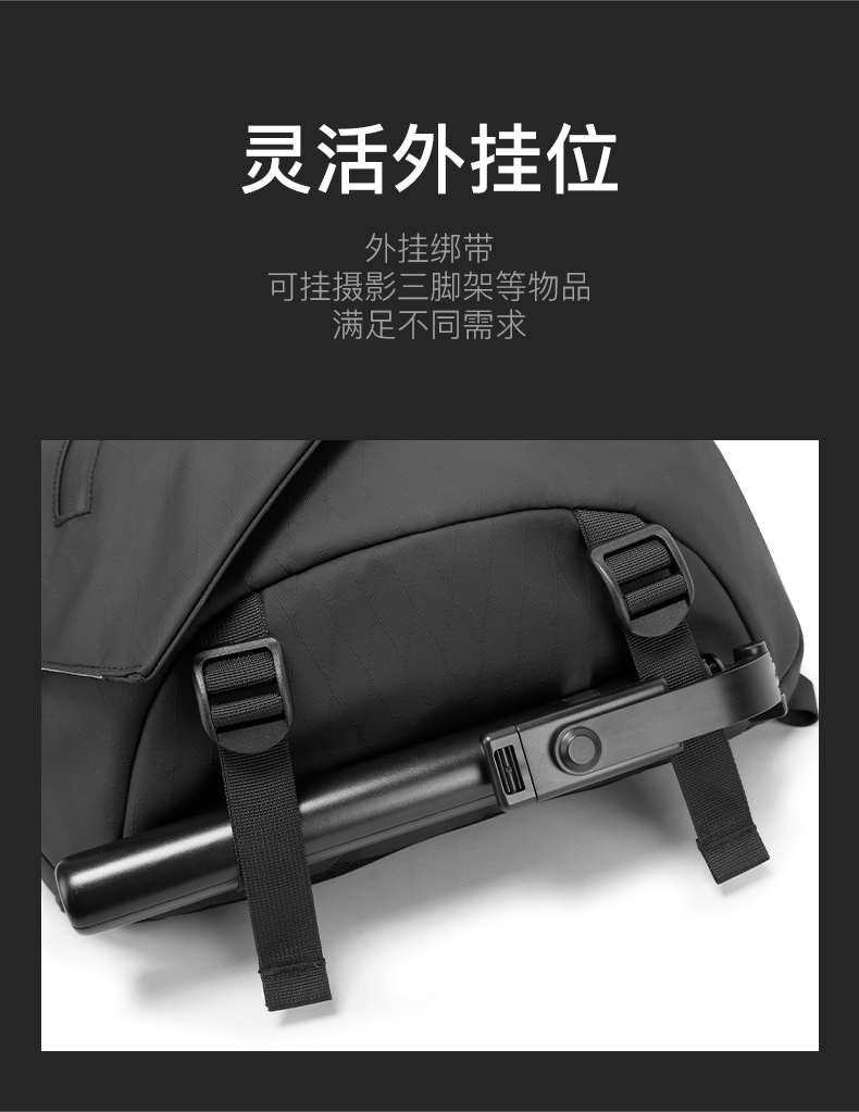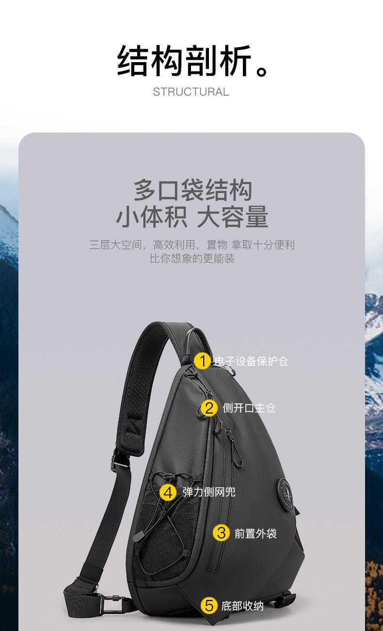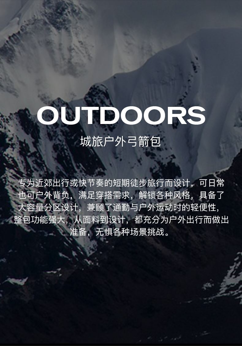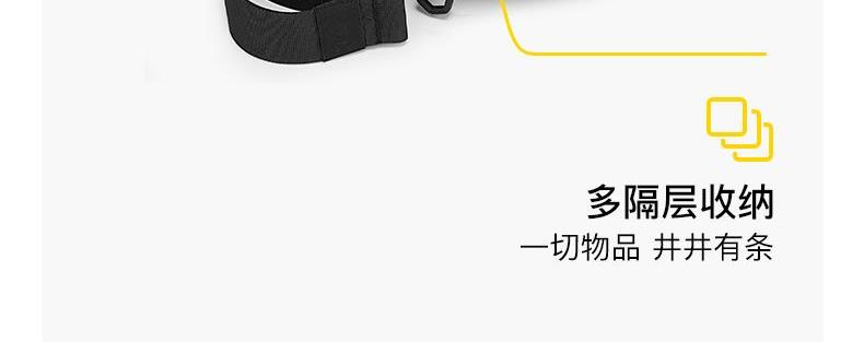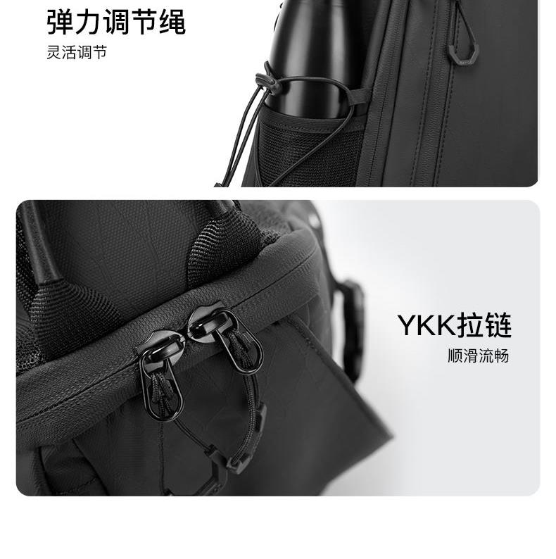 多口袋结构小体积大容量 合理分区更有内涵 侧开口主仓设计 灵活外挂位 内外防护双重叠加 城野无界轻盈随行 弹力钥匙扣 魔术贴logo 弹力调节绳 YKK拉链
