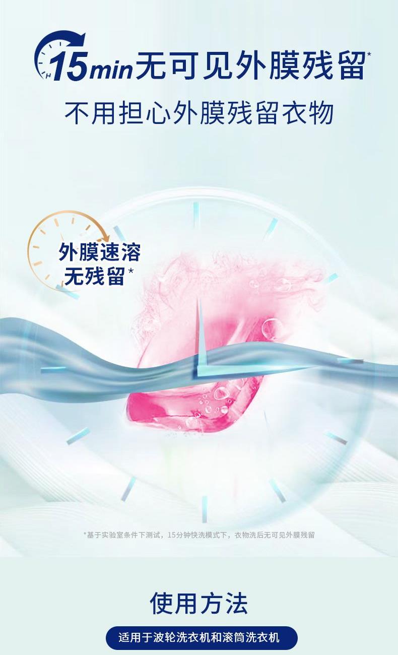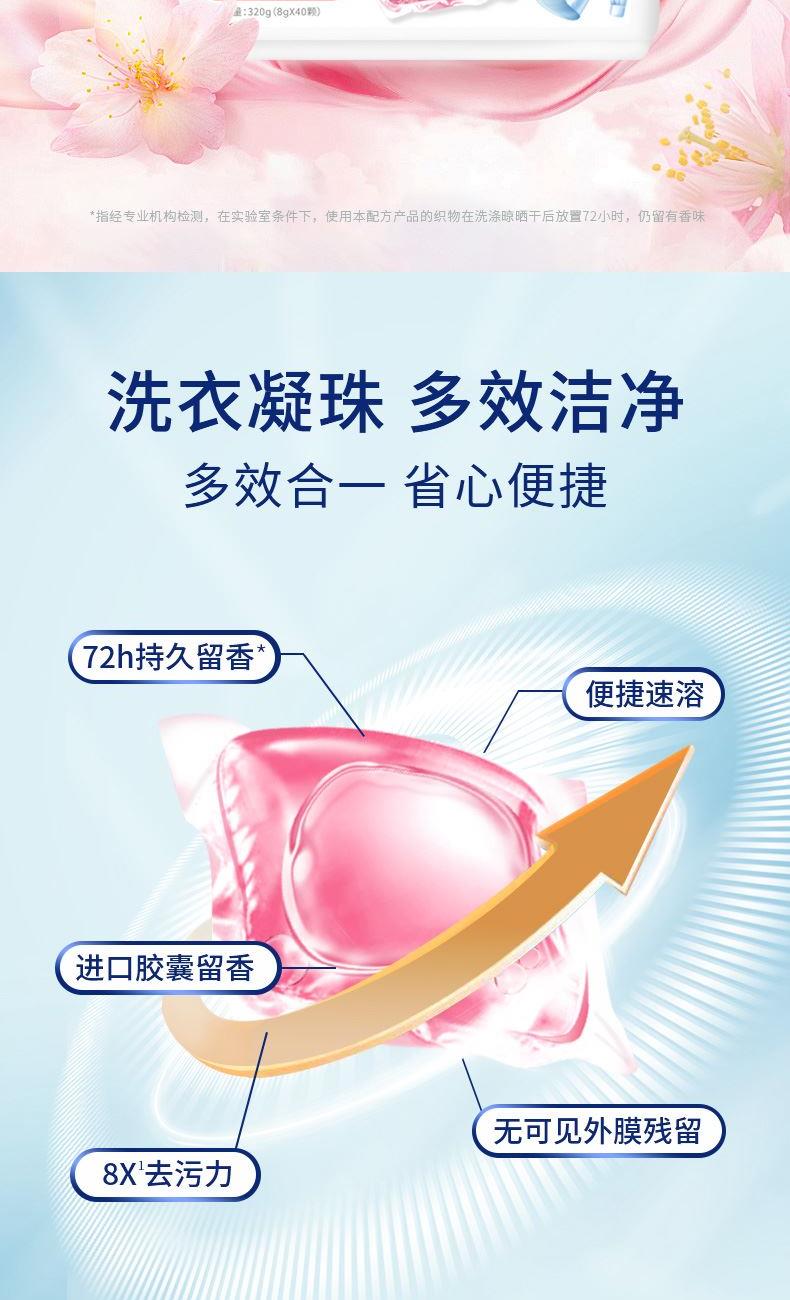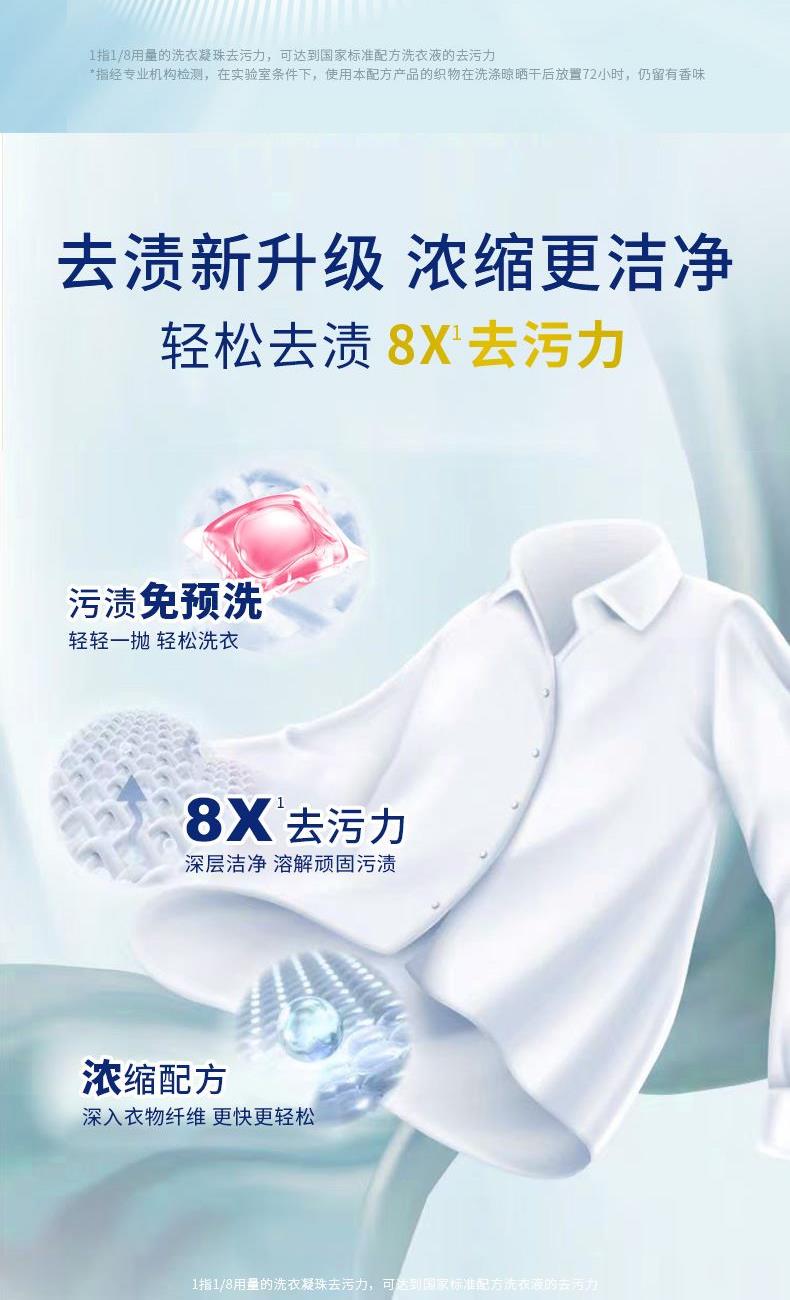 特点:8倍去污力,多效洁净。进口胶囊留香72小时持久留香 ※欧洲国际进口大师高定香氣浪漫樱花,环绕锁香技术,摩擦爆香,72小时持久留香。 ※ 8倍去污力达到高标准去污力,迅速溶解多种顽固污渍,洁净如新。※特别添加织物护理因子,柔软护衣洗后不褪色不发硬,晒后柔软篷松。凝珠便捷速溶,15秒外膜无残留。 ※无荧光增白剂、无甲醛,无含氣漂白剂,去污力检测远超国标标准,高标准破膜速麼