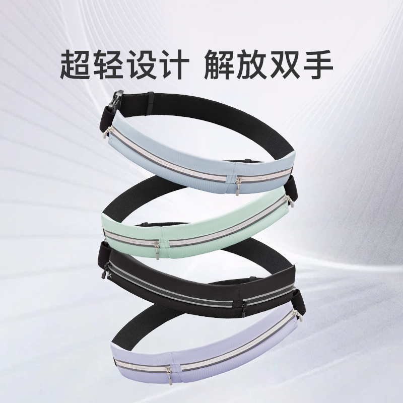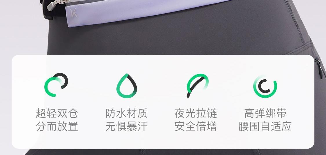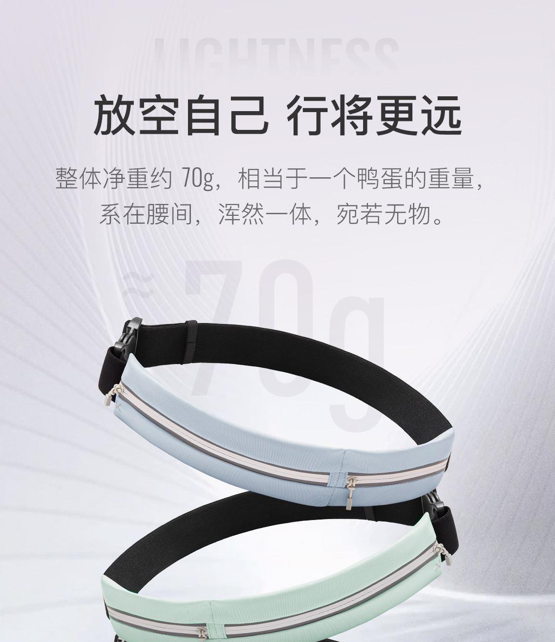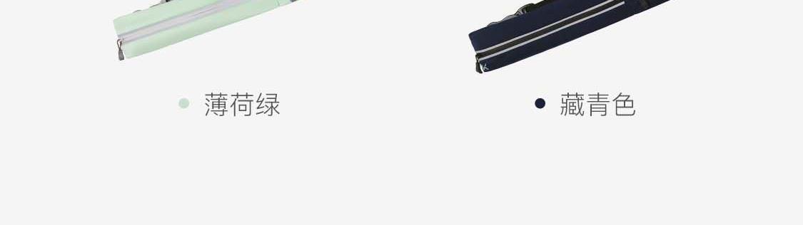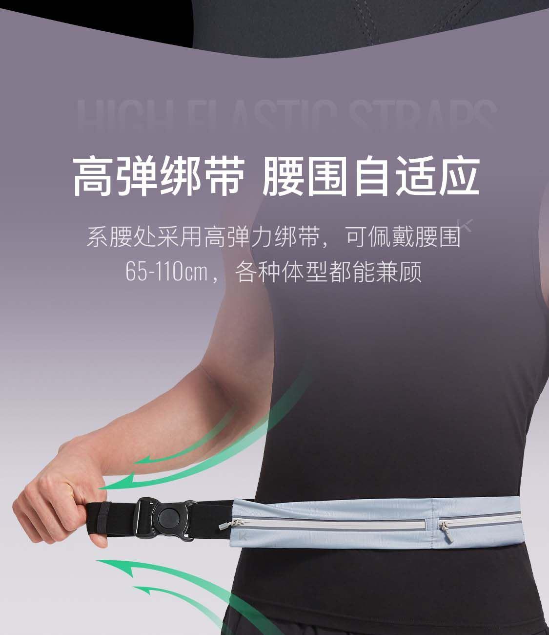 材质:85.4%聚酯纤维14.6%氨纶 重量:约70g 颜色:氧气紫/浅草绿/薄荷绿、月光灰/夜跑灰/藏青色 尺寸:主仓长21cm,副仓长11cm全长83cm,高5.5cm 腰围:65-110cm 超轻设计 跑跳不晃 防泼水面料 安全反光