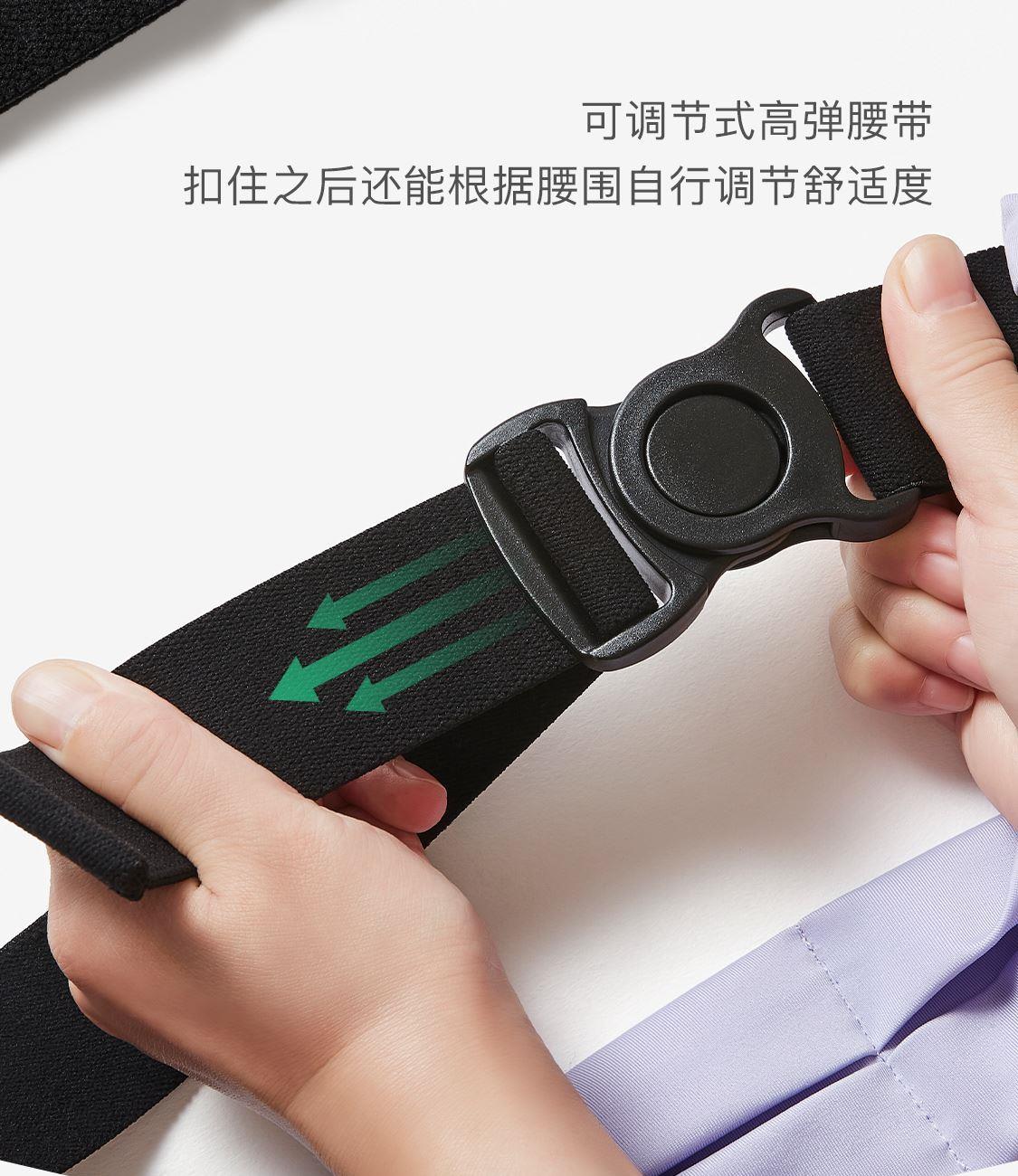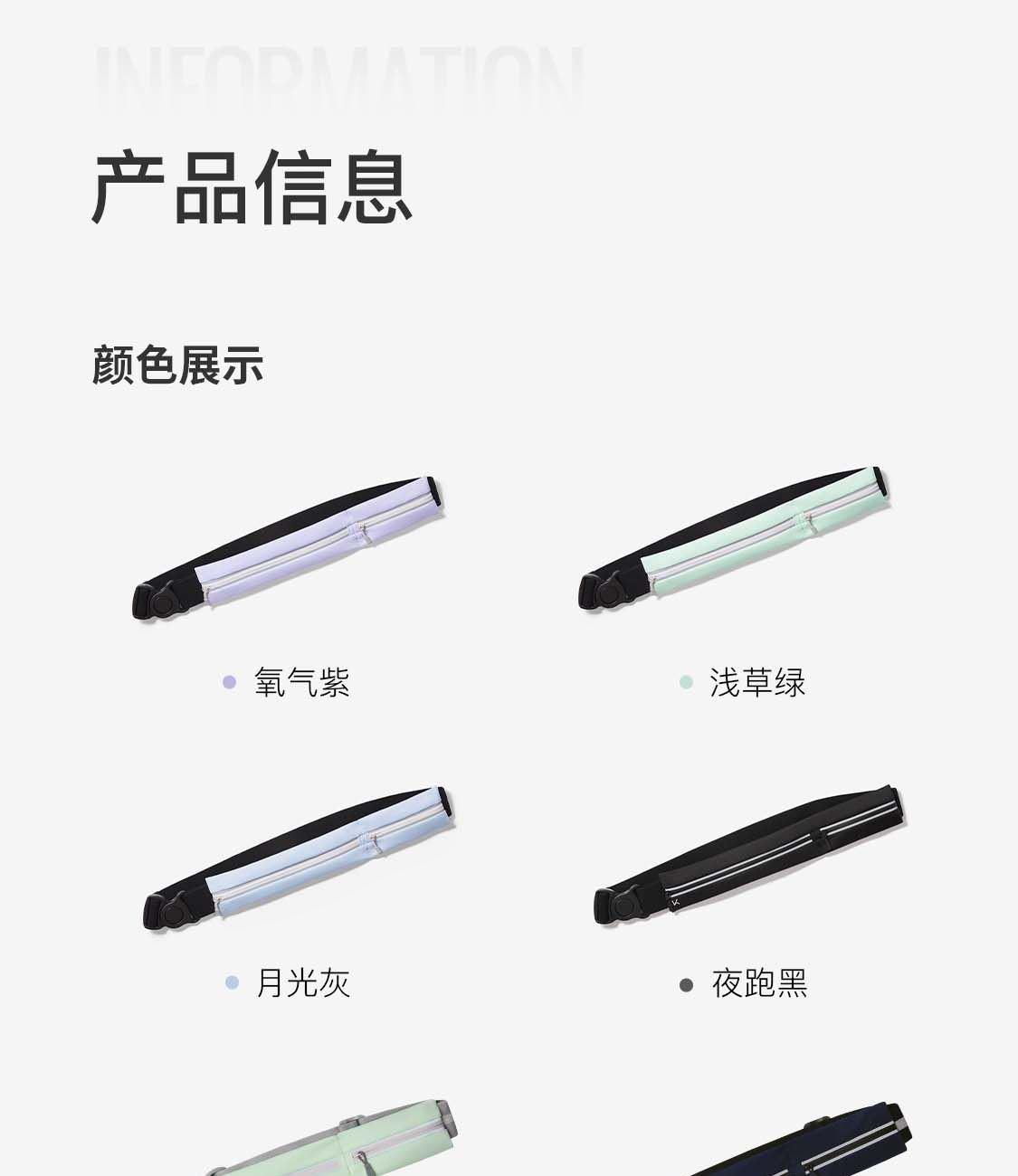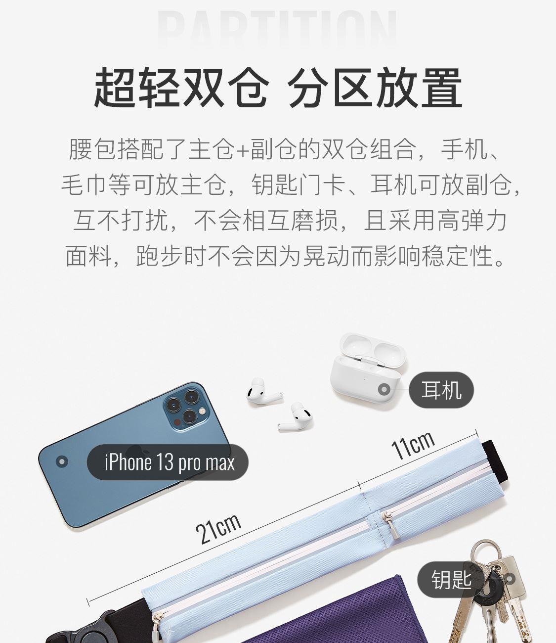 材质:85.4%聚酯纤维14.6%氨纶 重量:约70g 颜色:氧气紫/浅草绿/薄荷绿、月光灰/夜跑灰/藏青色 尺寸:主仓长21cm,副仓长11cm全长83cm,高5.5cm 腰围:65-110cm 超轻设计 跑跳不晃 防泼水面料 安全反光
