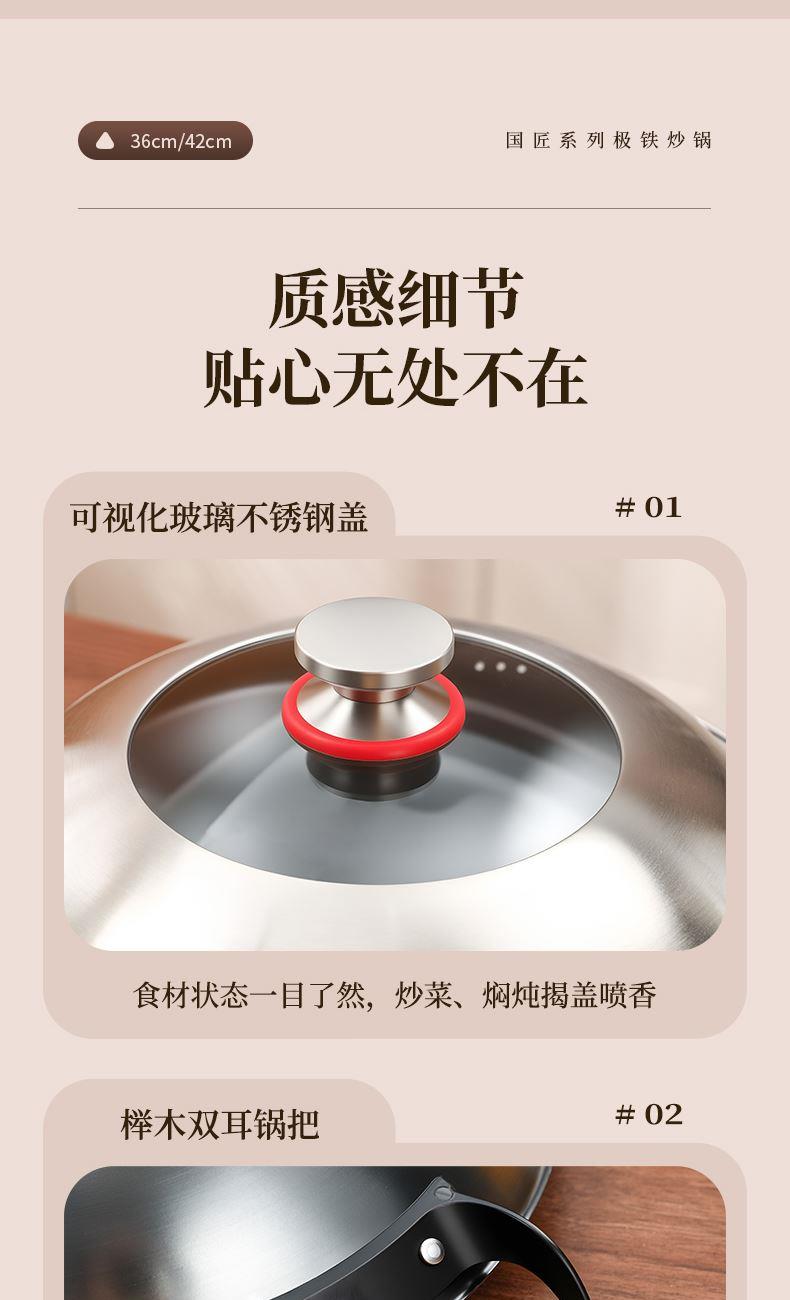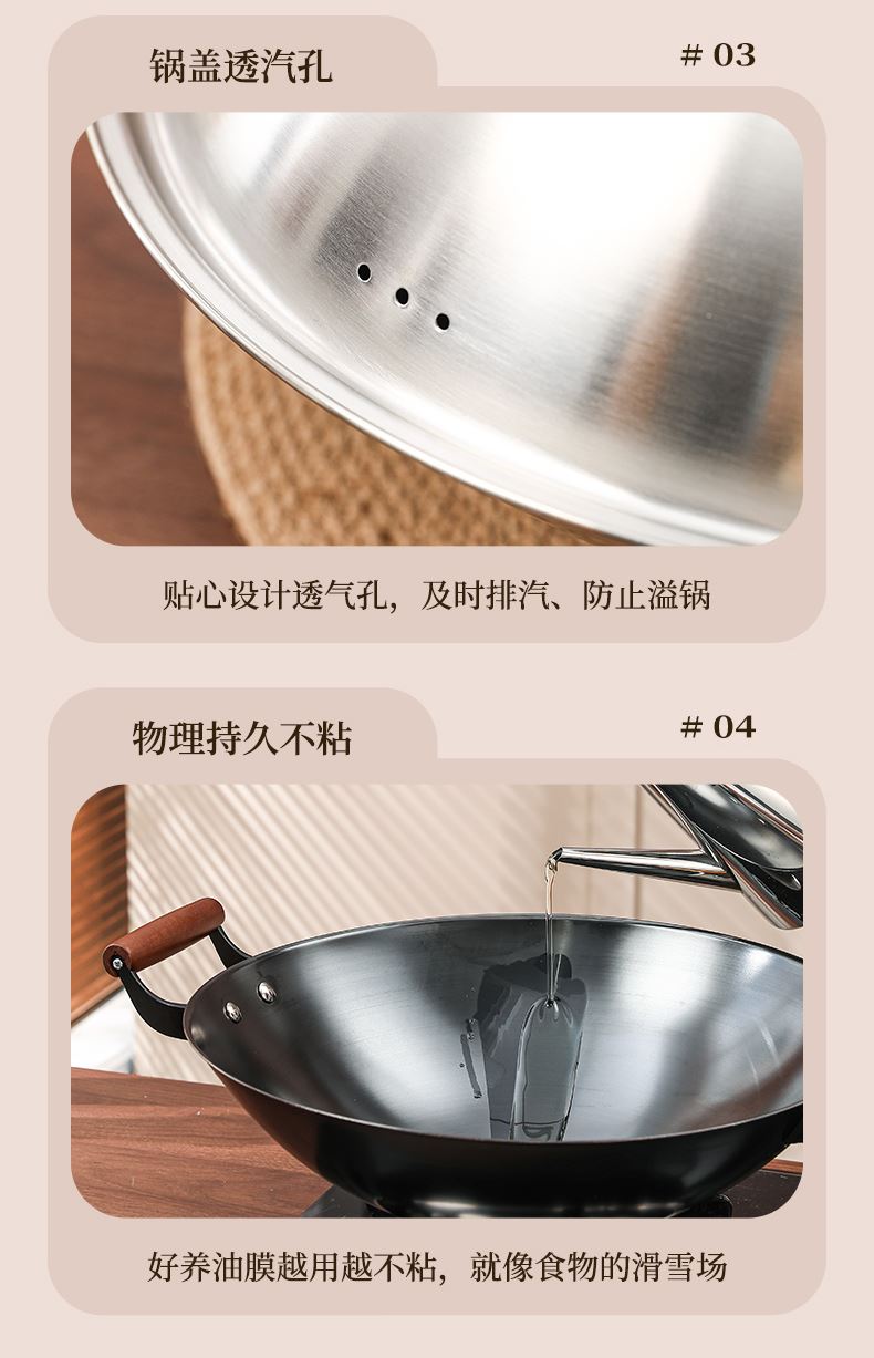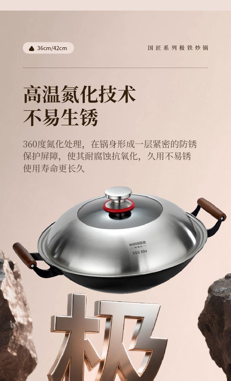 直径:42cm 净重:1.8kg 材质:精铁 ①采用高纯度精铁,纯度高达 99% 以上,品质好。 ②运用深层氮化工艺,具备耐磨耐腐蚀特性,长久使用不易生锈。 ③无涂层物理性持久不粘,健康安全有保障。 ④采用强力冷压技术,底厚壁薄,导热迅速。 ⑤双侧耳实木手柄,握持省力,隔热防烫。 ⑥拥有聚能螺纹外底,防滑且实用。