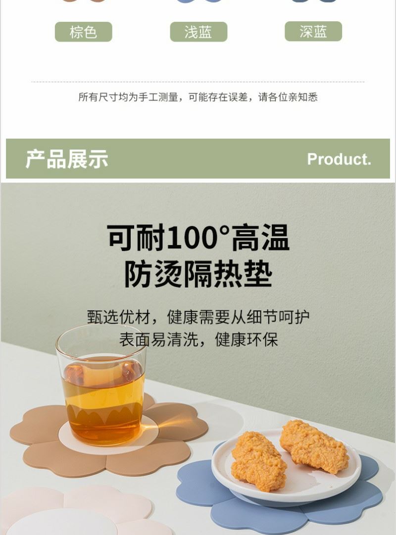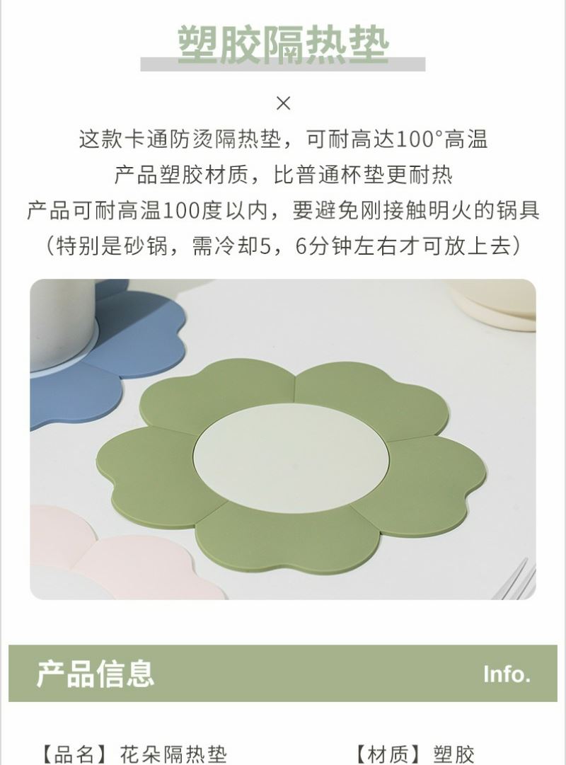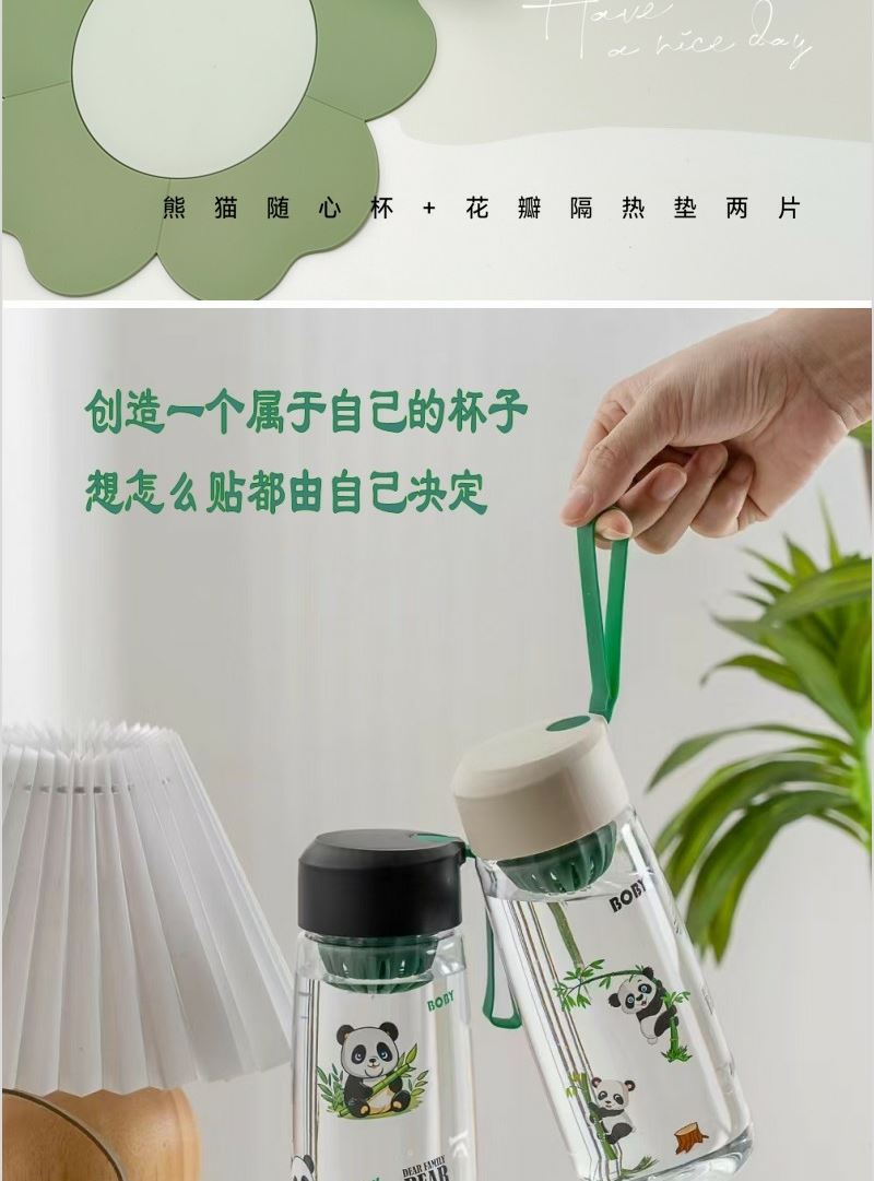 产品内容 1、 花瓣隔热垫×2片 单片尺寸18*18*0.3CM 2、 熊猫随心杯×1 杯体PC 杯盖PP 满杯容量650ML 外盒: 25×14×7cm 熊猫杯创意DIY设计随心贴 空白杯体 可定制专属的客户广告随心贴多重形式 随意打造专属水杯 花瓣隔热垫 采用立体造型结合优质软胶材质 优异品质 时尚外观