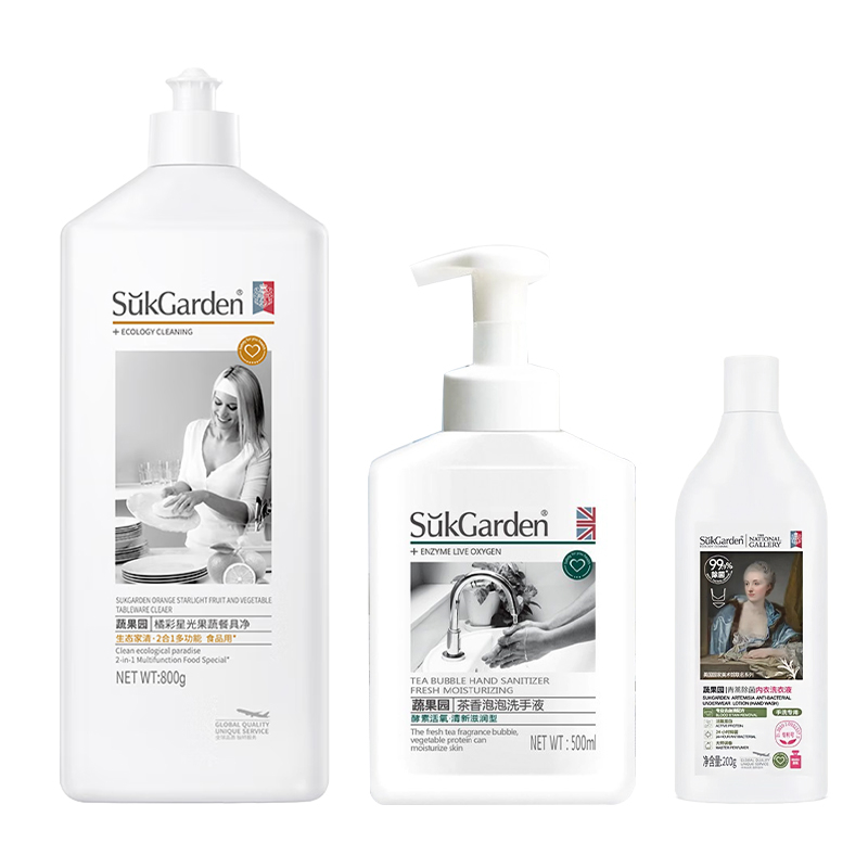SukGarden蔬果园橘采星光果蔬餐具净800g SukGarden蔬果园茶香泡泡洗手液500ml SukGarden蔬果园青蒿内衣洗衣液200g 小仓熊香氛洁厕液(蜜桃香)450g 小仓熊马桶挂篮-(单个装)50g 小仓熊除臭鞋球12g 赠:Sckoes诗寇丝木浆清洗海绵1块 小仓熊甄选礼盒(265*95*270mm)
