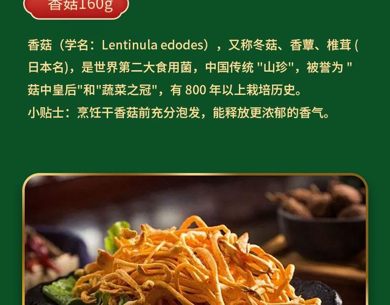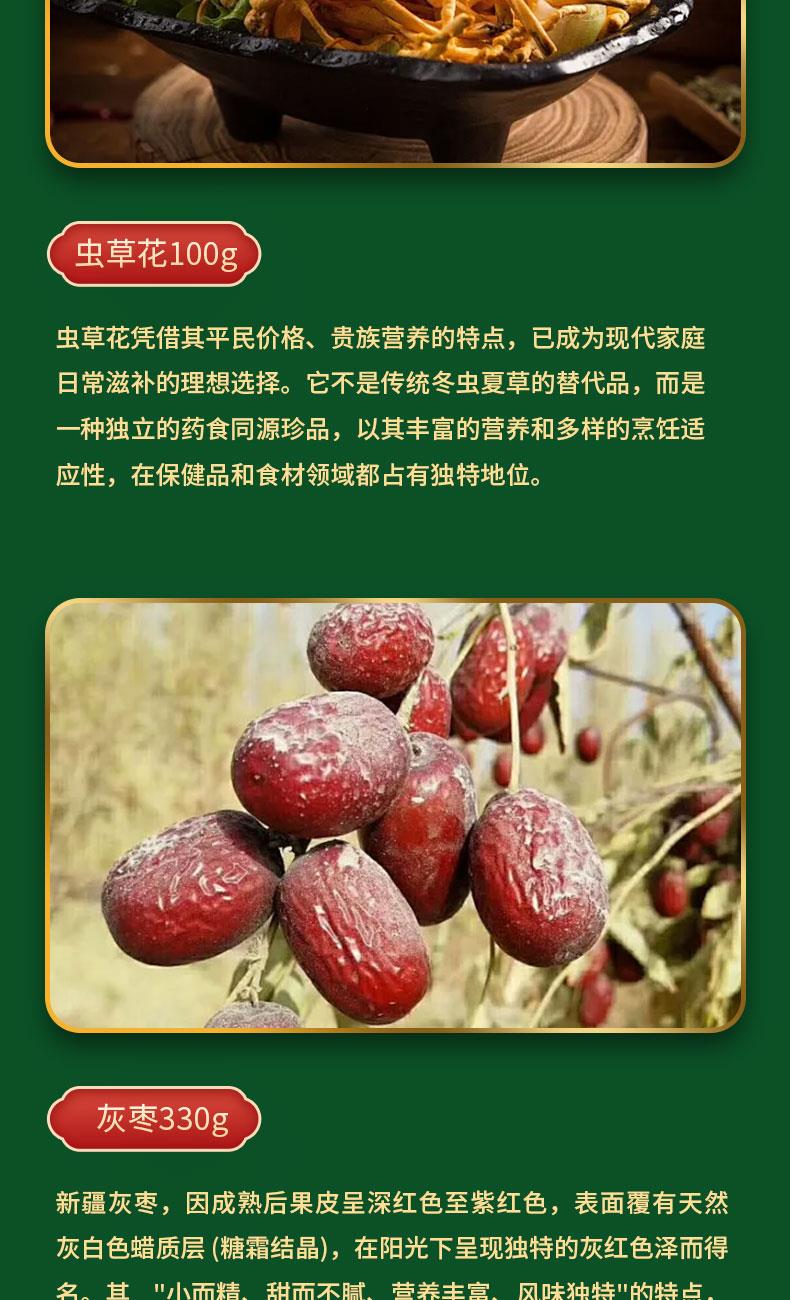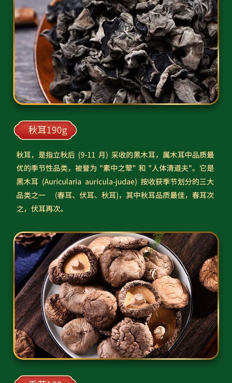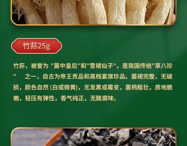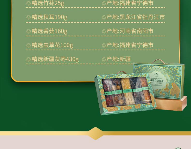 精选竹荪25g 产地: 福建省宁德市 精选秋耳190g 产地:黑龙江省牡丹江市 精选香菇160g 产地:河南省南阳市 精选虫草花100g 产地:福建省宁德市 精选新疆灰枣430g 产地:新疆