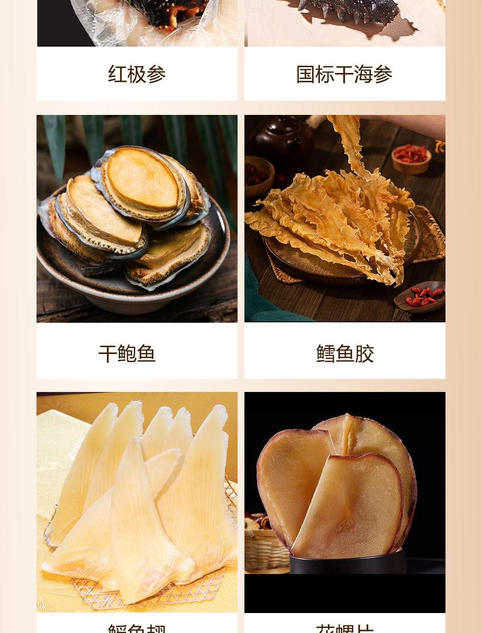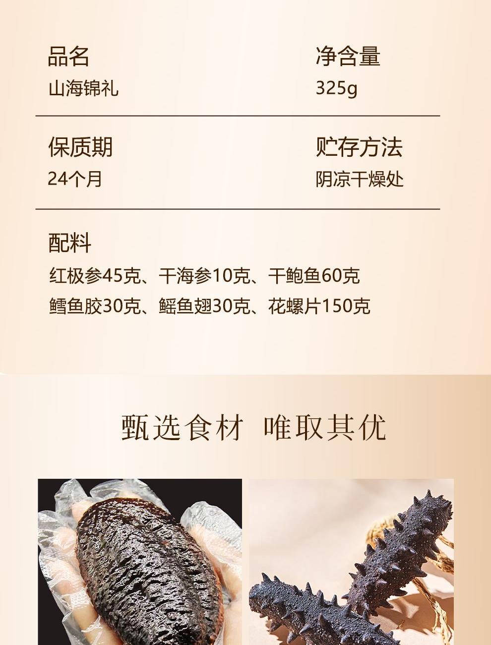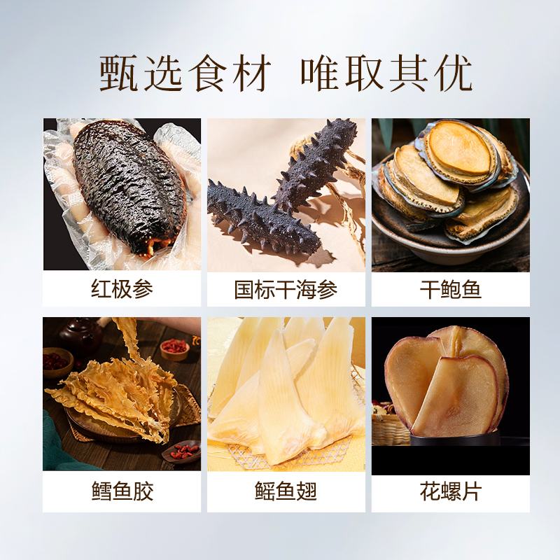规格:红极参45克、干海参10克、干鲍鱼60克、鳕鱼胶30克、鳐鱼翅30克、花螺片150克 卖点: ✅ 珍贵食材 精挑细选 ✅ 传统滋补 现代工艺 ✅ 高贵礼赠 彰显品味 ✅ 四季养生 倍添活力 一份礼盒,六重滋养,百分诚意🎉