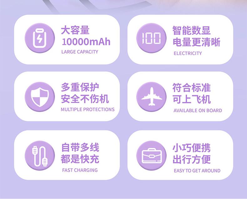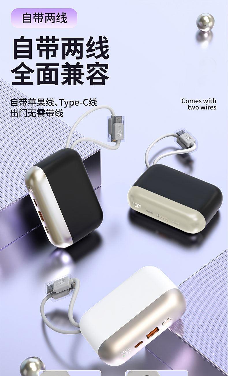 便捷收纳设计,自带苹果Lightning线和Type-C双充电线多接口设计满足4台设备同时充,防过流过压使充电更放心。