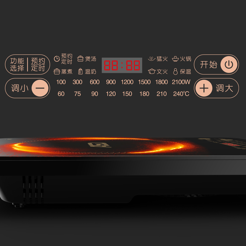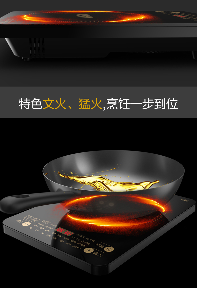 产品型号:AI-F21C217 产品功率:2100W 额定电压:220V 额定频率:50Hz 彩盒尺寸:341*101*416 产品净重:2.65kg 1、欧克微晶面板,防刮耐磨易清洁。 2、三级能耗,高效节能,空间利用大。 3、四位数码显示,特设文火,猛火。 4、特色文火、猛火,烹饪一步到位 5、多段火力,自由选择。