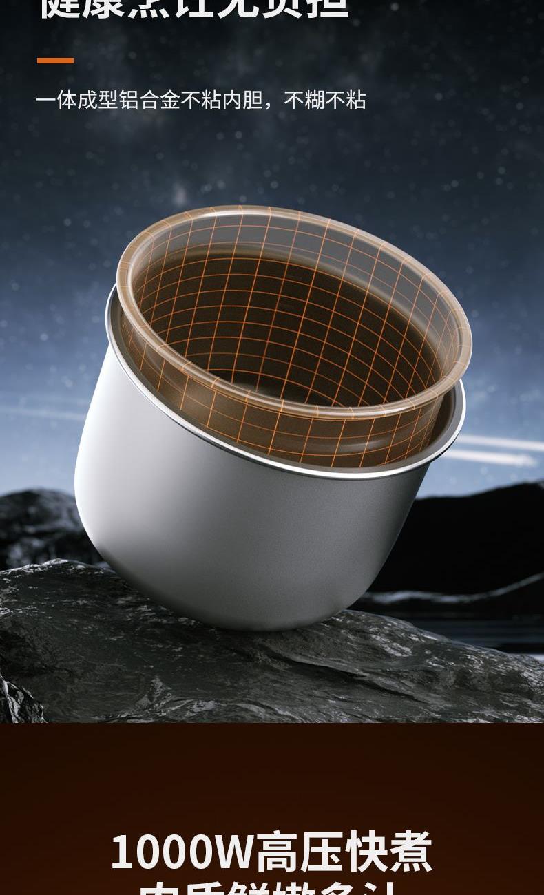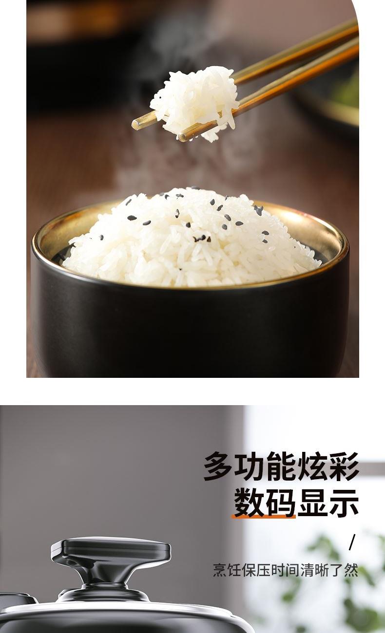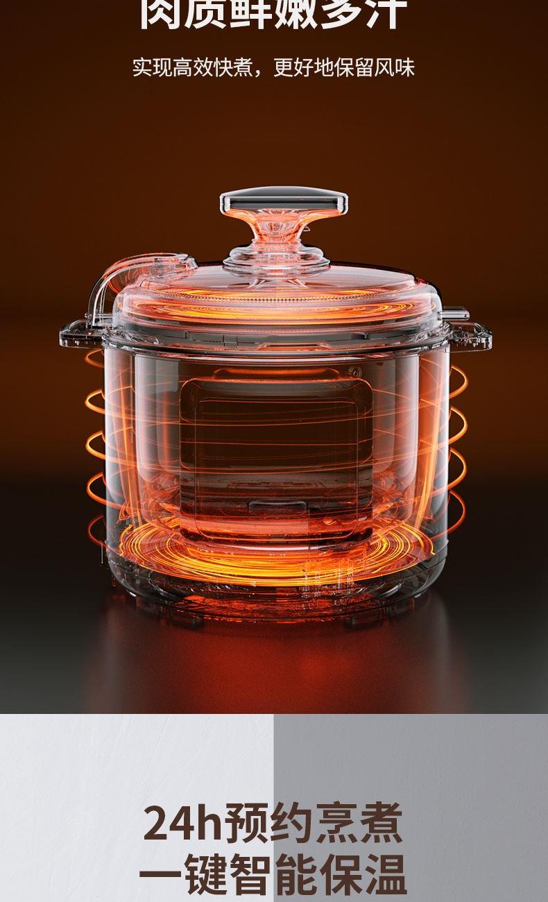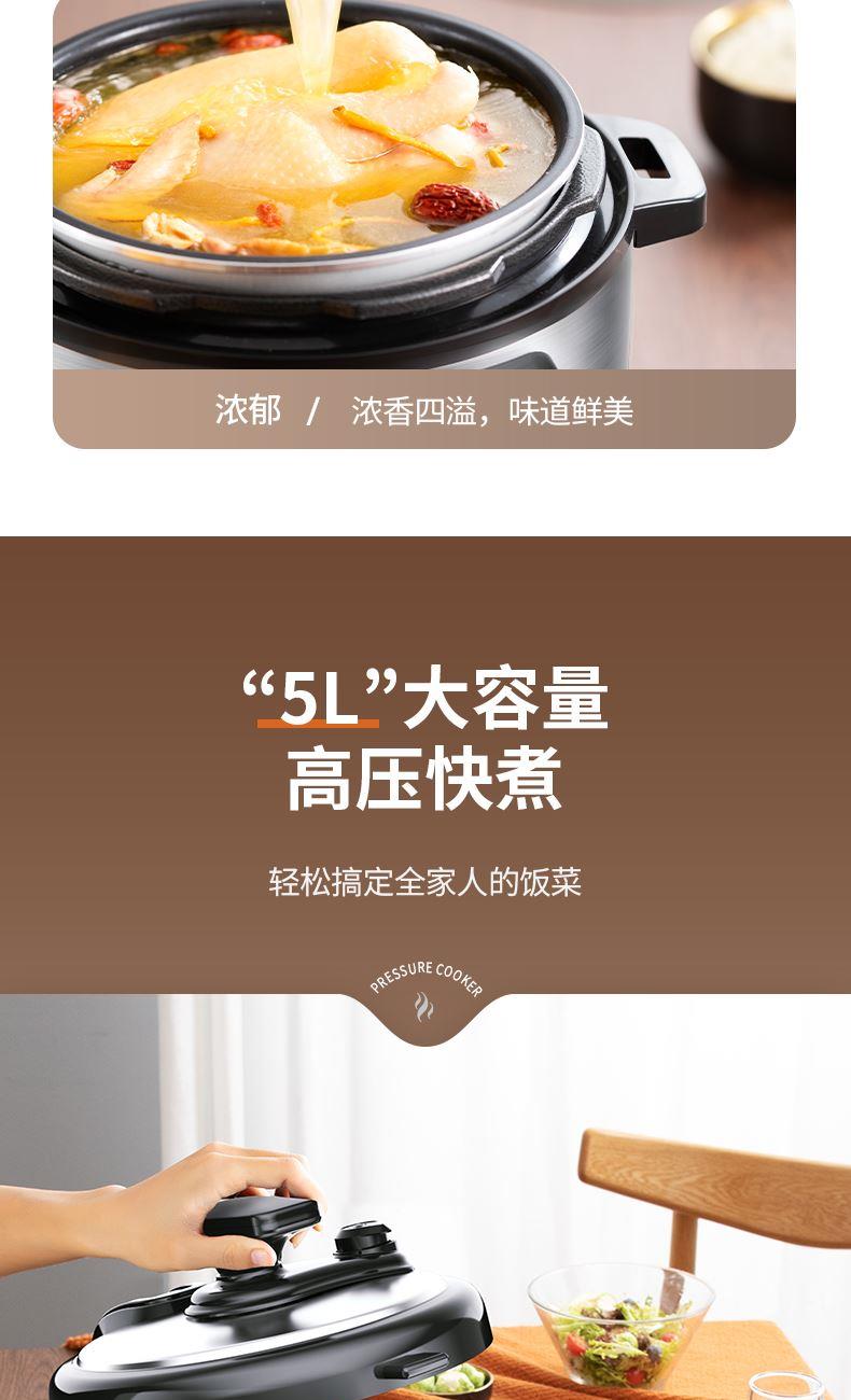 额定功率:1000W 产品容量:5.0L 额定电压:220V~ 产品频率:50Hz 产品净重:3.6kg 产品毛重:4.3kg 整箱重量:9.6kg 装 箱 数:2台/箱 高压烹饪高压焖炖 省时快焖,大压力释放,保留食材营养 口感可调&旋转开合清香、标准、浓郁多重口感可选,锅盖旋转,开盖收汁 轻触功能选择多功能操控,多位数码显示,24小时预约 多重安全防护微电脑控制安全泄压多重安全防护