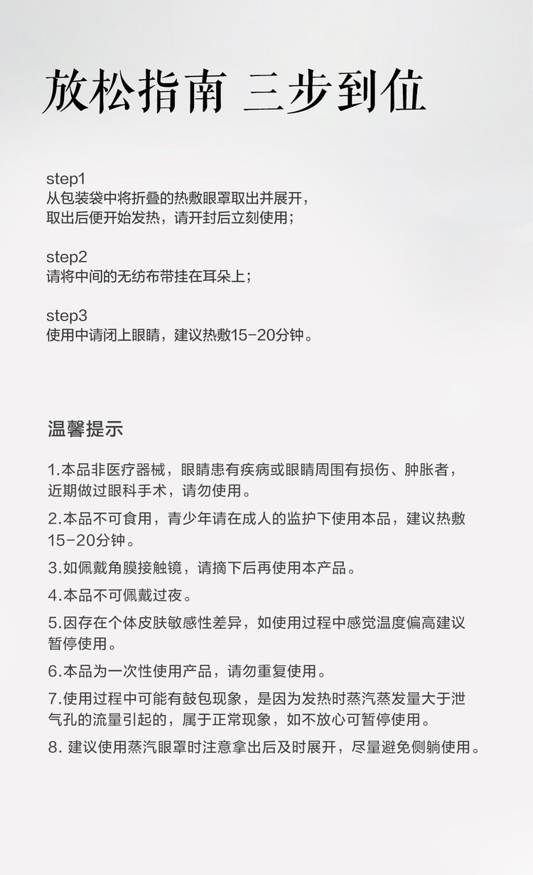 规格:1片/袋 10袋/盒 香型:艾草 保质质:3年 1.添加百合、叶黄素、枸杞、等多重润养成分,以草木精华温养眼部。 2.绵密蒸汽热敷,愉悦疲劳双眼。 3.圈内位置不发热,呵护双眼。 4.弱弹力耳挂,弹力适中,适合大小脸型;曲线贴合工艺,营造宁静场域。 5.吸嗅沉浸,枕着江南眠,感受东方香
