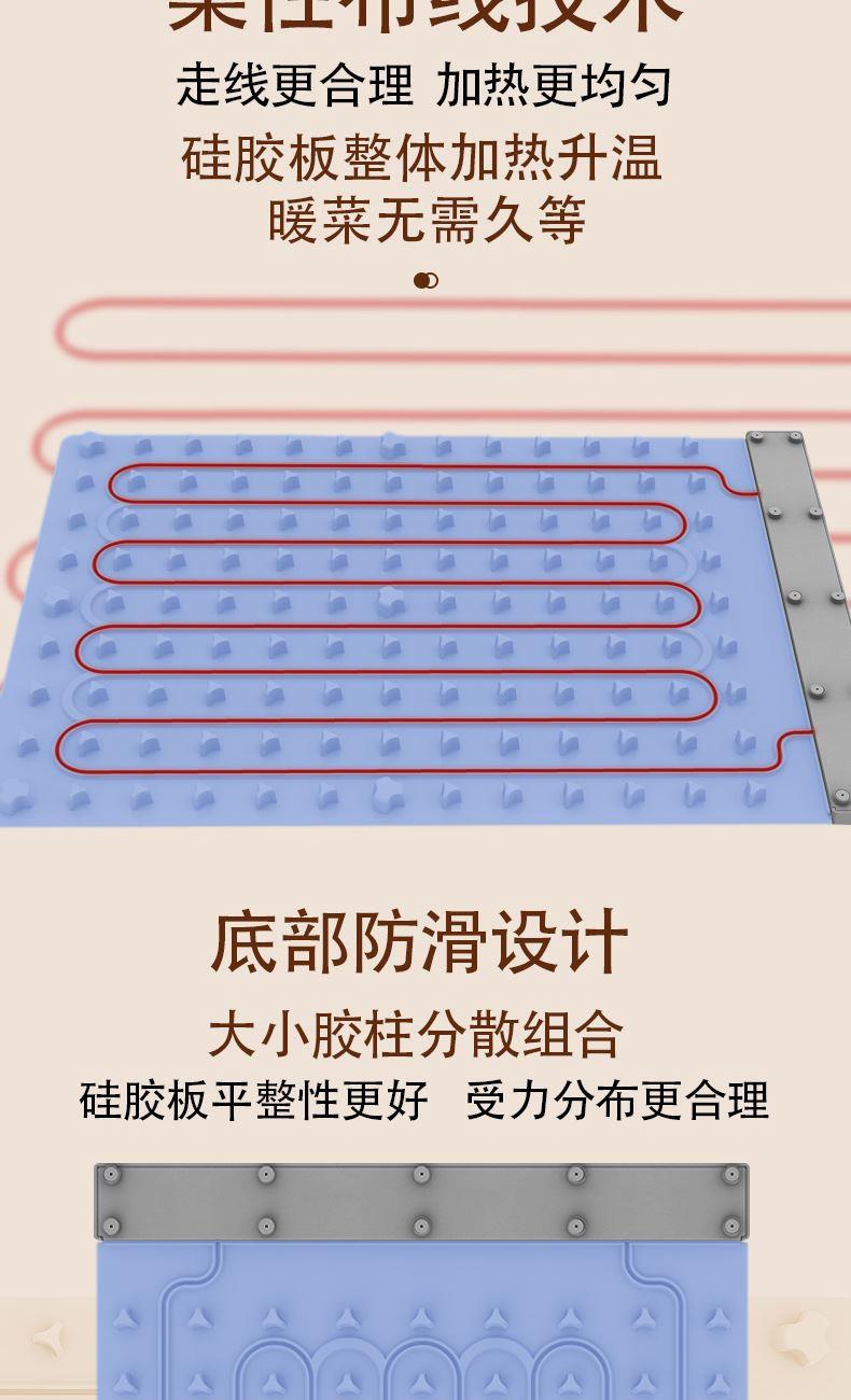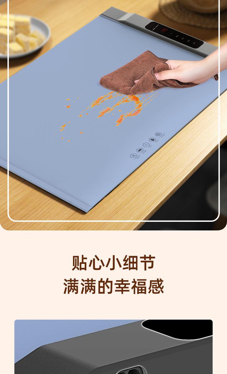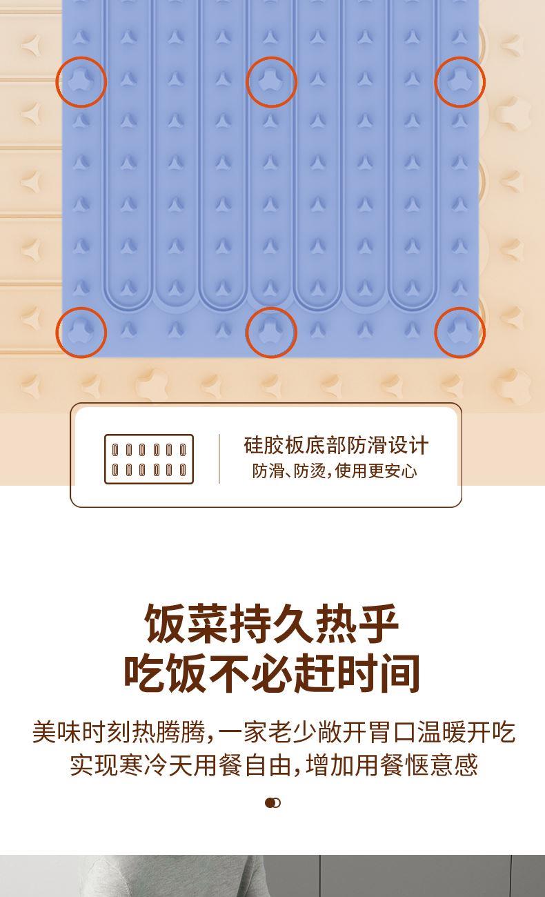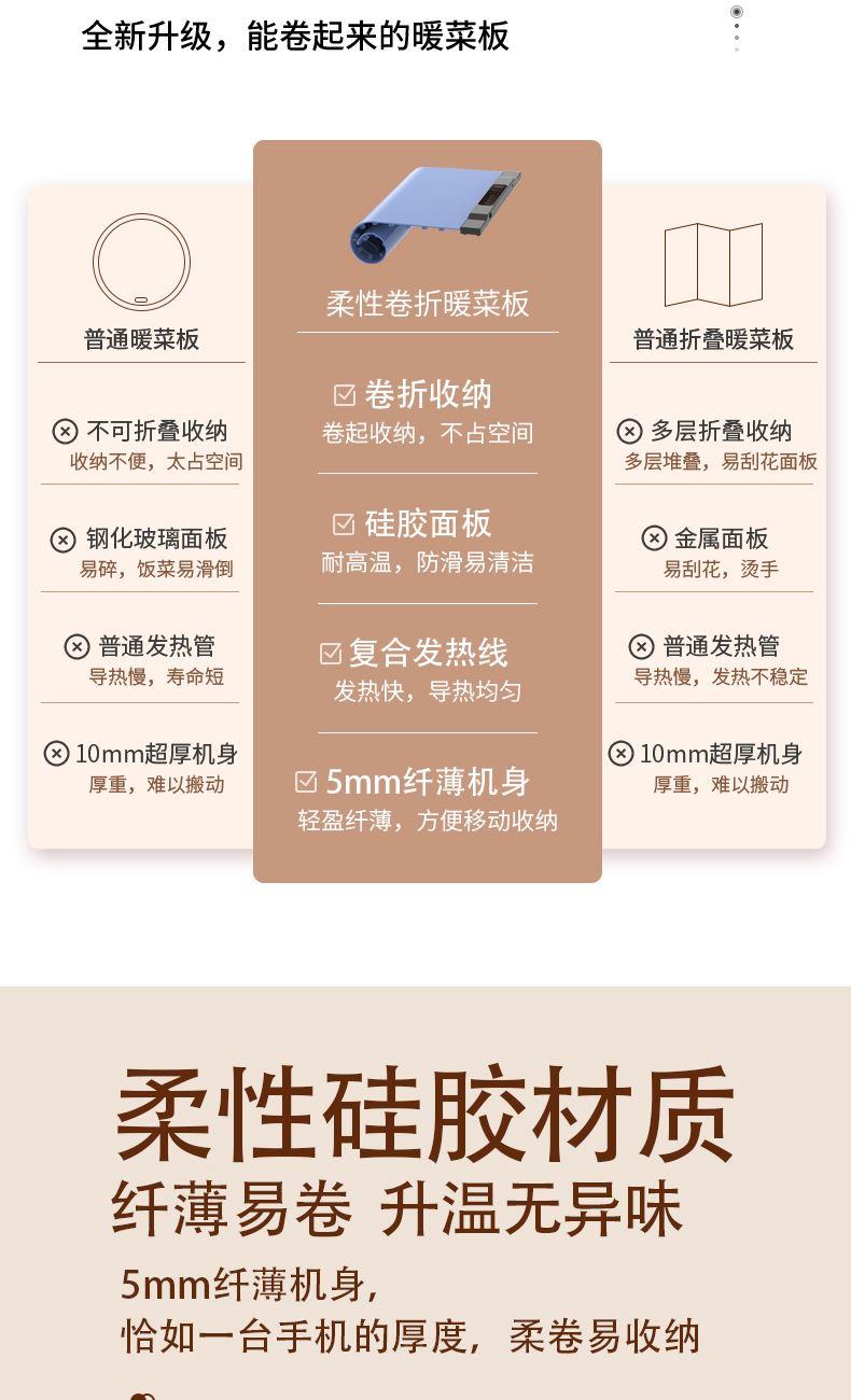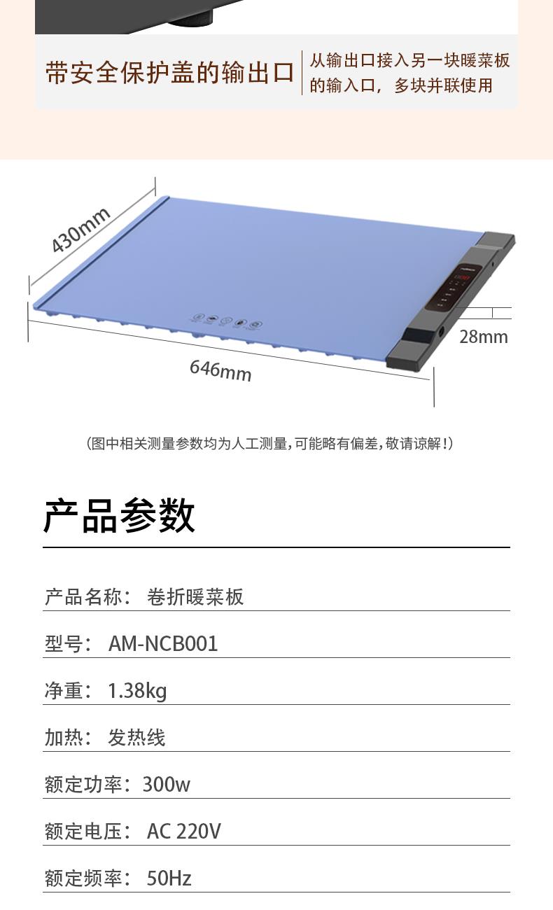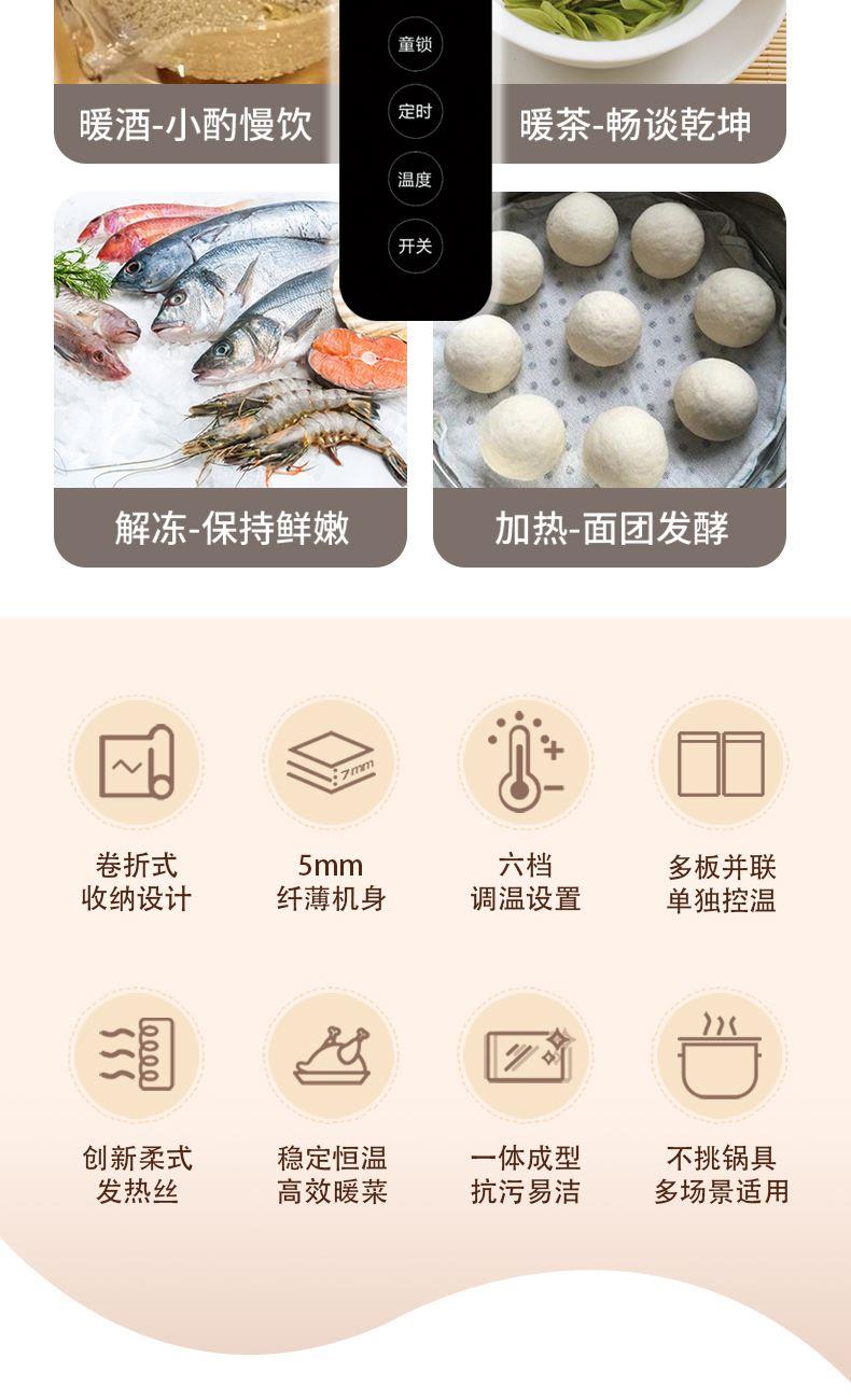 档位:6档 额定电压:220V 功率:300W 产品重量:1.3 KG 产品尺寸:646*430*28mm 产品材质:塑料,硅胶 可多个并联组合使用 六档调温设置,60-120度控温,掌握食物理想温度 卷折式收纳,不占空间
