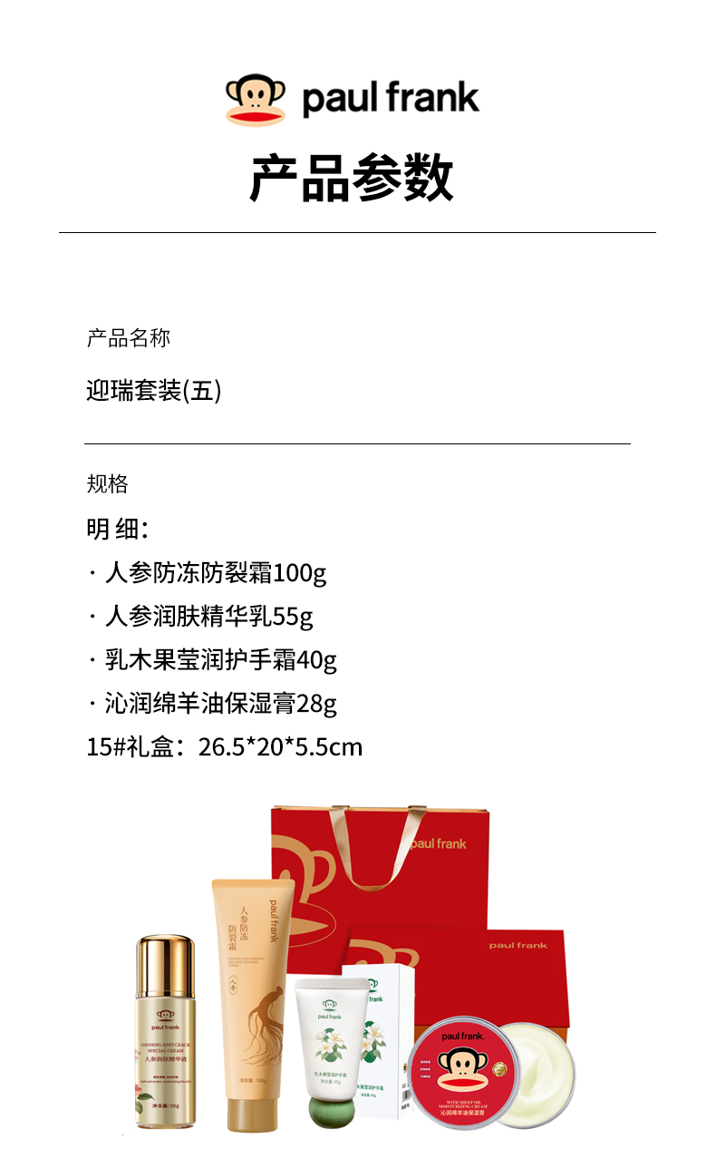 人参防冻防裂霜100g 人参润肤精华乳55g 乳木果莹润护手霜40g 沁润绵羊油保湿膏28g 15#礼盒:26.5*20*5.5cm
