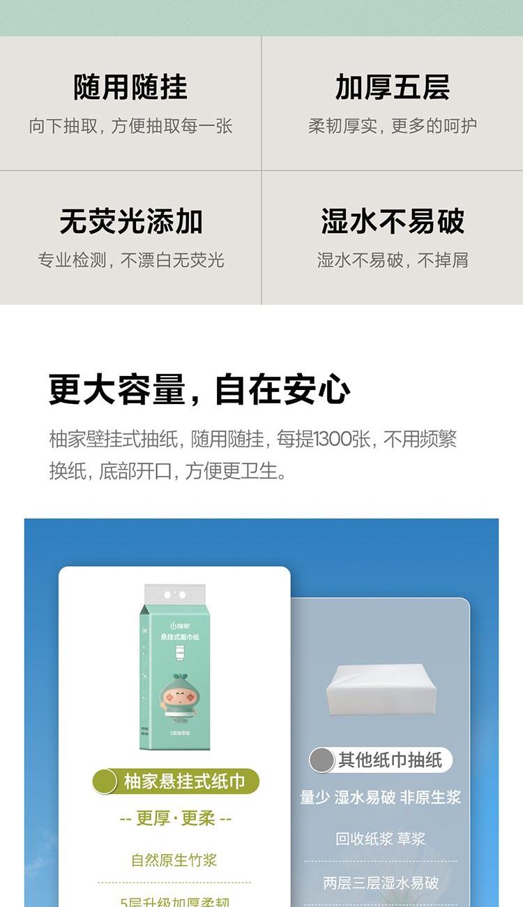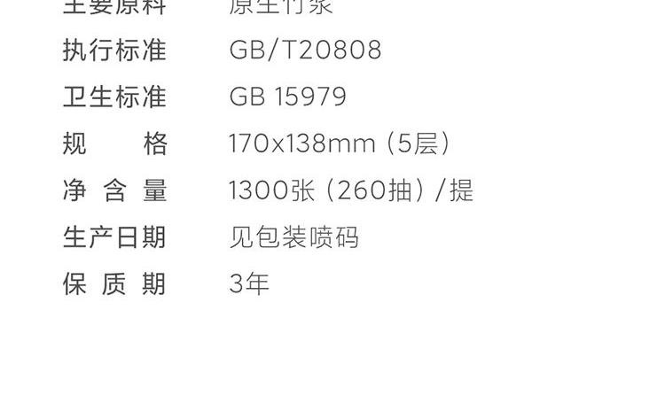产品型号:533772 绿色 产品规格:170*138mm/张,5层加厚,260抽/提 产品重量:0.4kg左右 主要原料:原生竹浆 产品保质期:3年