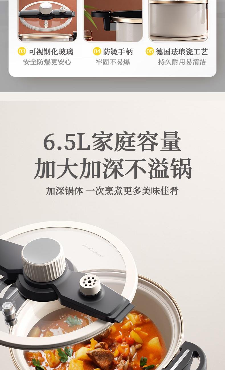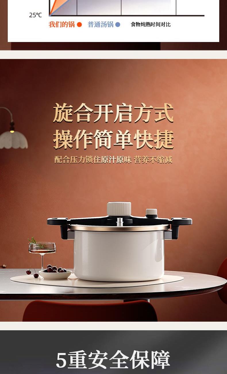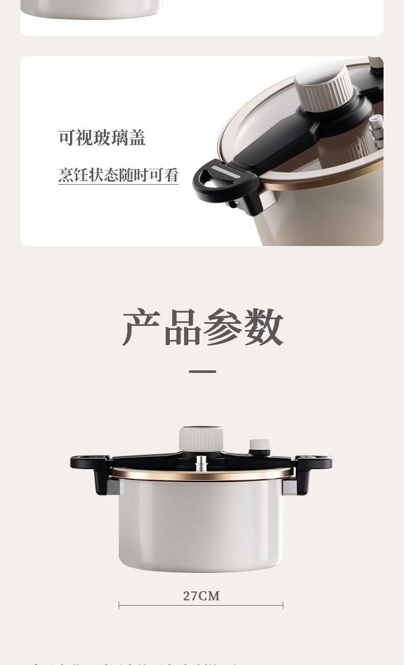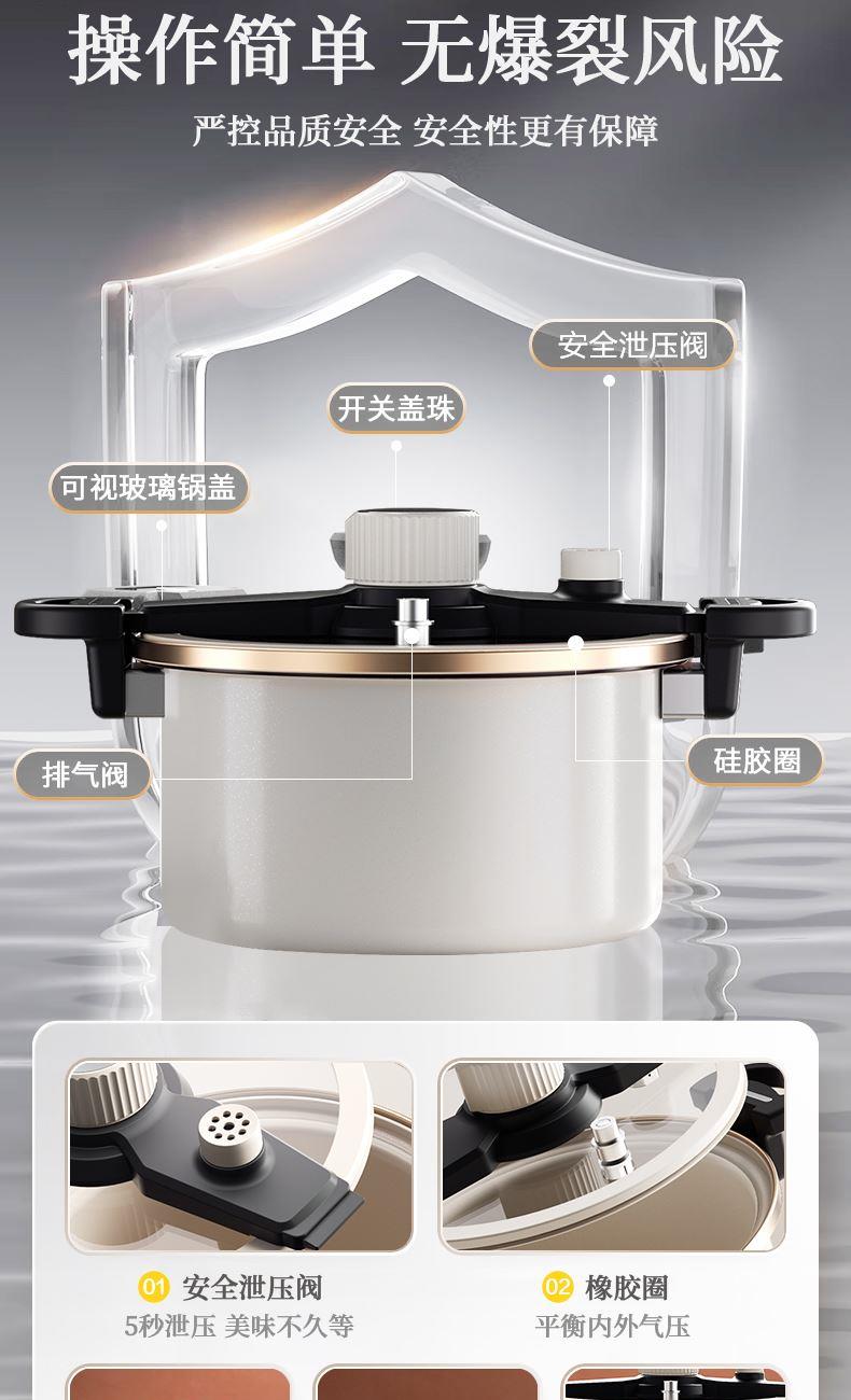 4、珐琅瓷釉锅体、可视硅胶玻璃盖、防堵泄压阀、旋转自动开关、滑动伸缩锁扣等,安全多重防护系统 ,安全无忧,重新定义压力锅安全标准。