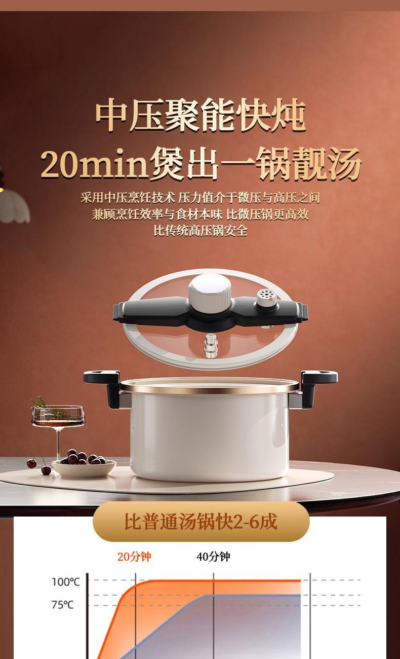 3、中等压力珐琅锅,采用中压烹饪技术,压力值介于微压与高压之间,兼顾烹饪效率与食材本味,比微压锅更高效,比传统高压锅安全 。