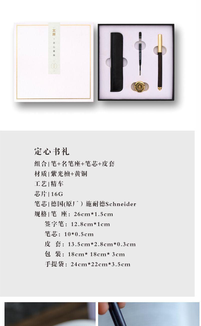 组合|笔+名笔座+笔芯+皮套 材质|紫光檀+黄铜 工艺|精车 芯片|16G 笔芯|德国(原厂)施耐德Schneider 规格|笔 座:26cm*1.5cm 签字笔:12.8cm*1cm 笔芯:10*0.5cm 皮 套:13.5cm*2.8cm*0.3cm 包 装:18cm* 18cm* 3cm 手提袋:24cm*22cm*3.5cm