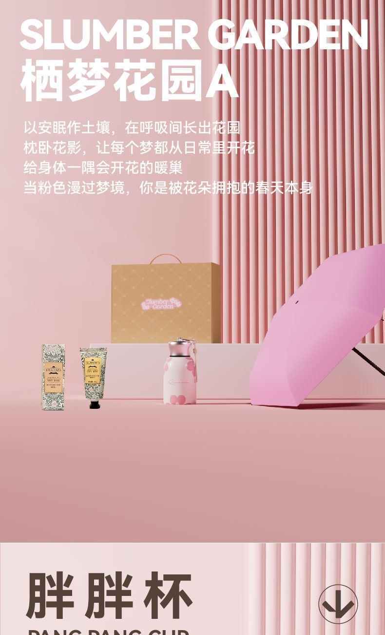 以安眠作土壤,在呼吸间长出花园 枕卧花影,让每个梦都从日常里开花 给身体一隅会开花的暖巢 当粉色漫过梦境,你是被花朵拥抱的春天本身 内配: 配置一:胖胖杯x1 配置二:晴雨伞x1 配置三:嘉乐玛护手霜x 1