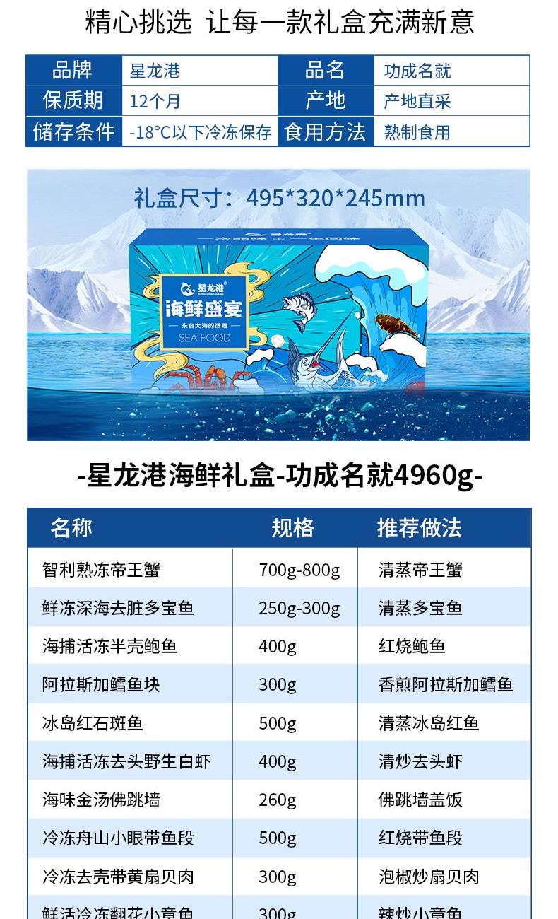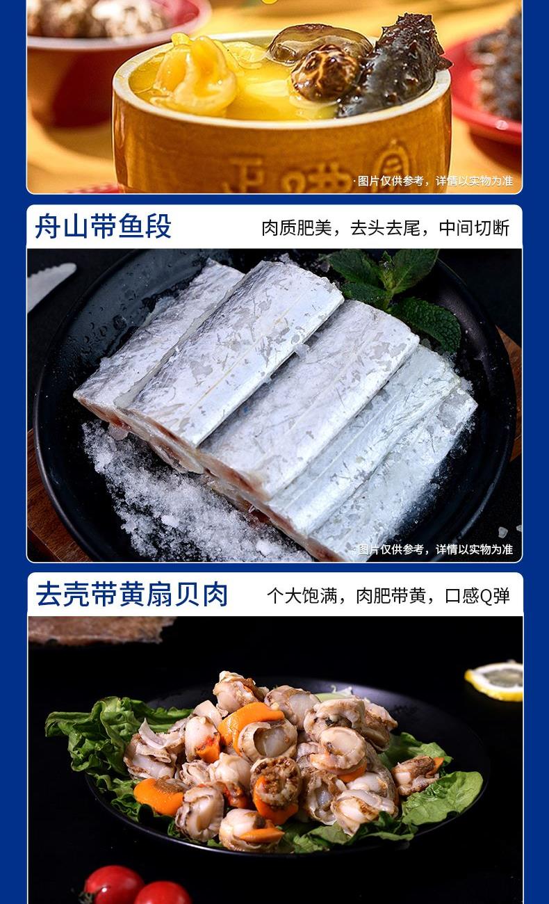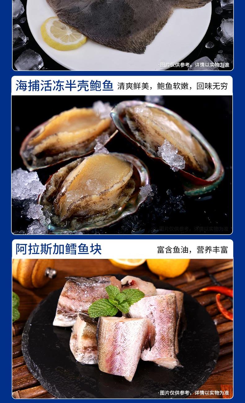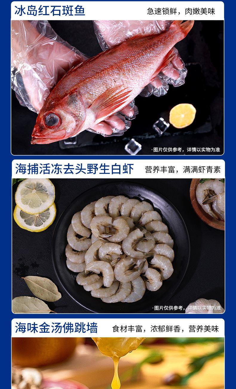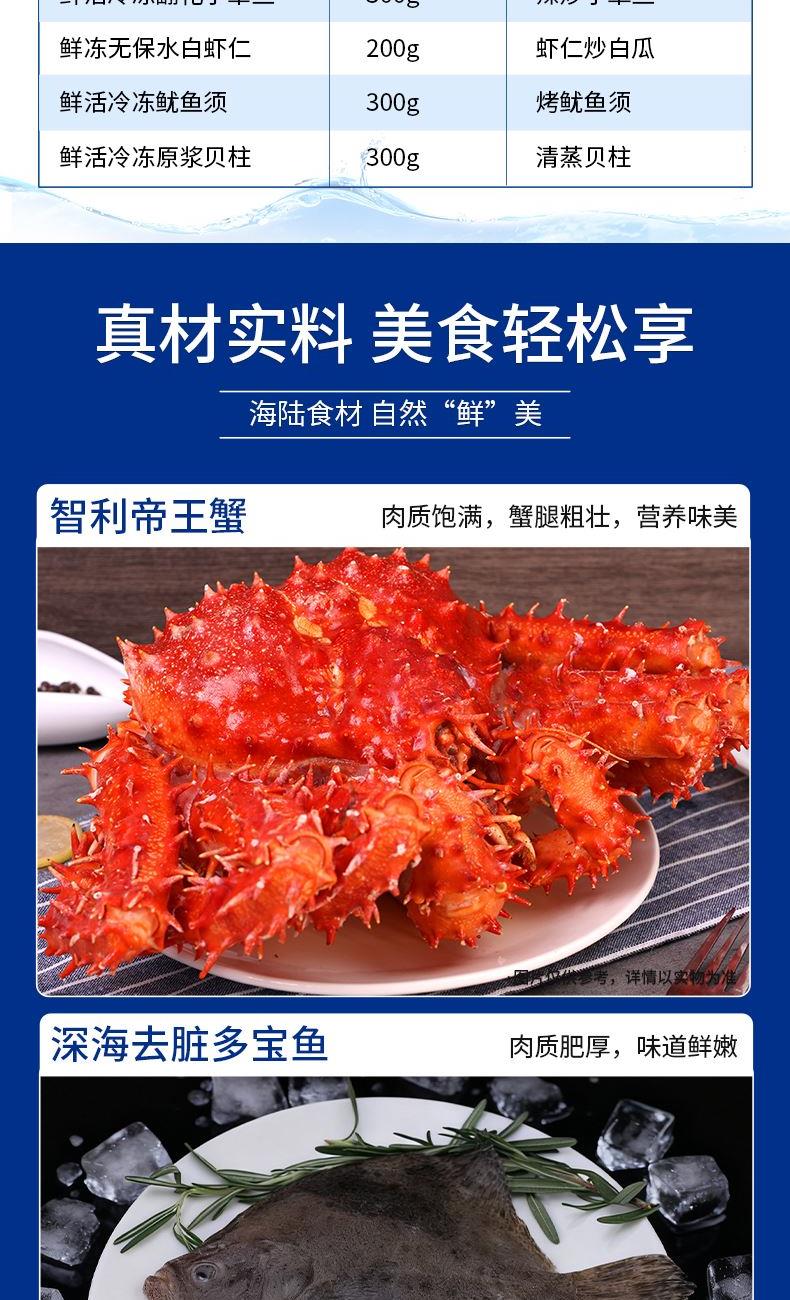 智利熟冻帝王蟹700g-800g 鲜冻深海去脏多宝鱼250g-300g 海捕活冻半壳鲍鱼400g 阿拉斯加鳕鱼块300g 冰岛红石斑鱼500g 海捕活冻去头野生白虾400g 海味金汤佛跳墙260g 冷冻舟山小眼带鱼段500g 冷冻去壳带黄扇贝肉300g 鲜活冷冻翻花小章鱼300g 鲜冻无保水白虾仁200g 鲜活冷冻鱿鱼须300g 鲜活冷冻原浆贝柱300g