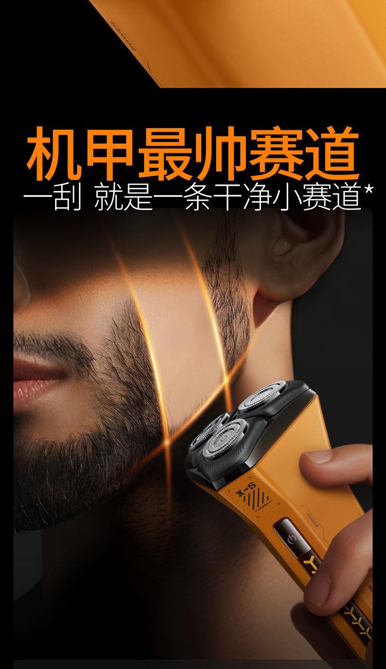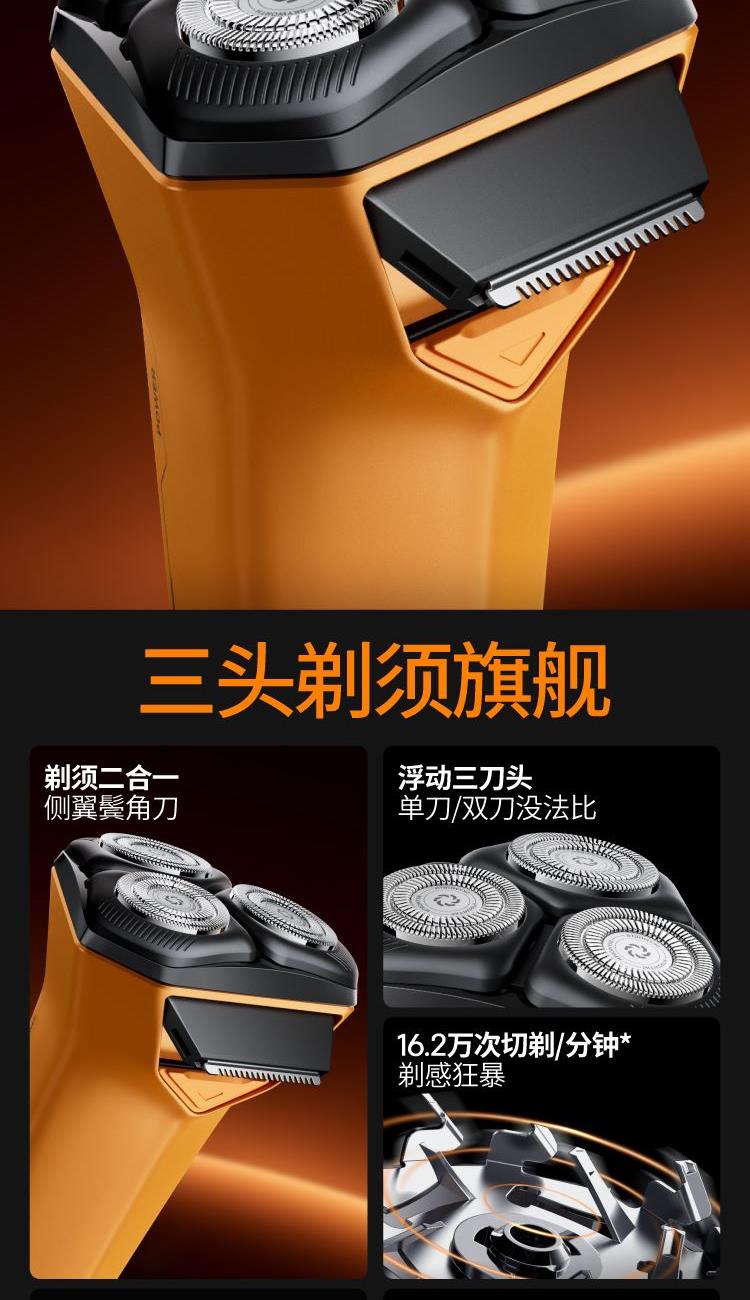 电机转速:9000转/min 刀头材质:精钢 刀头数量:3个 产品尺寸:149*57*64mm 产品净重:0.14kg 电压:5V 防水等级:IPX7,可全身水洗 充电时间:1.5小时快充 续航:60天 1、剃须二合一,侧翼鬓角刀; 2、浮动3刀头,54叶刀片,剃须效率更高; 3、9000转高速静噪电机,够性能才够快; 4、 顺滑贴肤,干湿两剃; 5、IPX7级防水等级,可全身水洗;