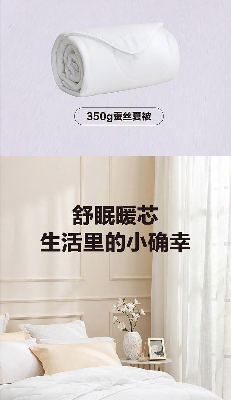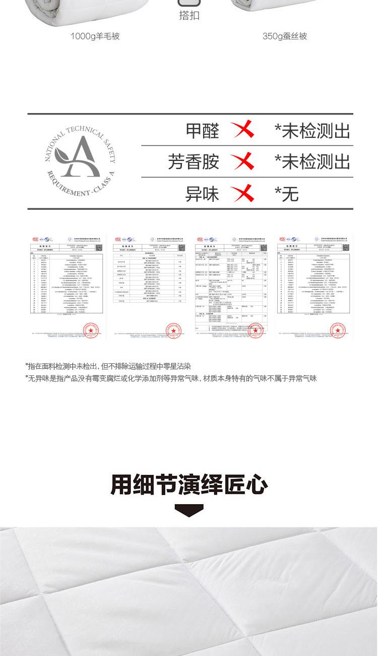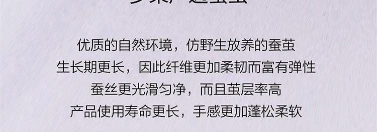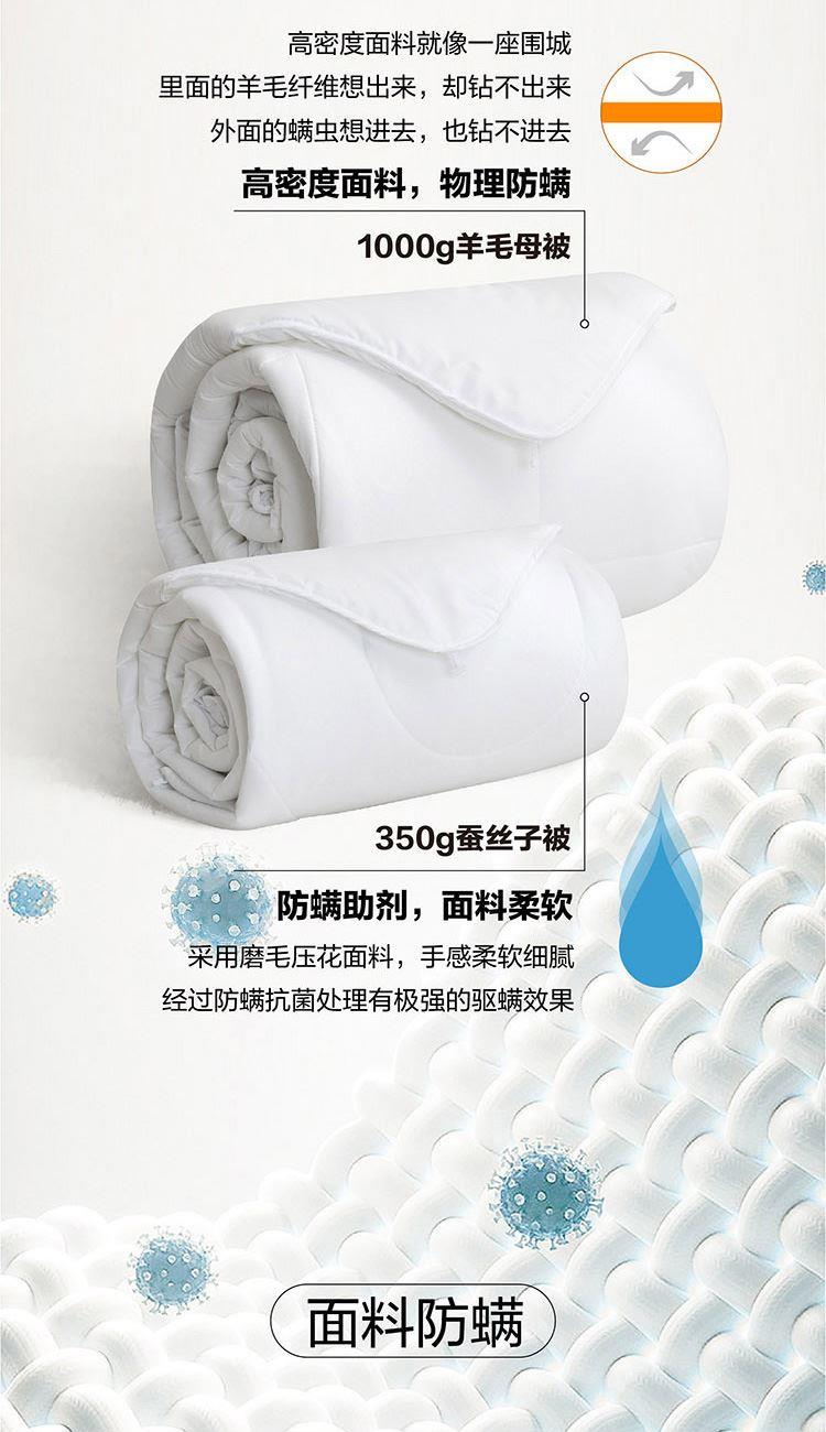子被填充柞蚕丝,吸湿透气,体感舒爽 ,亲肤贴身,适合夏季使用;母被填充羊毛,≥45mm的羊毛长度,形成高度自然卷曲,使羊毛纤维间形成空气层,可有效锁住热量防止失散;