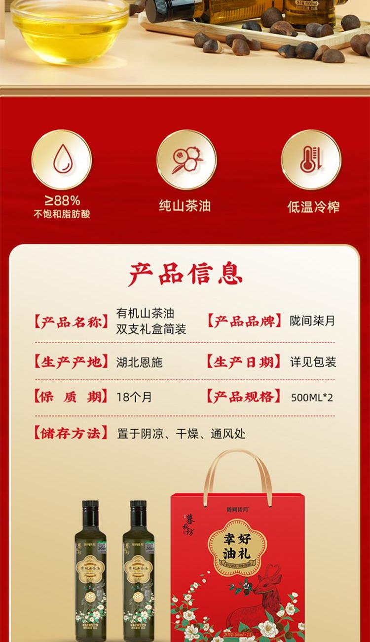 1、纯正有机,物理压榨,世界硒都,恩施原产; 2、脂肪酸黄金配比1:8:1,符合欧米伽膳食食用油标准; 3、不饱和脂肪酸含量为88.9%,居所列食用油首位; 4、高烟点,少油烟。
