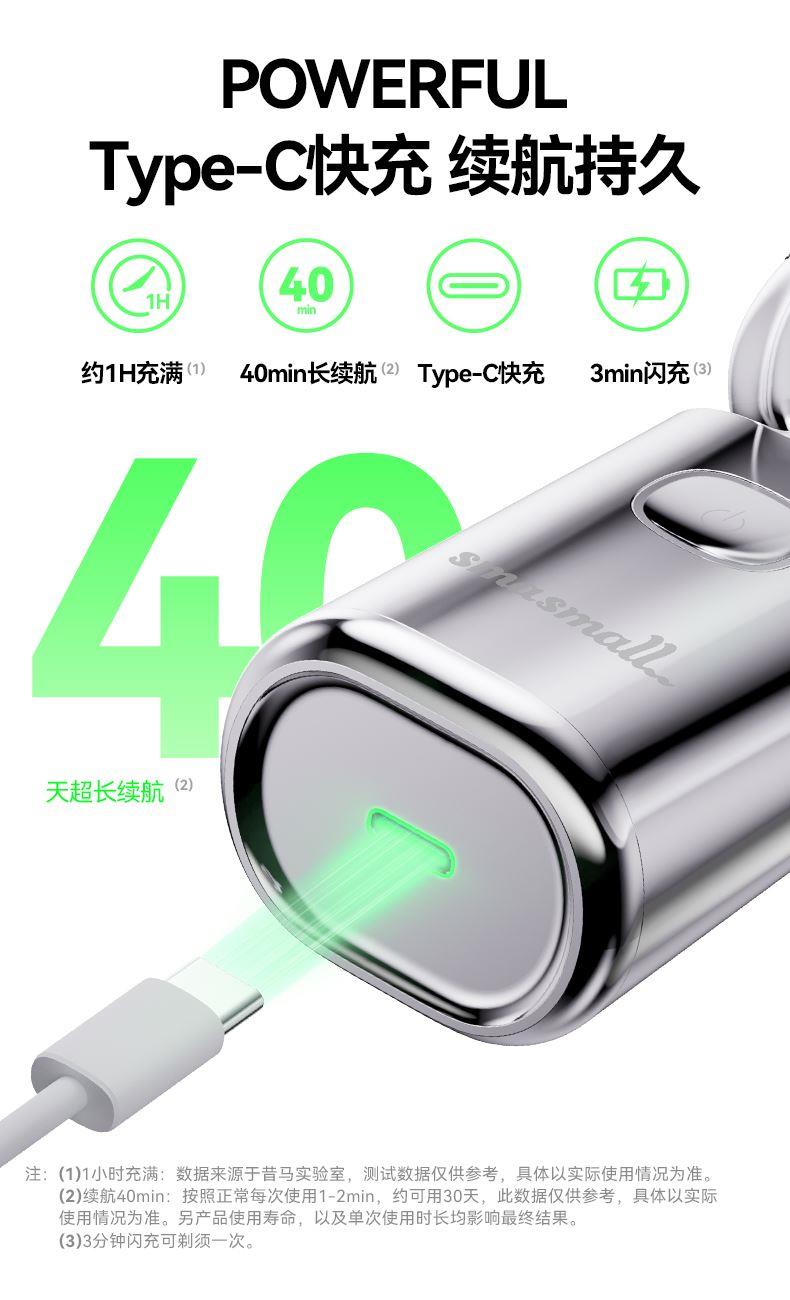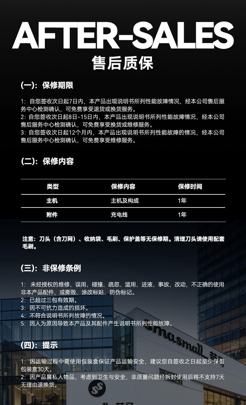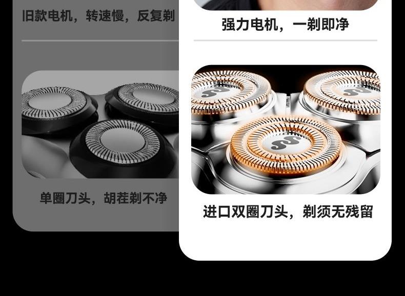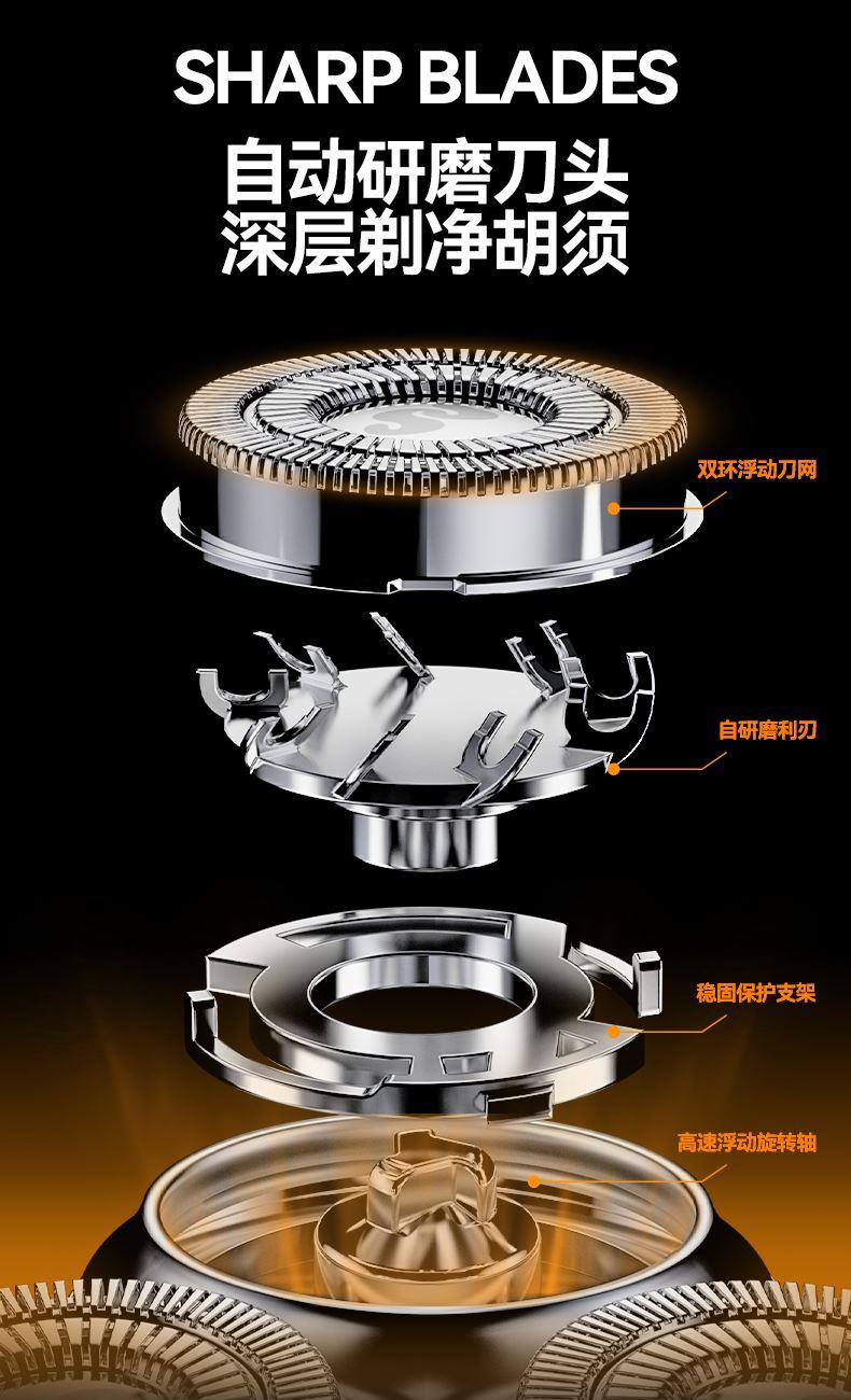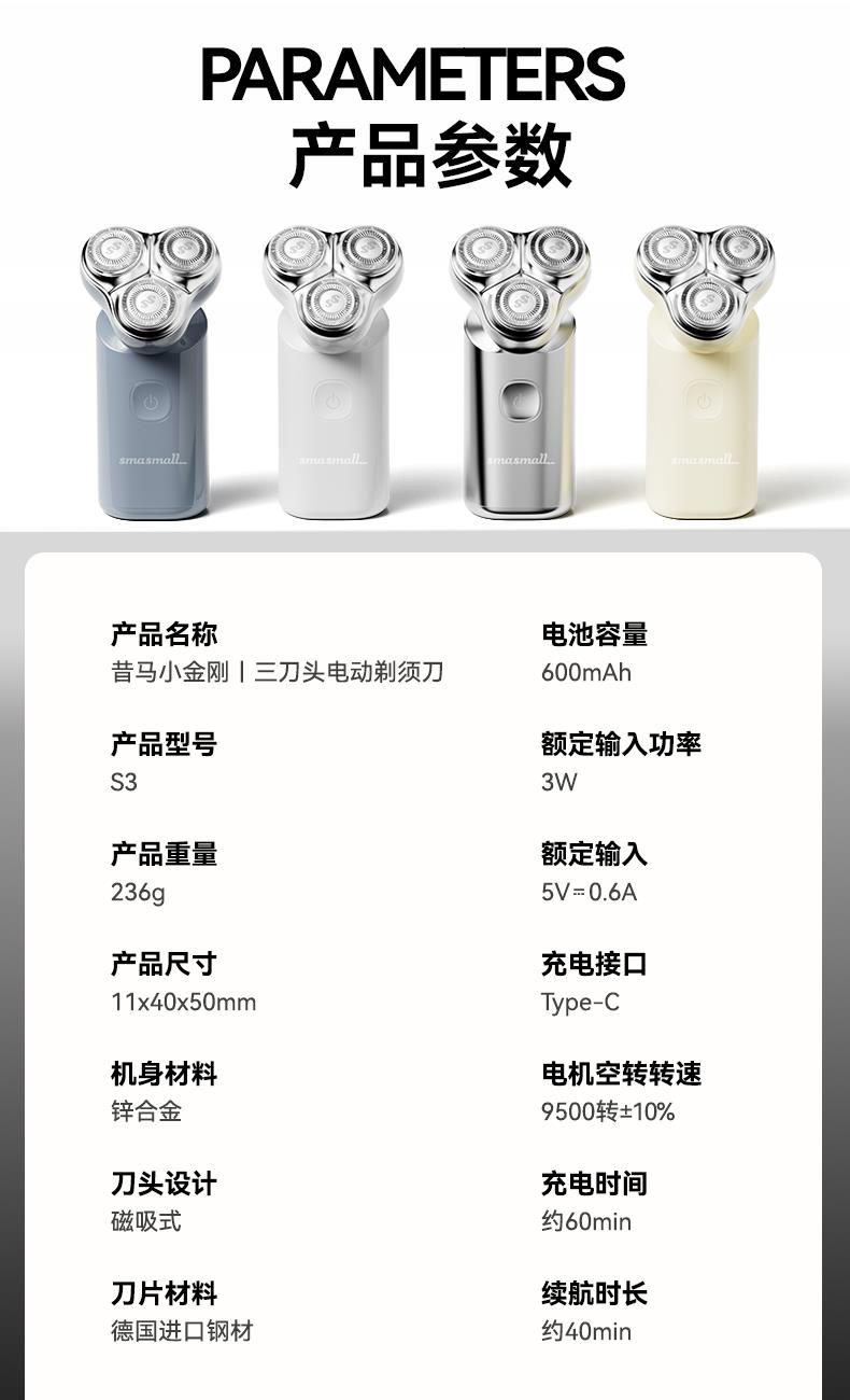 电池:600毫安 充电接口:Tpye-C 续航时间:40min左右 充电时长:1小时左右 防水等级:ipx7级防水 刀片材质:德国进口钢材