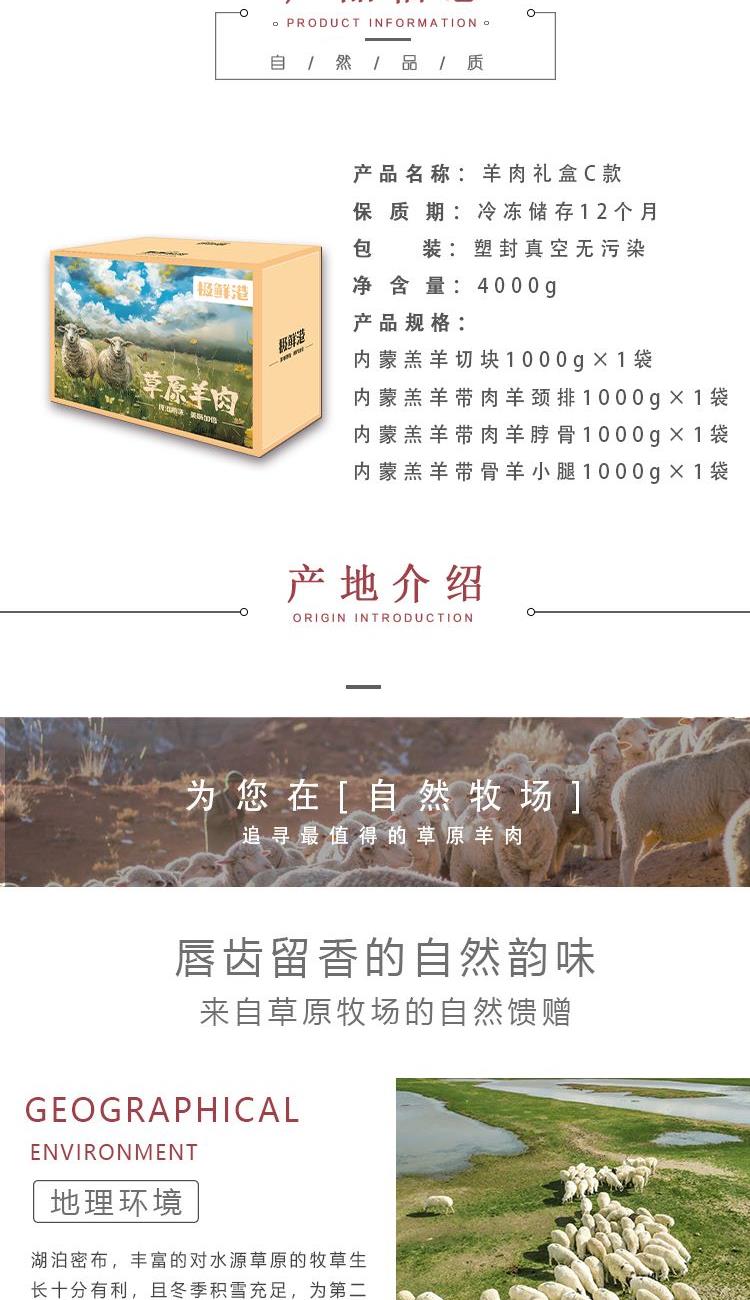 产品:羊肉礼盒C款 保质期:冷冻储存12个月 包装:塑封真空无污染 净含量:4000g 产品规格: 内蒙盖羊切块1000gx1袋 内蒙盖羊带肉羊颈排1000gx1袋 内蒙盖羊带肉羊脖骨1000gx1袋 内蒙羔羊带骨羊小腿1000gx1袋 农场放养管理,造就每一块珍品羊肉 专业冷链屠率工艺,48小时经过排酸经冷却的排酸过的羊肉肉质细腻有利于人体消化吸收,食用更健康 及时时间送达 保证新鲜