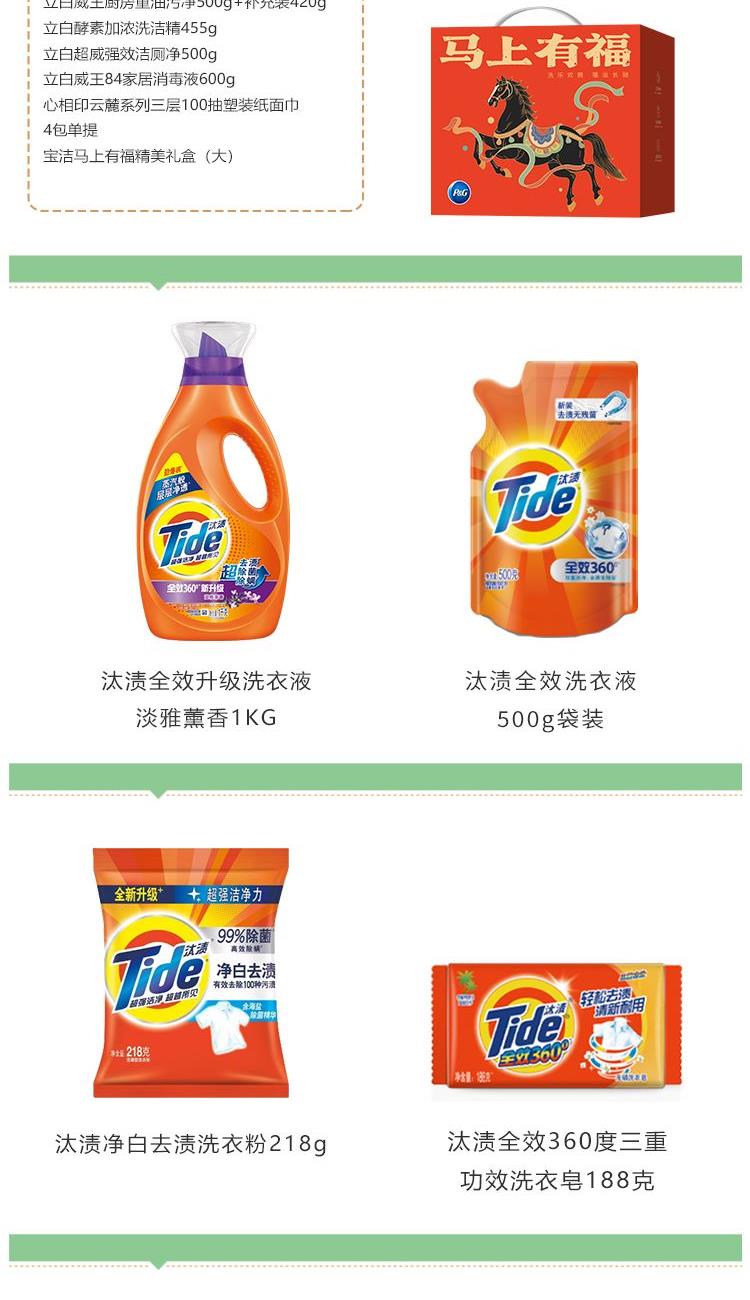 汰渍2合1深层洁净洗衣液1KG 汰渍全效洗衣液500G袋装 汰渍净白去渍洗衣粉218g 汰渍全效360度三重功效洗衣皂188克 立白威王厨房重油污净500g+补充装420g 立白酵素加浓洗洁精455g 立白超威强效洁厕净500g 立白威王84家居消毒液600g 心相印云麓系列三层100抽塑装纸面巾4包单提 宝洁马上有福精美礼盒(大)