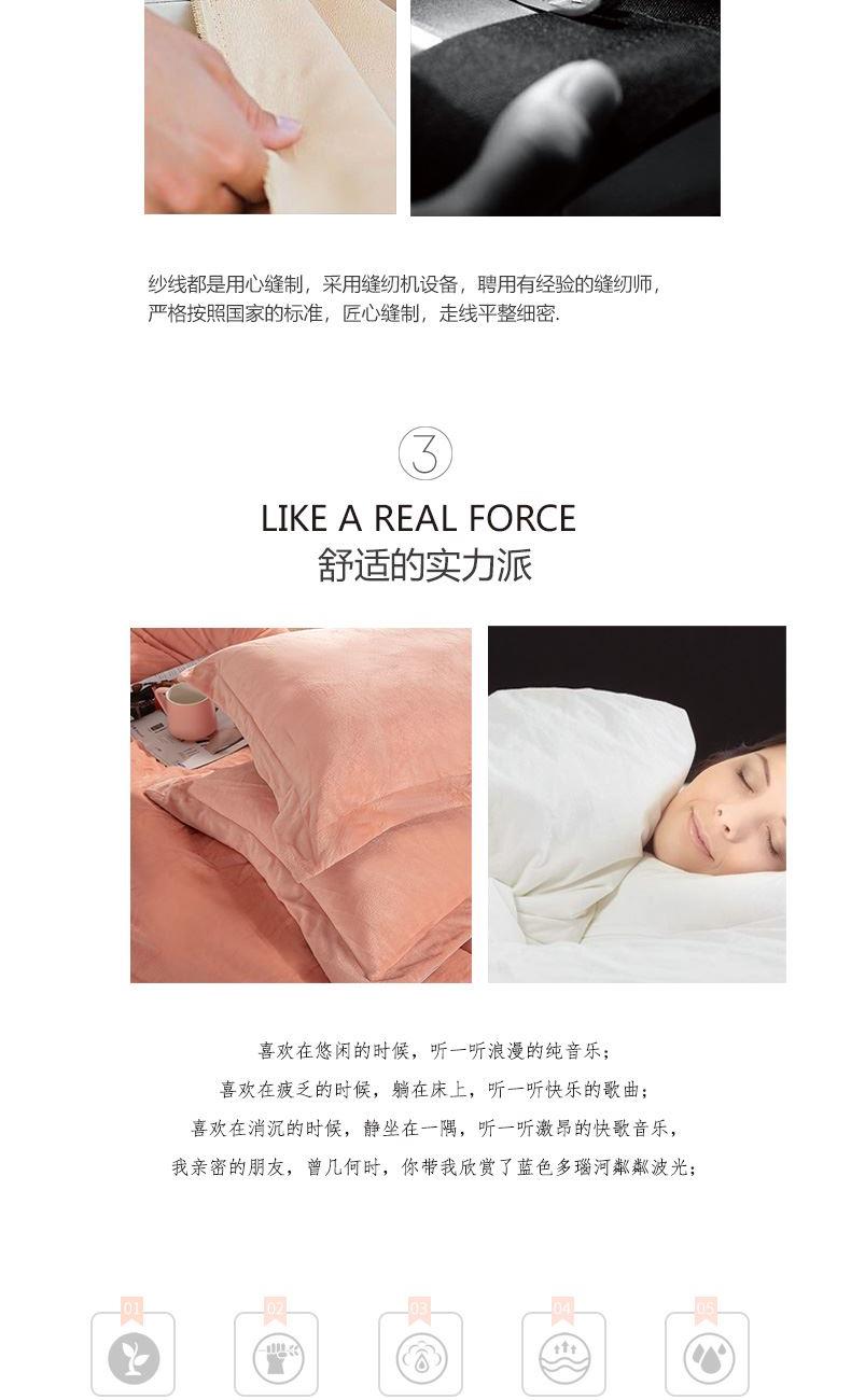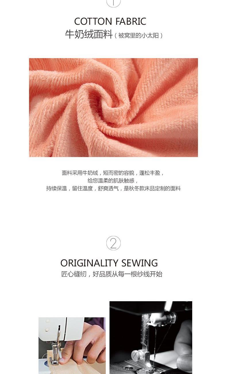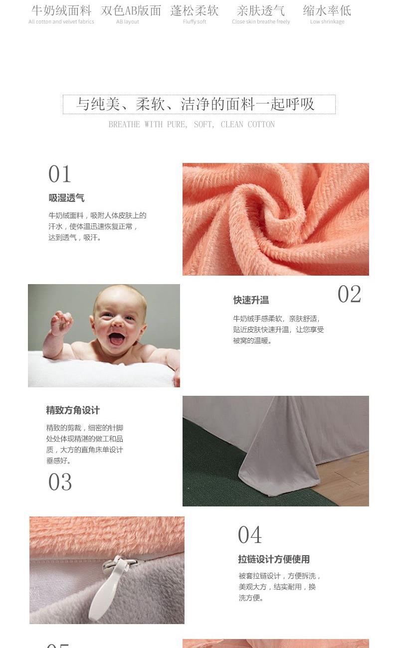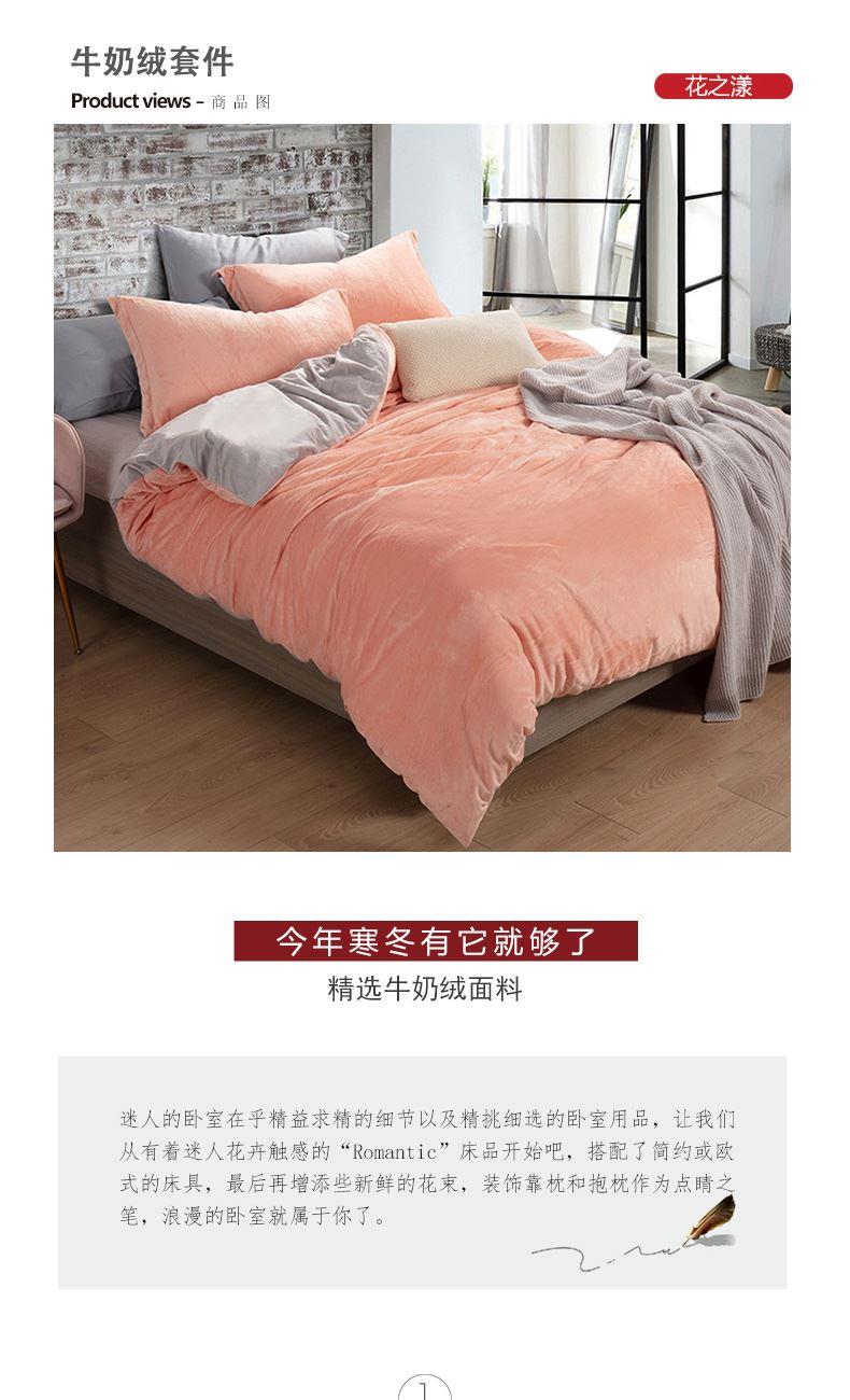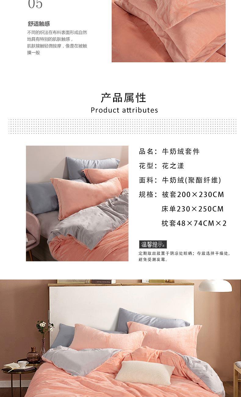花 型:花之漾 规 格:被套200×230cm 床单230×250cm 枕套48×74cm×2 面 料:牛奶绒 细腻值得您无限的宠爱 牛奶绒面料细腻的绒毛、质地柔软舒适、有着棉花般的柔软性、亲肤性好,亲和肌肤贴身、手感厚实、干爽透气、能帮助寒冷的夜晚锁住更多的温暖