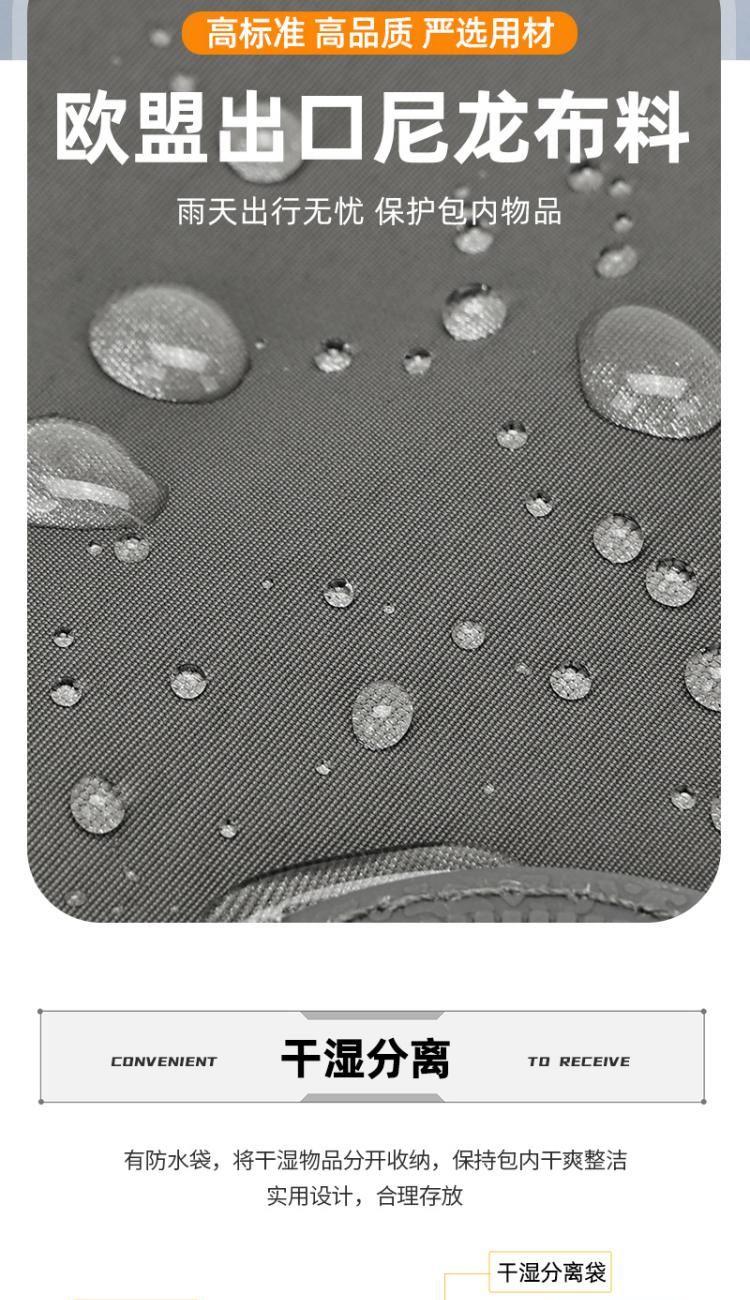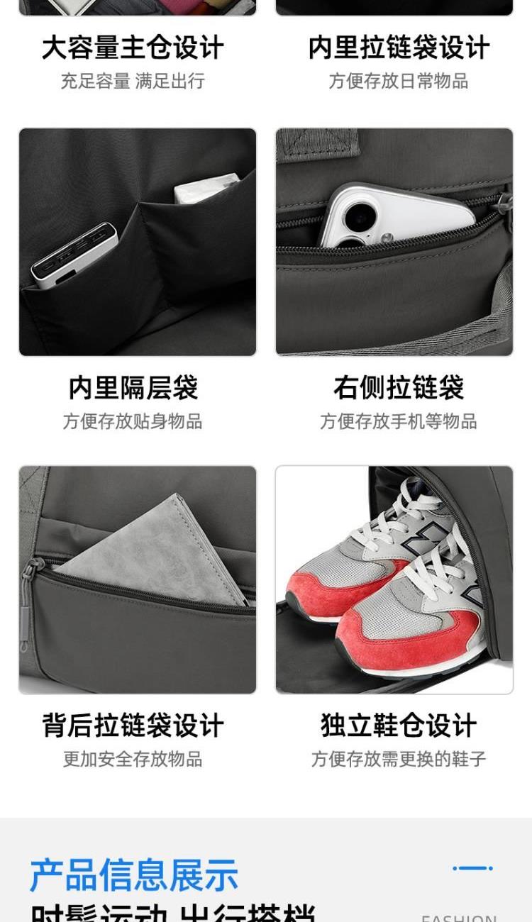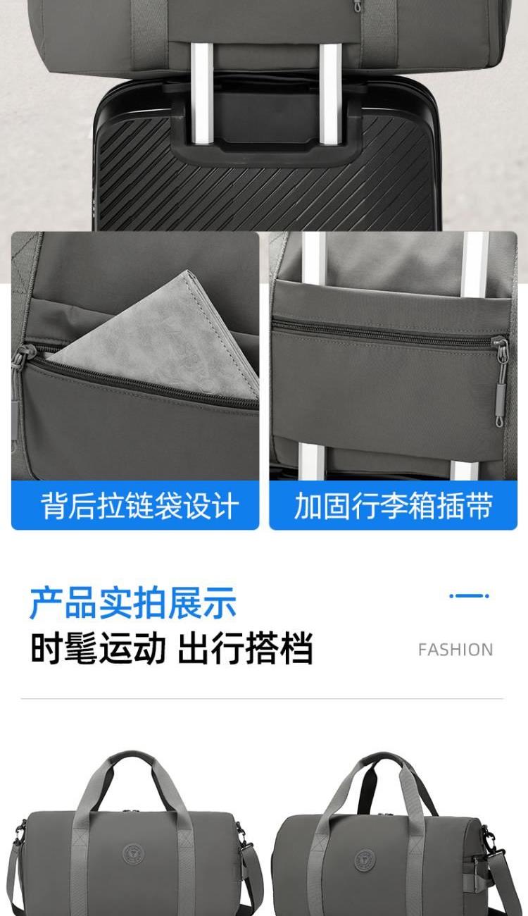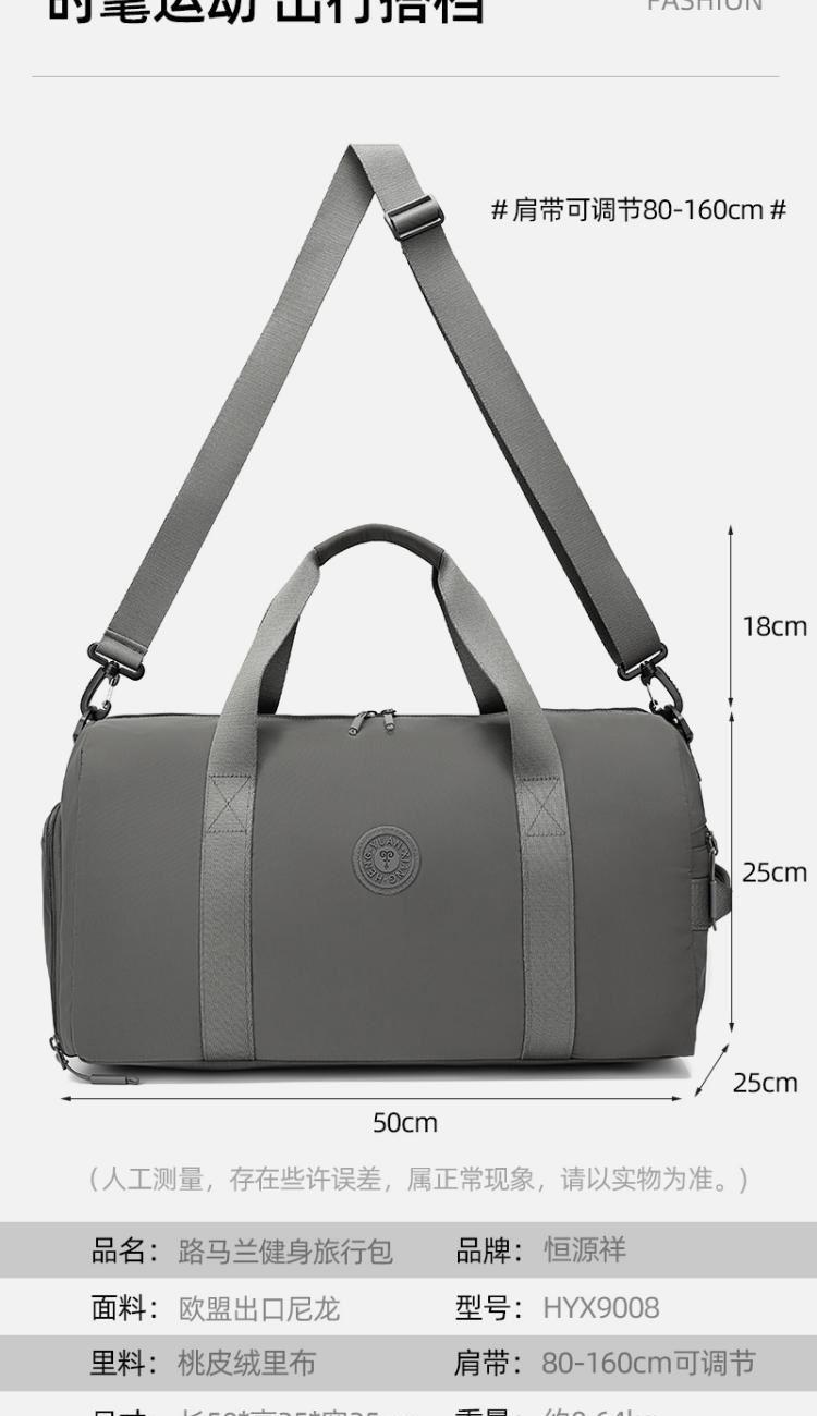 产品型号:HYX9008 产品重量:0.64kg 产品规格:50*25*25cm 产品颜色:深灰色 产品卖点:优选欧美出口畅销防水尼龙材质,时尚、结实; 全配色设计,美观大方; 桃皮绒里布材质 ,柔软,细腻; 干湿分离袋,多场景应用; 独立鞋仓,收纳更方便; 拉杆插兜,出行更便捷。