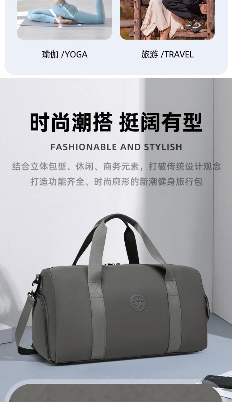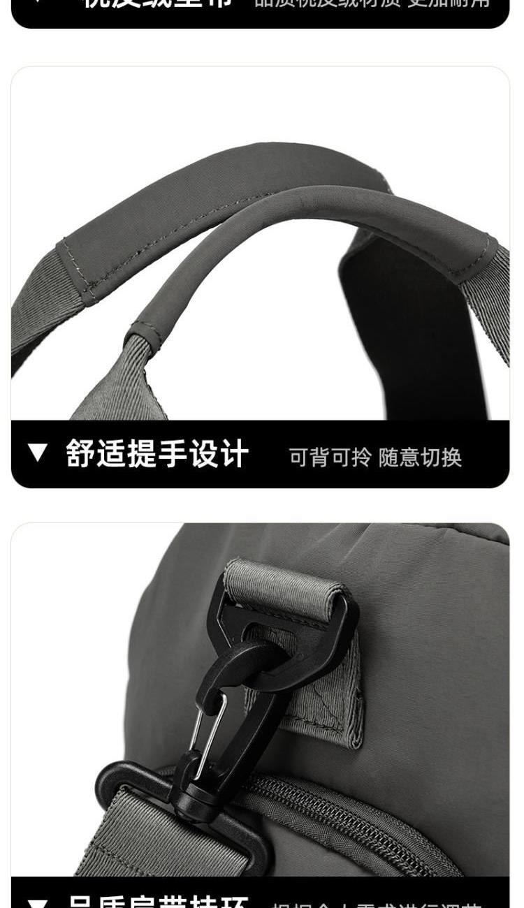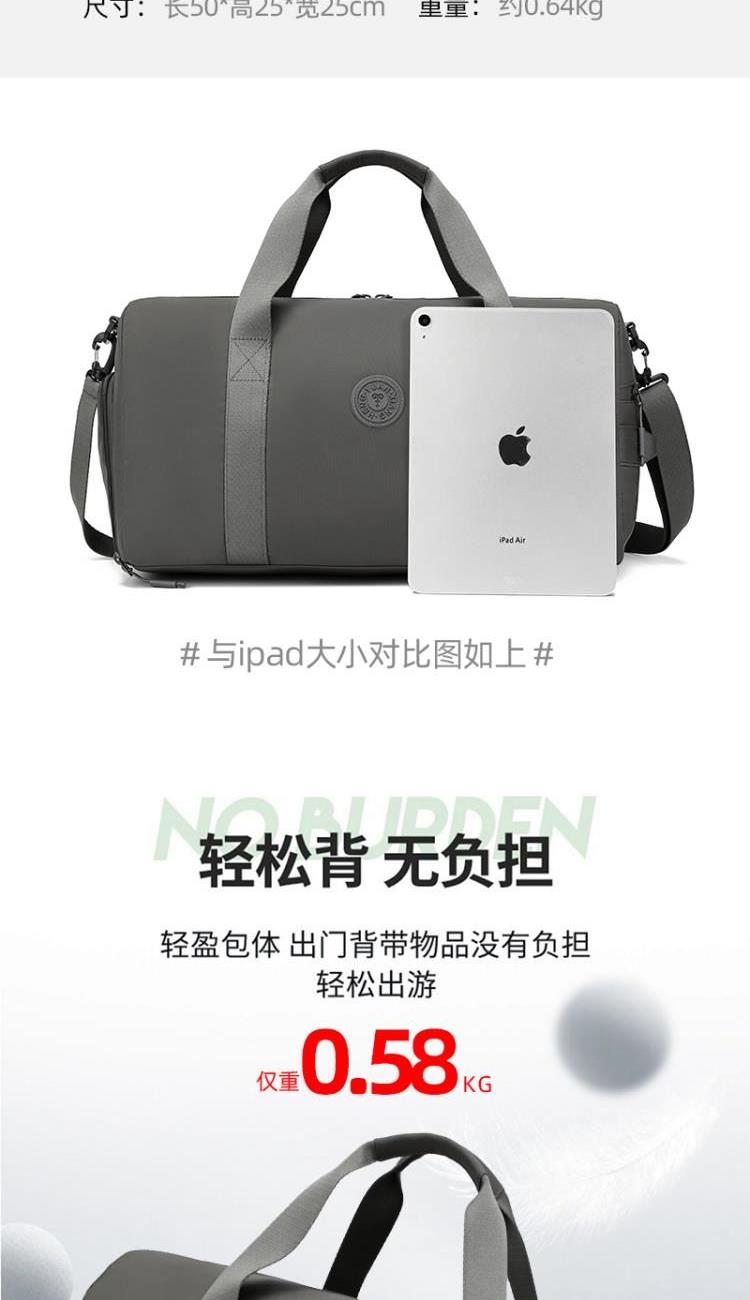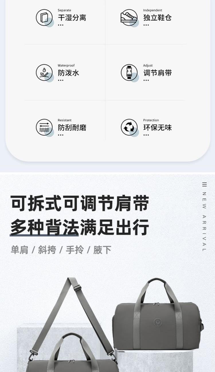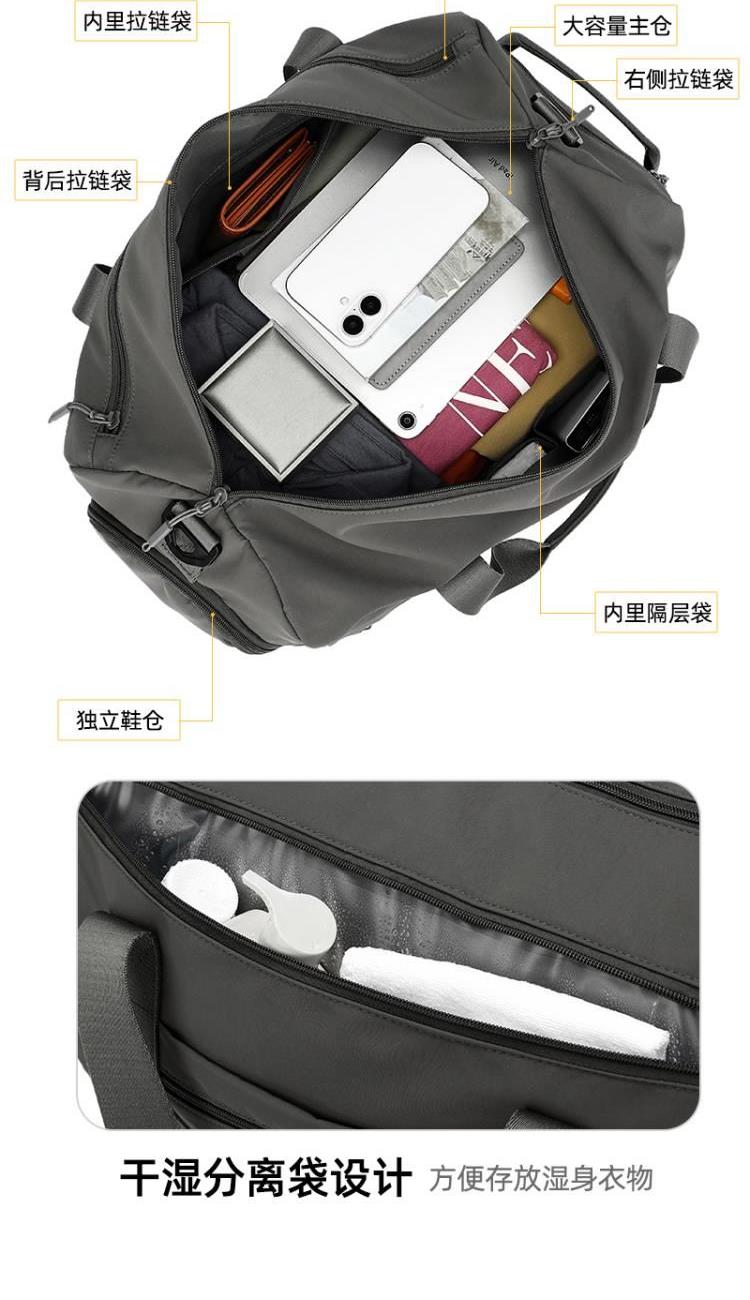 产品型号:HYX9008 产品重量:0.64kg 产品规格:50*25*25cm 产品颜色:深灰色 产品卖点:优选欧美出口畅销防水尼龙材质,时尚、结实; 全配色设计,美观大方; 桃皮绒里布材质 ,柔软,细腻; 干湿分离袋,多场景应用; 独立鞋仓,收纳更方便; 拉杆插兜,出行更便捷。